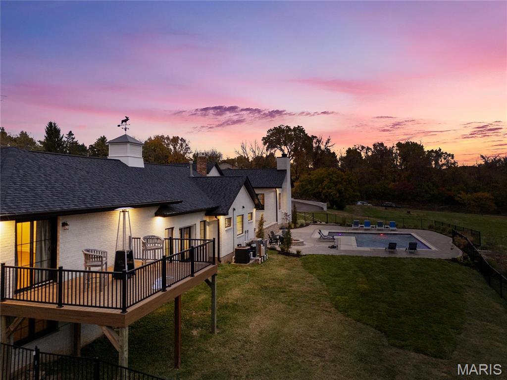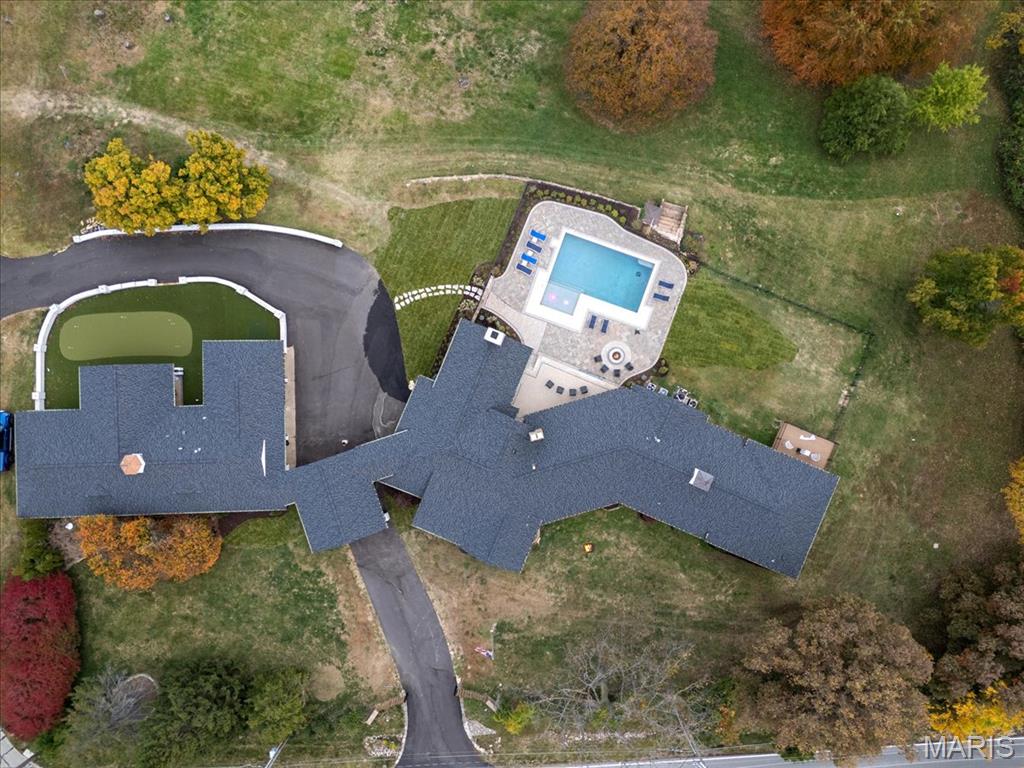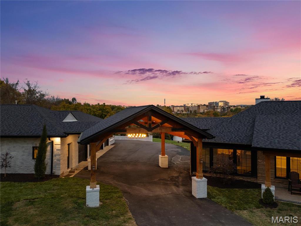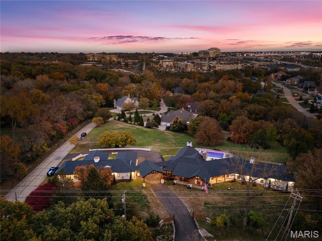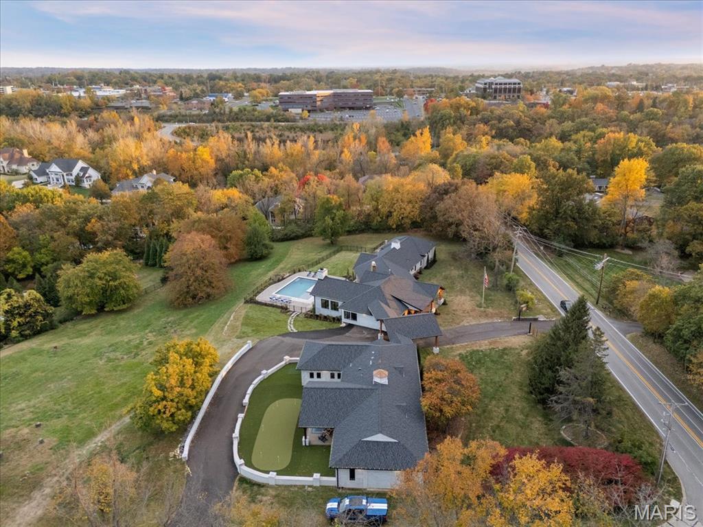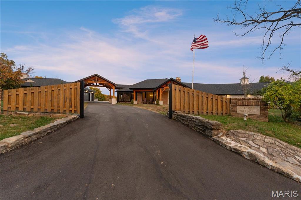 Welcome to 1824 Topping Rd - A luxurious private retreat. Perched overlooking a valley with incredible views, this distinct one-of-a-kind estate blends modern elegance with rustic charm. With nearly 7,200 sqft, this home offers expansive yet intimate living spaces designed for both entertaining and everyday comfort. The main residence features an open floor plan, a gourmet kitchen with a custom pantry, a great room with soaring ceilings, a formal dining area, and a sunken living room leading to the resort-style pool deck. The primary suite is a serene escape with a spa-like en suite bath, soaking tub, walk-in shower, and custom walk-in closet. A private guest house offers a full kitchen, living room, bedroom with en-suite bath, gym, and a covered patio with a putting green. A third living space/rec room provides flexibility, with another separate living suite above. Set on 1.4 expansive acres, enjoy a luxury pool, 4-car garage, and more. Prime location offers access to the best of StL.
