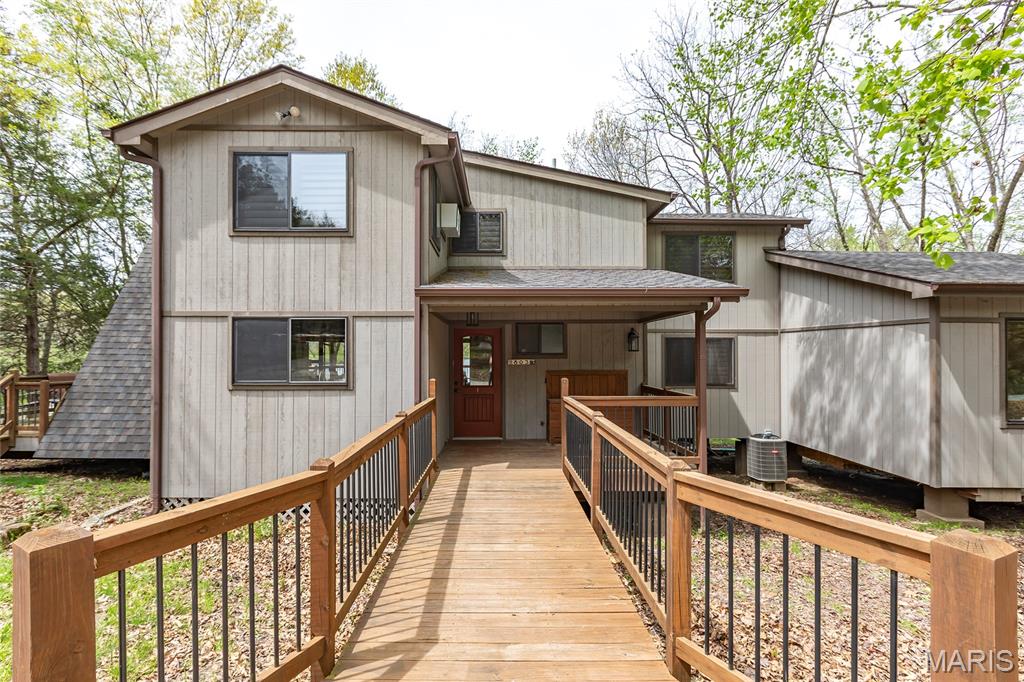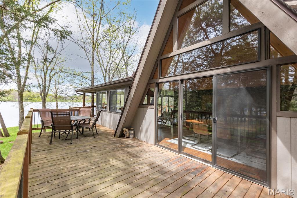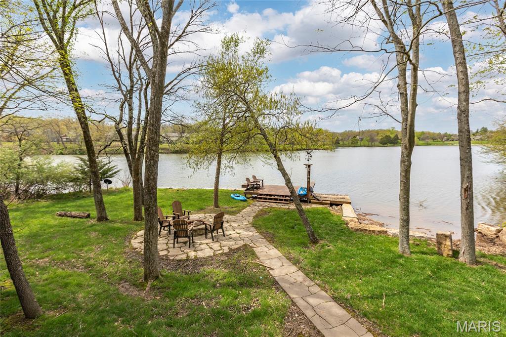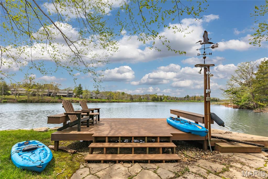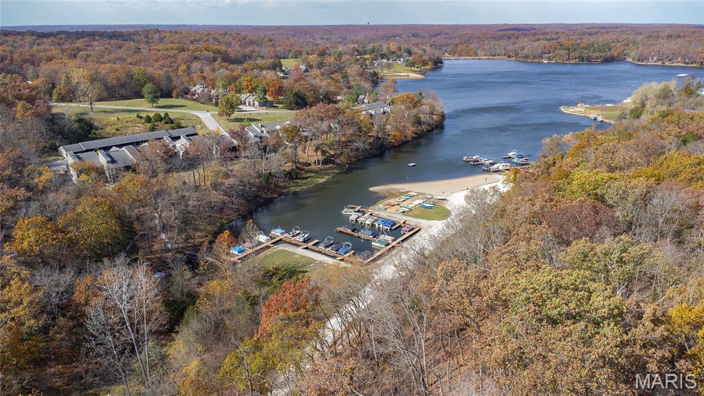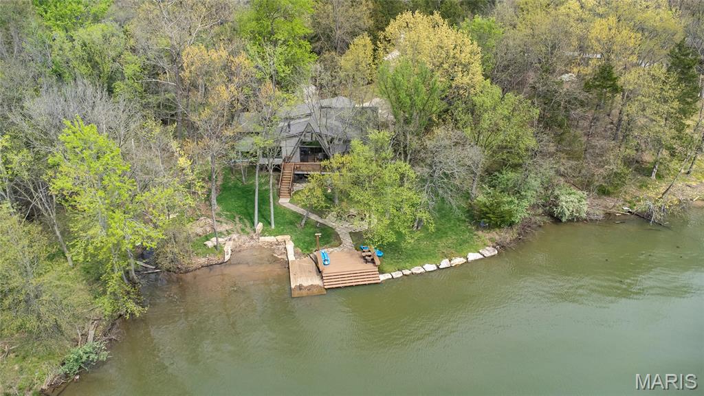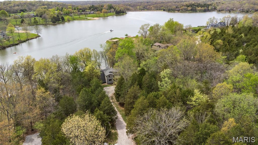 Welcome to 803 S Aspen Point Drive, a charming retreat nestled on the picturesque shore of Lake Aspen! With over 125’ of shoreline & grassy level lot, this reclusive retreat will have you feel worlds away while being just a short drive from the greater St. Louis area! This beautiful chalet offers a perfect blend of modern comfort & rustic charm! Inviting open floor plan featuring a spacious Living Room with vaulted ceilings & cozy stone fireplace, perfect for relaxing or entertaining. Kitchen is designed for both function & style, with sleek granite countertops, ample cabinetry & modern appliances—ideal for hosting family & friends. Main Level Primary Suite is a true oasis, offering a peaceful retreat with large windows that allow for stunning views. Outside finds expansive wrap-around deck, covered porch and firepit, ideal for enjoying the fresh air & natural beauty of the area. The wooded lot offers plenty of privacy, while still being just moments away from Innsbrook amenities!
