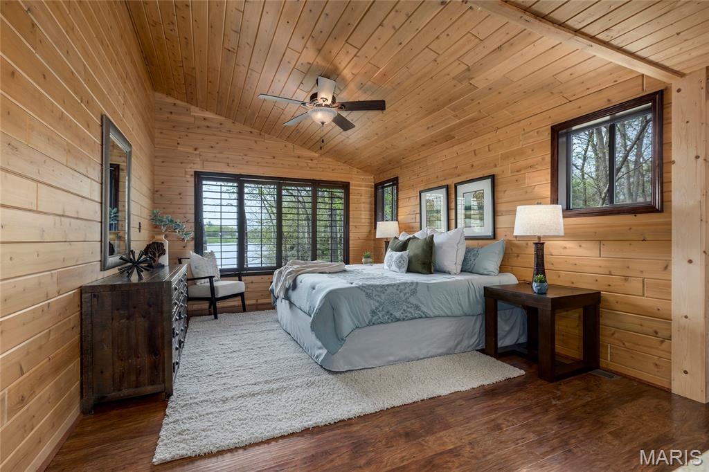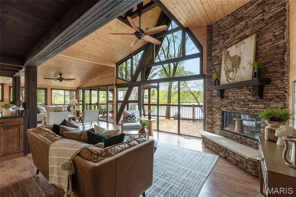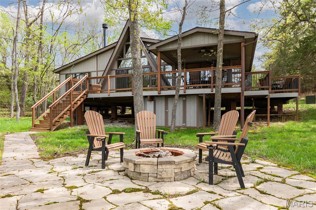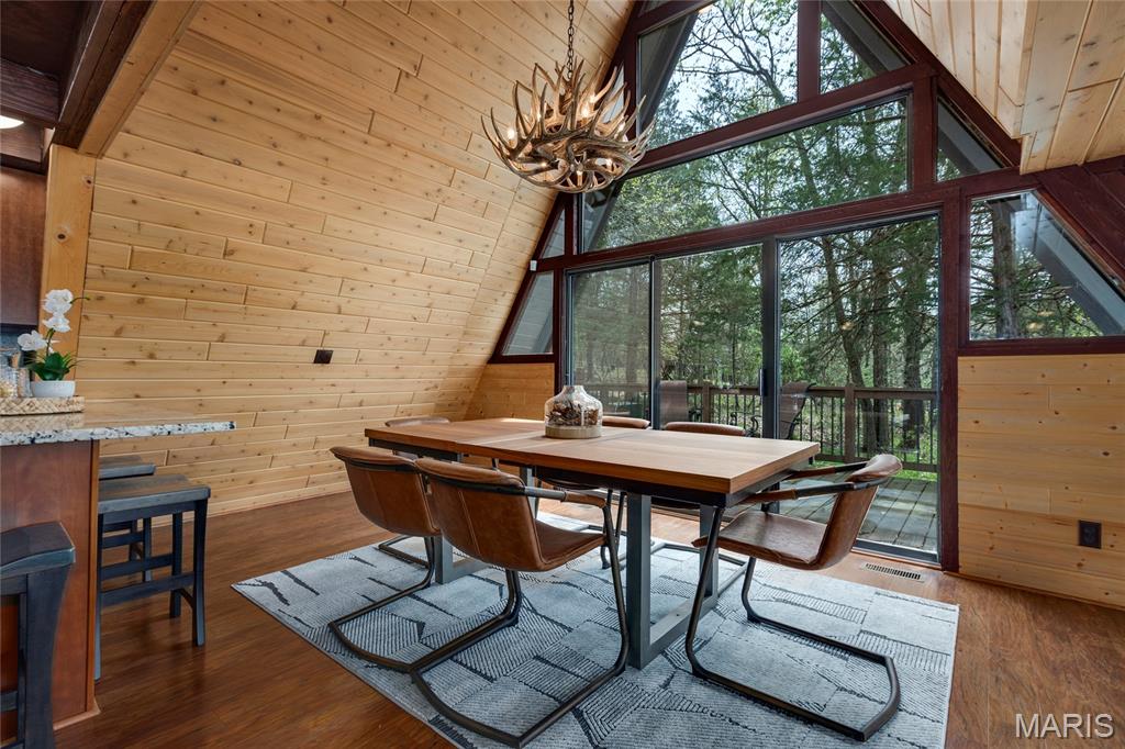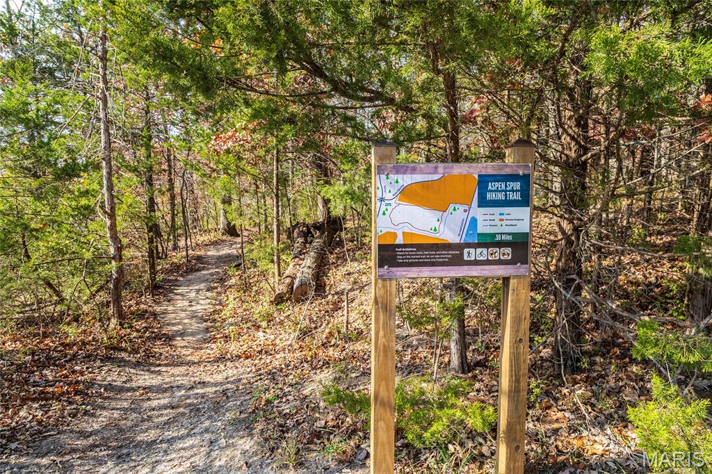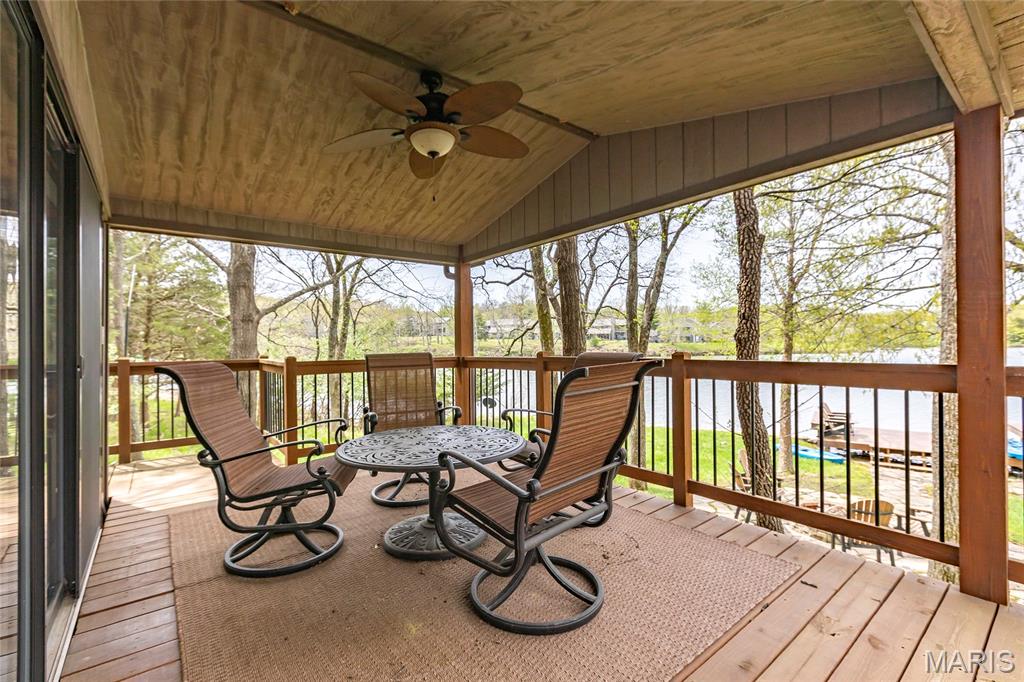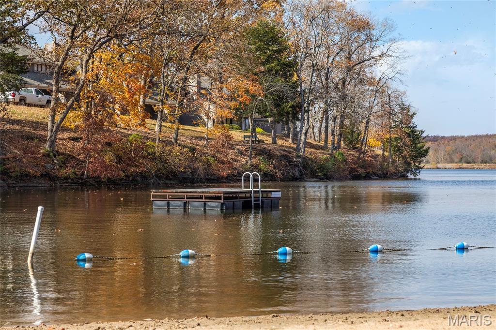 Welcome to 803 S Aspen Point Drive, a charming retreat nestled on the picturesque shore of Lake Aspen! With over 125’ of shoreline & grassy level lot, this reclusive retreat will have you feel worlds away while being just a short drive from the greater St. Louis area! This beautiful chalet offers a perfect blend of modern comfort & rustic charm! Inviting open floor plan featuring a spacious Living Room with vaulted ceilings & cozy stone fireplace, perfect for relaxing or entertaining. Kitchen is designed for both function & style, with sleek granite countertops, ample cabinetry & modern appliances—ideal for hosting family & friends. Main Level Primary Suite is a true oasis, offering a peaceful retreat with large windows that allow for stunning views. Outside finds expansive wrap-around deck, covered porch and firepit, ideal for enjoying the fresh air & natural beauty of the area. The wooded lot offers plenty of privacy, while still being just moments away from Innsbrook amenities!