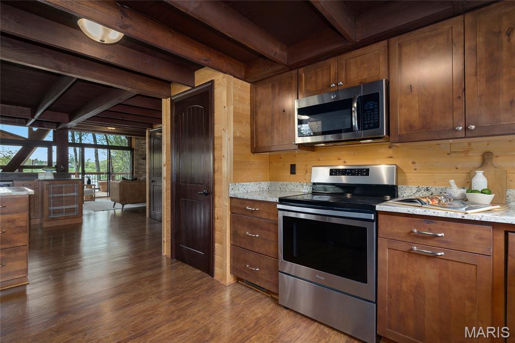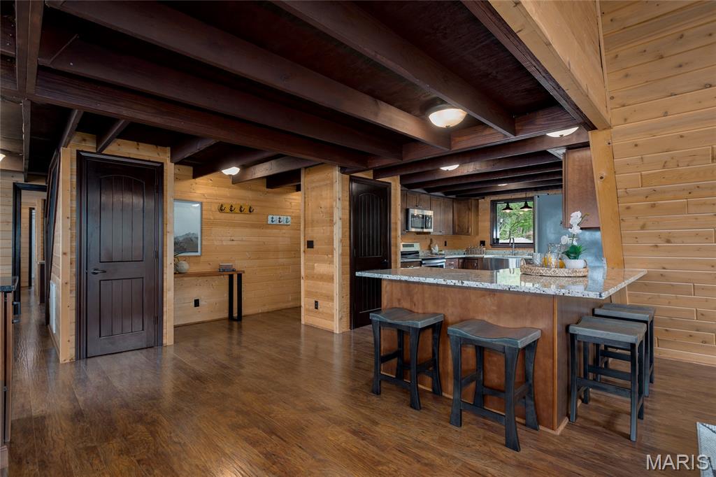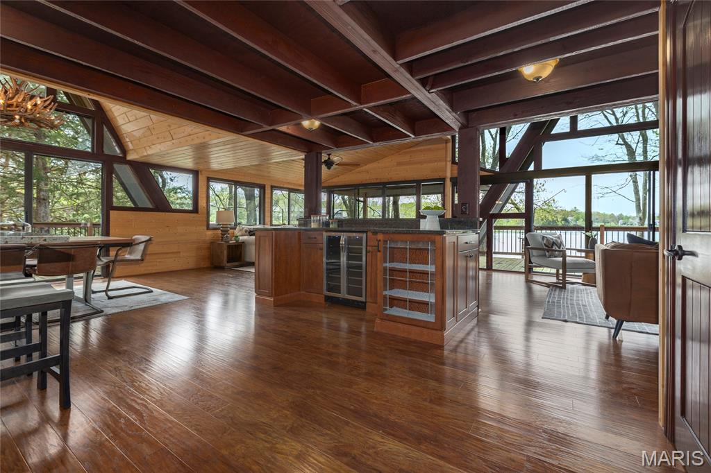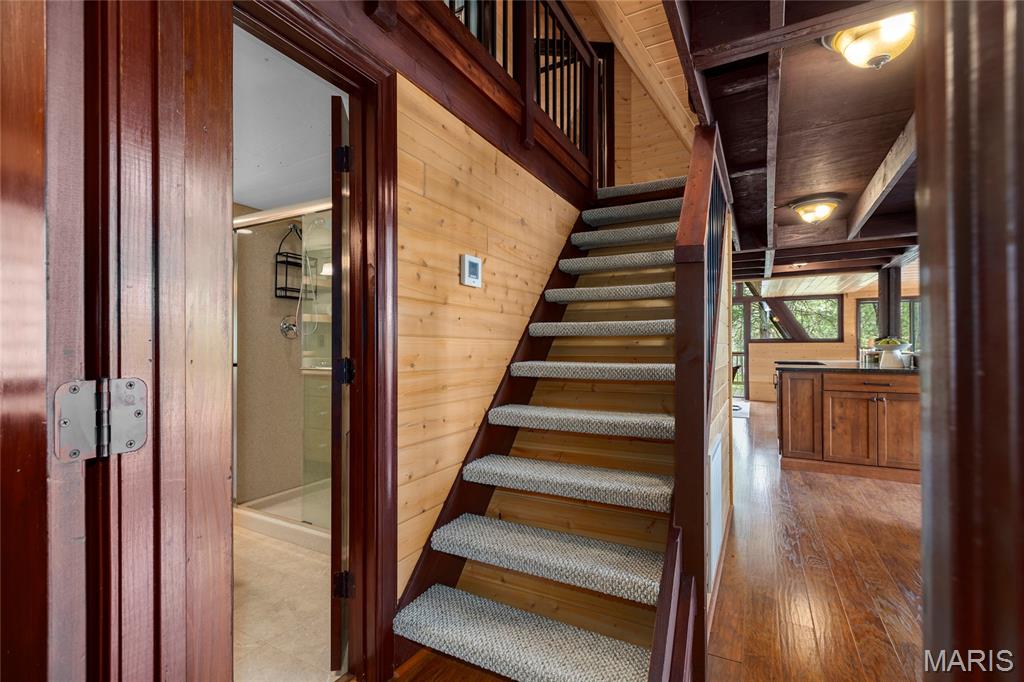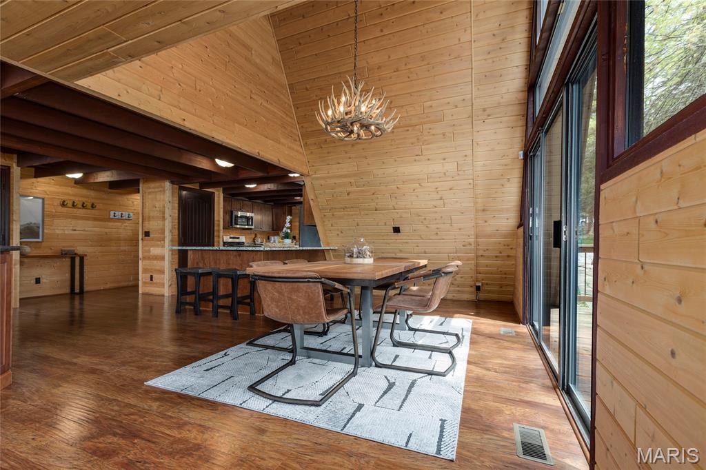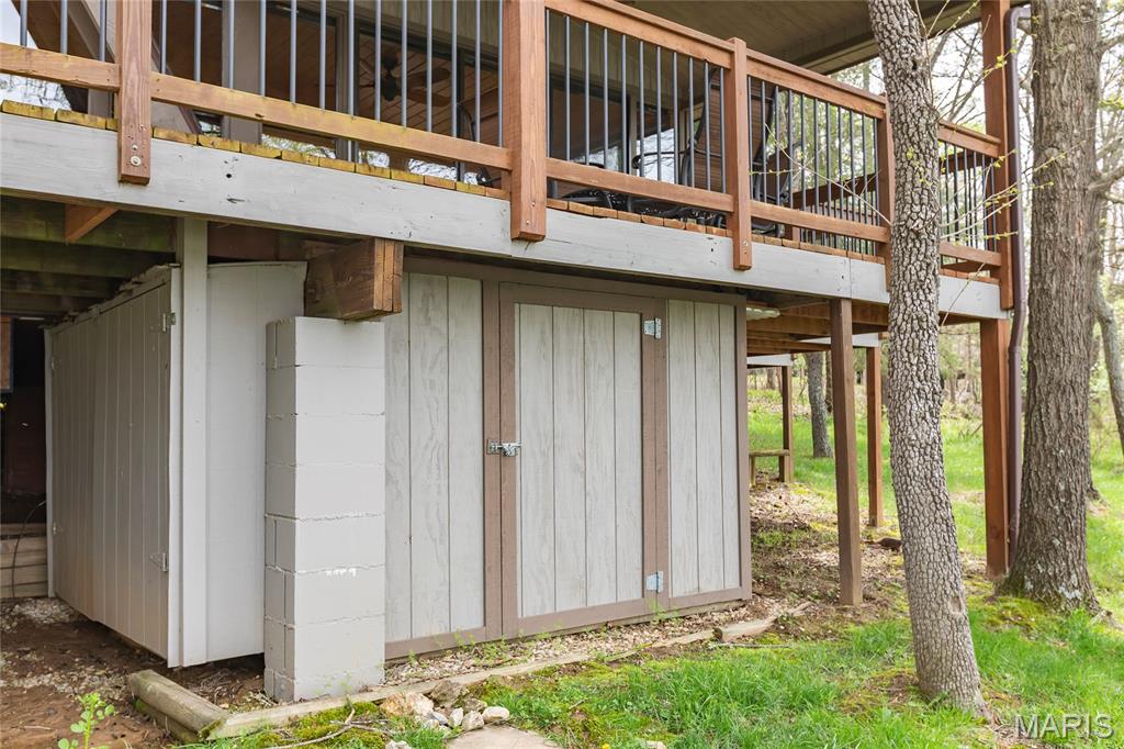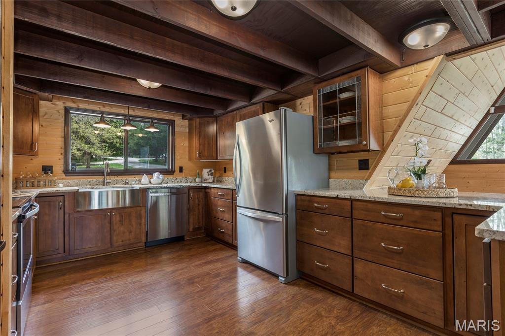 Welcome to 803 S Aspen Point Drive, a charming retreat nestled on the picturesque shore of Lake Aspen! With over 125’ of shoreline & grassy level lot, this reclusive retreat will have you feel worlds away while being just a short drive from the greater St. Louis area! This beautiful chalet offers a perfect blend of modern comfort & rustic charm! Inviting open floor plan featuring a spacious Living Room with vaulted ceilings & cozy stone fireplace, perfect for relaxing or entertaining. Kitchen is designed for both function & style, with sleek granite countertops, ample cabinetry & modern appliances—ideal for hosting family & friends. Main Level Primary Suite is a true oasis, offering a peaceful retreat with large windows that allow for stunning views. Outside finds expansive wrap-around deck, covered porch and firepit, ideal for enjoying the fresh air & natural beauty of the area. The wooded lot offers plenty of privacy, while still being just moments away from Innsbrook amenities!