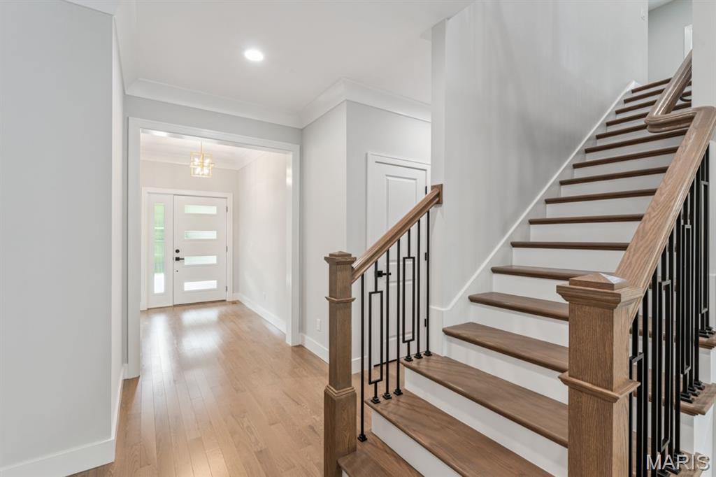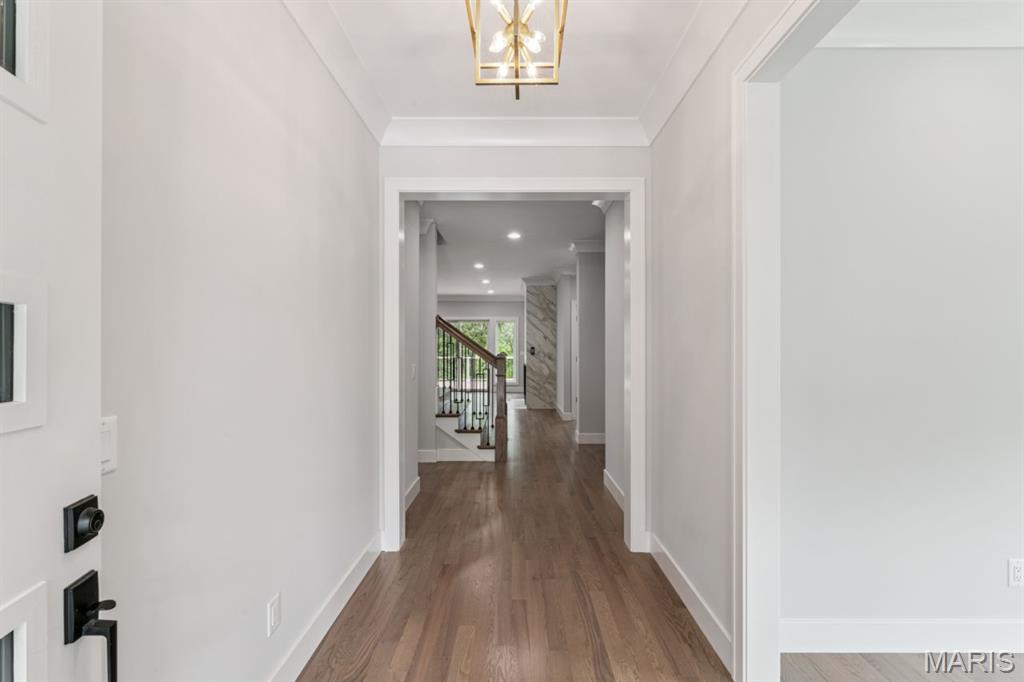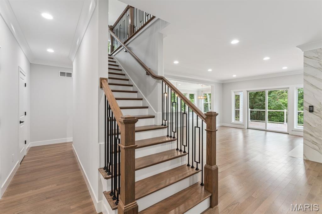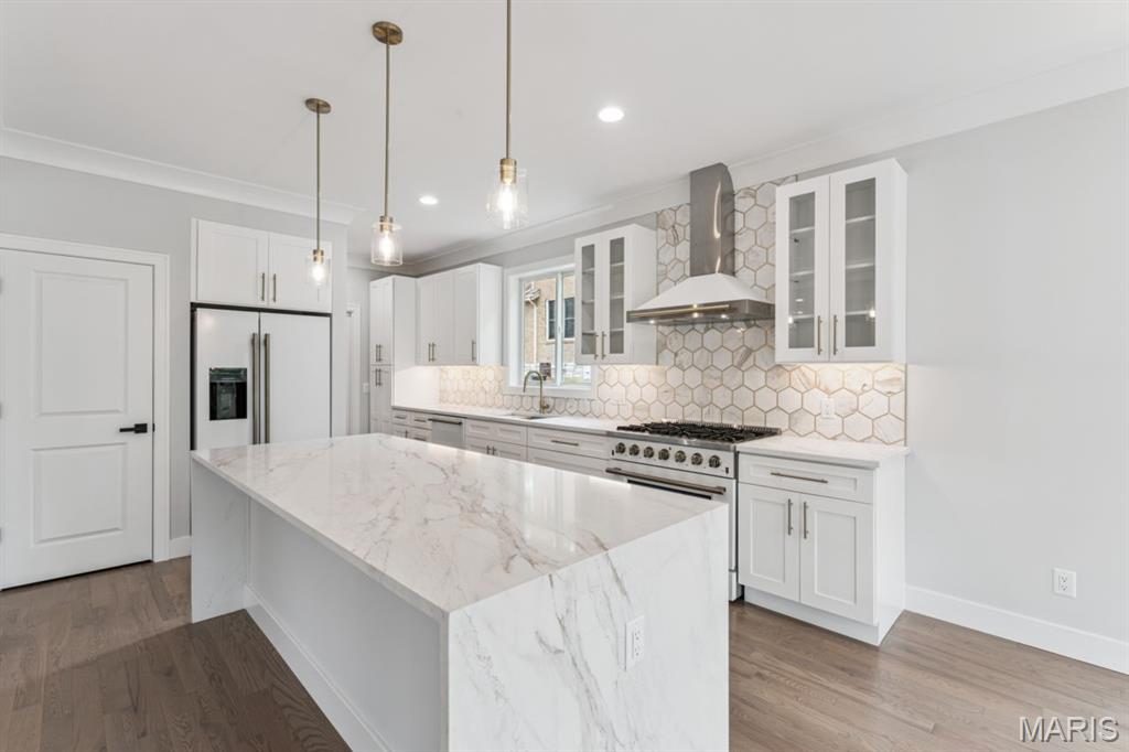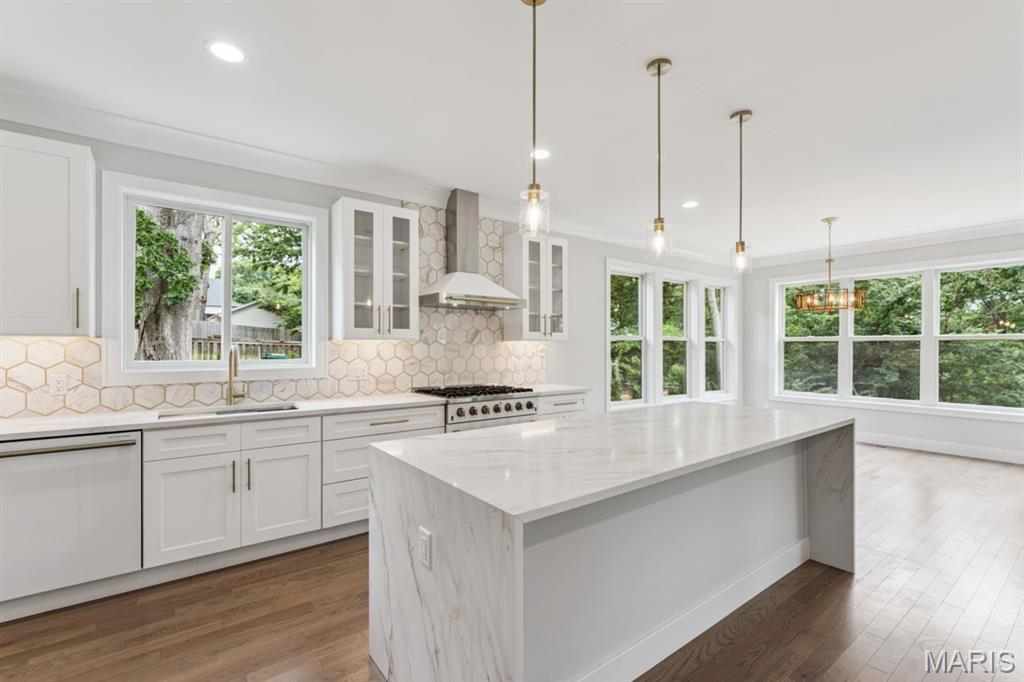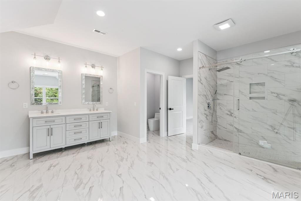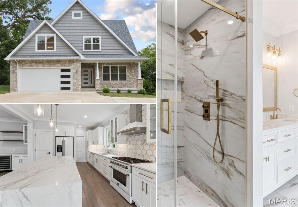 Rare opportunity to own a custom new construction luxury home in Sunset Hills! This 5-bed, 5-bath stunner blends elevated design with exceptional style in Lindbergh Schools. The open-concept main floor features hardwoods and crown molding throughout, a sunlit office off the entry, a spacious living room with impressive marble-slab gas fireplace and access to a deck with custom railing, overlooking woods. The show-stopping kitchen offers quartz counters, marble backsplash, huge island with waterfall edge & built-in microwave, pantry, built-in buffet with beverage cooler & lovely window-lined dining room. This layout is optimized for entertaining! A floor-to-ceiling tiled powder room & large mudroom/laundry add function & flair. The main-level primary suite is pure retreat—heated marble floors, soaking tub, separate shower, double vanity, brass fixtures, & custom walk-in closet. Custom railed stairs lead to 2nd floor & generous family room. A large second primary suite has a massive spa-worthy bath - heated floors, soaking tub, separate luxe shower. Two more oversized bedrooms, full bath, & another laundry room complete level. The finished lower level walk-out has access to covered patio & boasts tall ceilings, LVP flooring, spacious rec room w/wet bar & beverage cooler. A comfortable bedroom with full bath is ideal for visitors or extended stays. From top to bottom, no detail has been overlooked in this one-of-a-kind home—designed to impress & crafted for modern living.