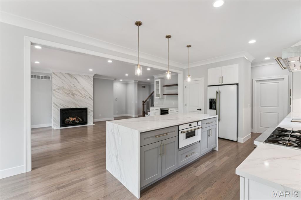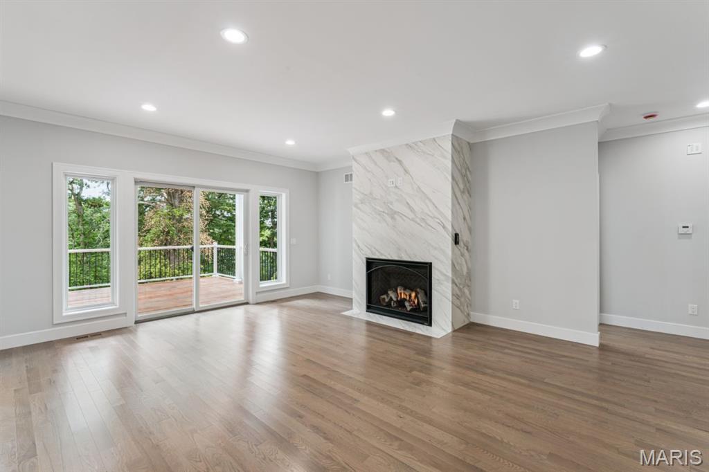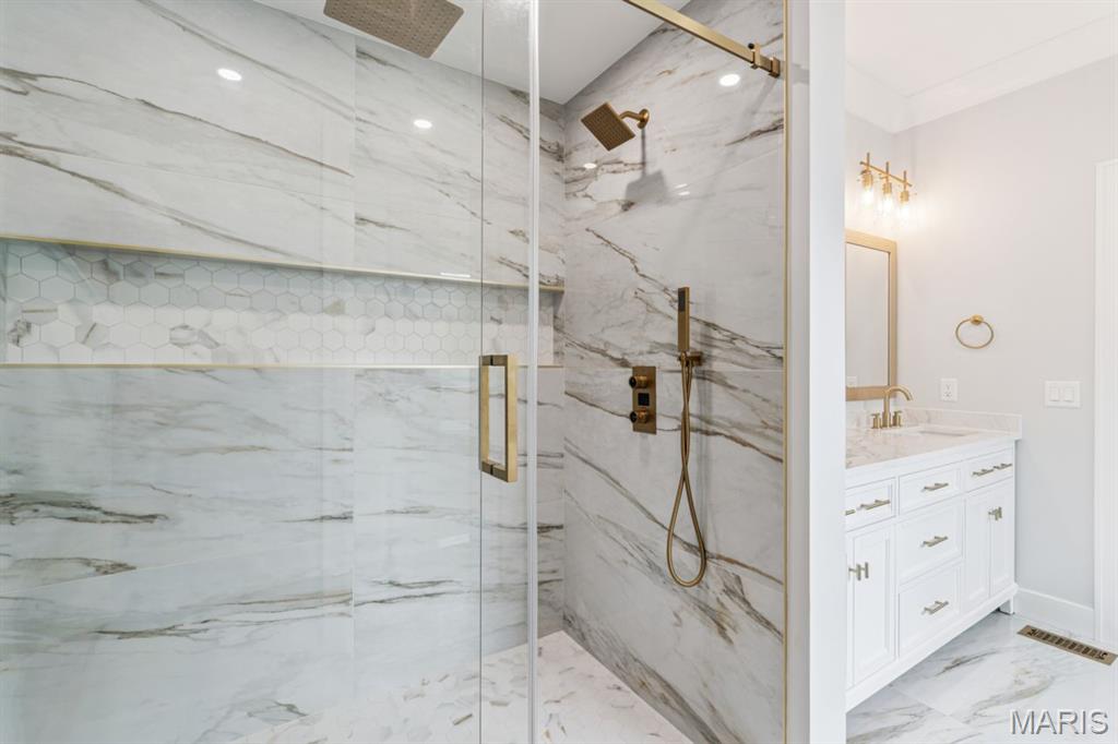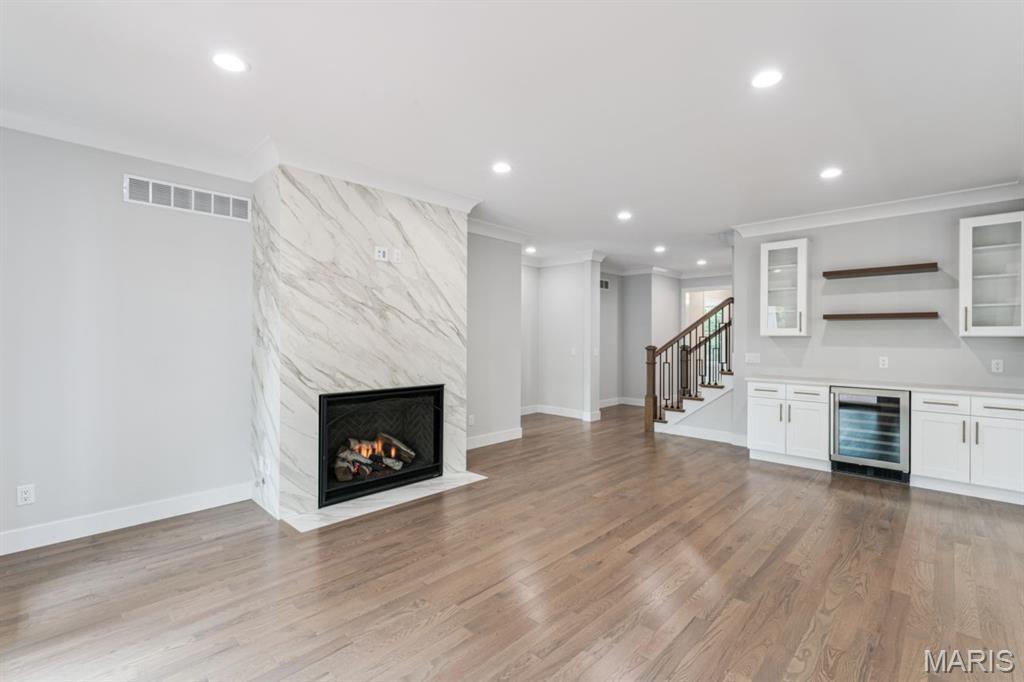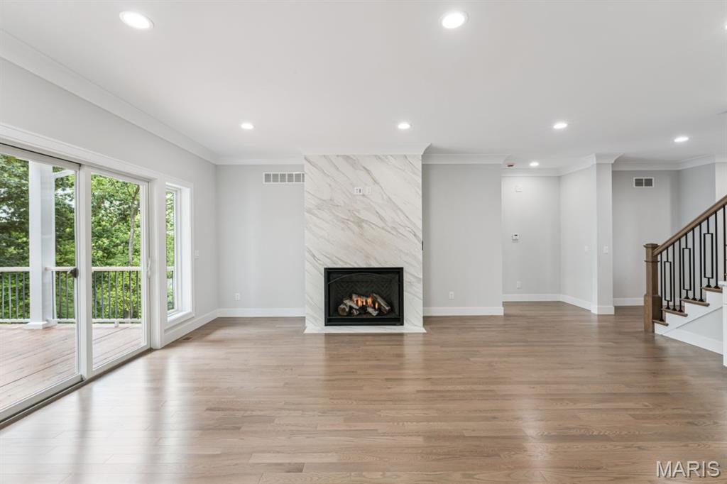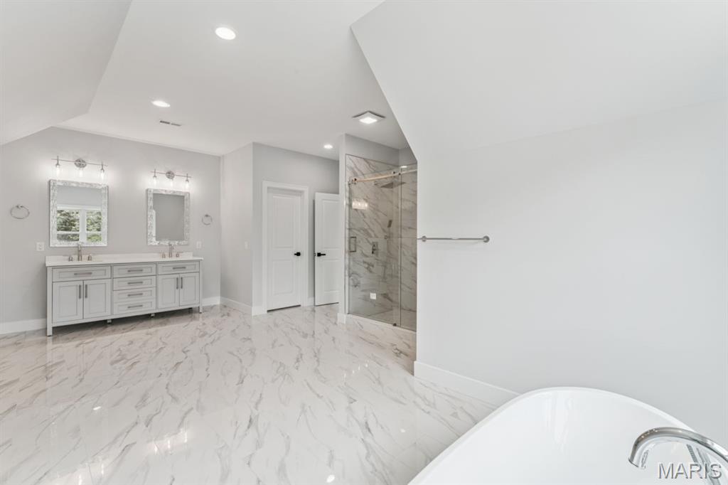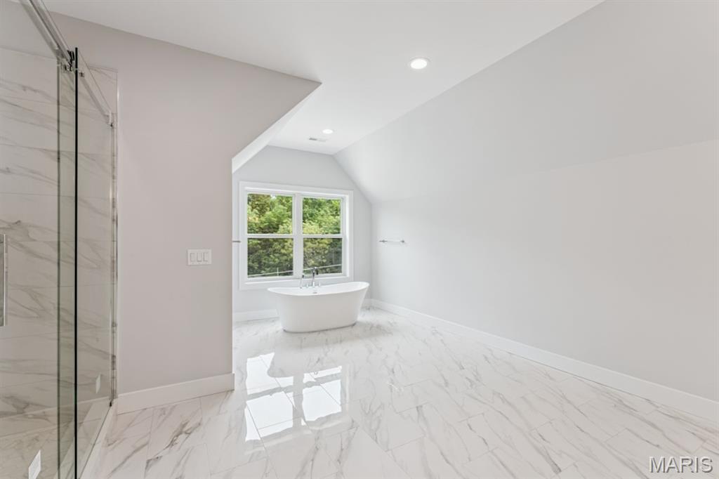 Rare opportunity to own a custom new construction luxury home in Sunset Hills! This 5-bed, 5-bath stunner blends elevated design with exceptional style in Lindbergh Schools. The open-concept main floor features hardwoods and crown molding throughout, a sunlit office off the entry, a spacious living room with impressive marble-slab gas fireplace and access to a deck with custom railing, overlooking woods. The show-stopping kitchen offers quartz counters, marble backsplash, huge island with waterfall edge & built-in microwave, pantry, built-in buffet with beverage cooler & lovely window-lined dining room. This layout is optimized for entertaining! A floor-to-ceiling tiled powder room & large mudroom/laundry add function & flair. The main-level primary suite is pure retreat—heated marble floors, soaking tub, separate shower, double vanity, brass fixtures, & custom walk-in closet. Custom railed stairs lead to 2nd floor & generous family room. A large second primary suite has a massive spa-worthy bath - heated floors, soaking tub, separate luxe shower. Two more oversized bedrooms, full bath, & another laundry room complete level. The finished lower level walk-out has access to covered patio & boasts tall ceilings, LVP flooring, spacious rec room w/wet bar & beverage cooler. A comfortable bedroom with full bath is ideal for visitors or extended stays. From top to bottom, no detail has been overlooked in this one-of-a-kind home—designed to impress & crafted for modern living.