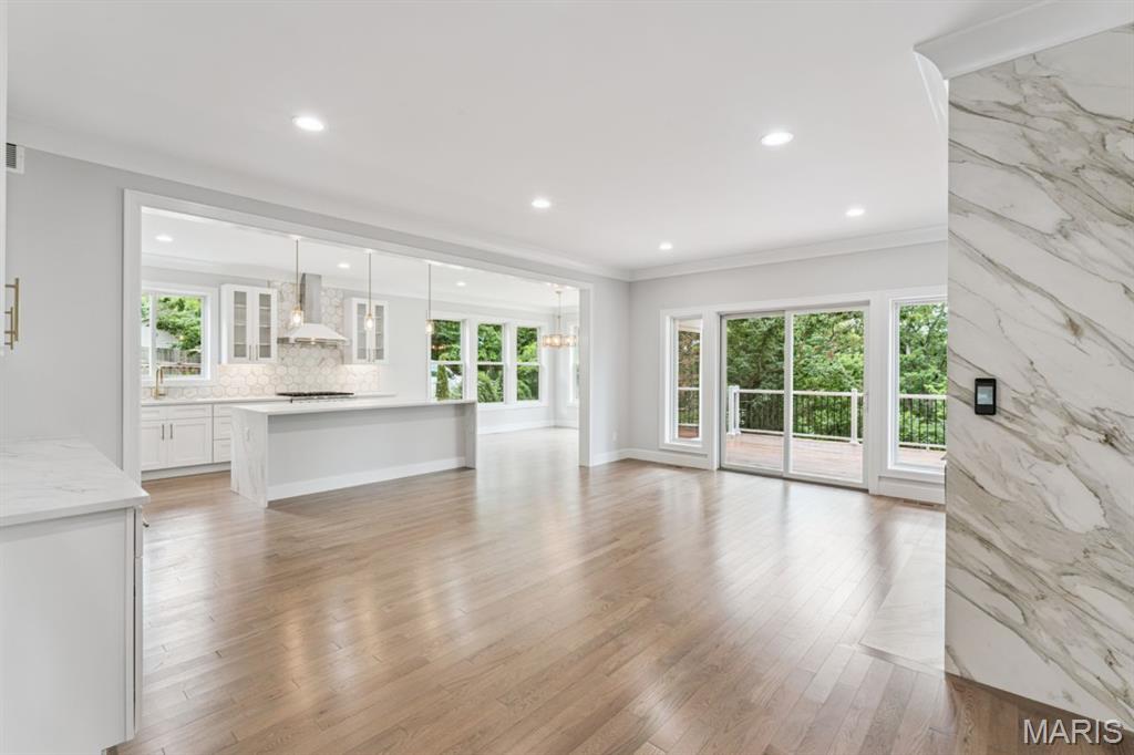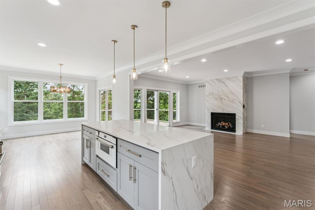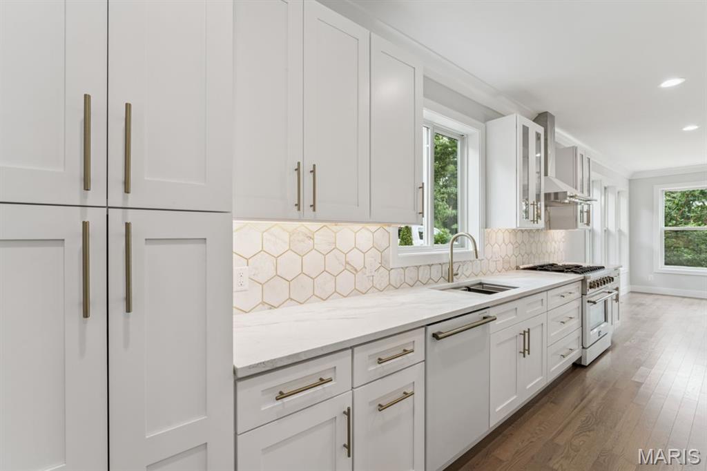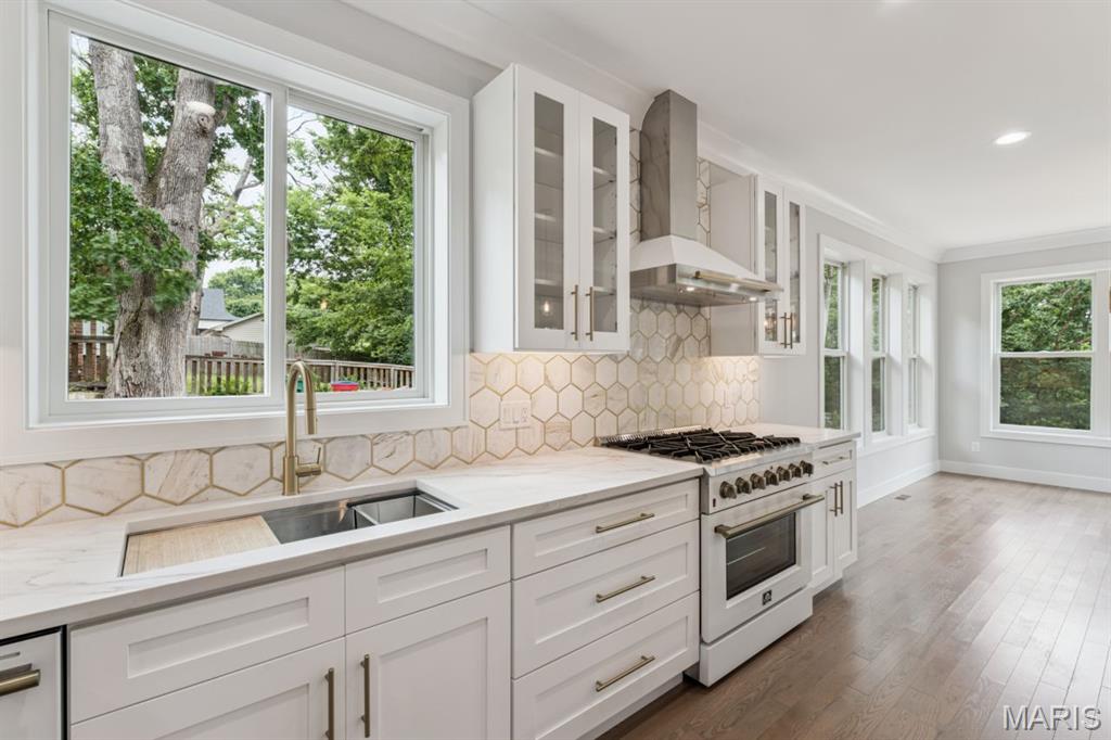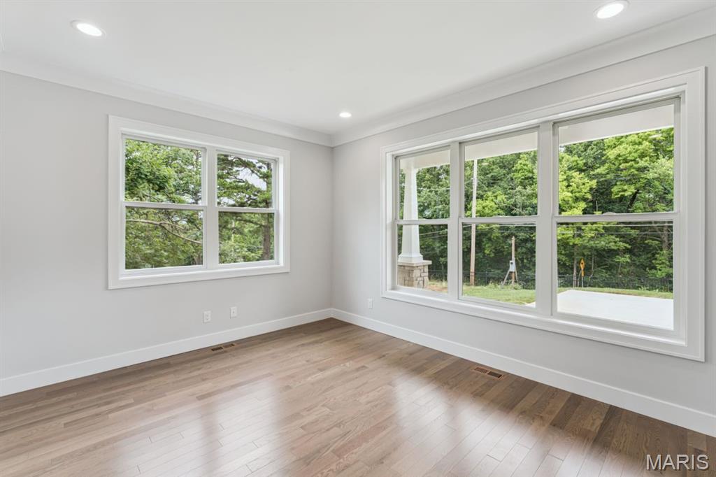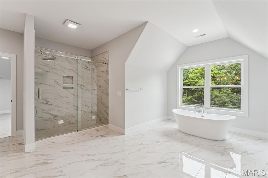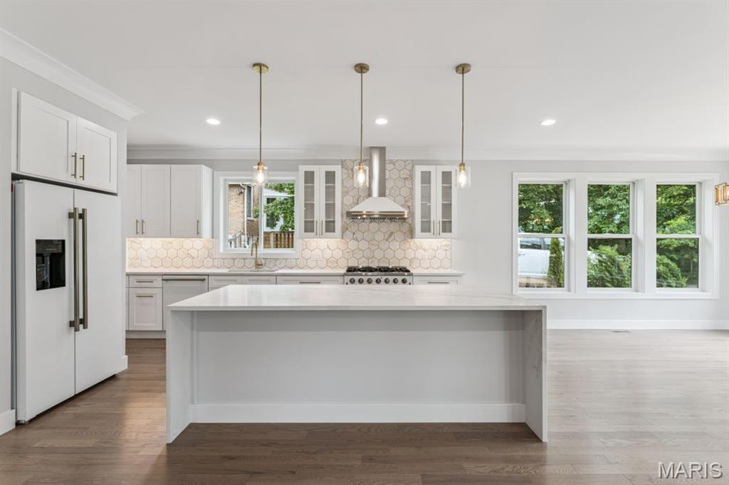 Rare opportunity to own a custom new construction luxury home in Sunset Hills! This 5-bed, 5-bath stunner blends elevated design with exceptional style in Lindbergh Schools. The open-concept main floor features hardwoods and crown molding throughout, a sunlit office off the entry, a spacious living room with impressive marble-slab gas fireplace and access to a deck with custom railing, overlooking woods. The show-stopping kitchen offers quartz counters, marble backsplash, huge island with waterfall edge & built-in microwave, pantry, built-in buffet with beverage cooler & lovely window-lined dining room. This layout is optimized for entertaining! A floor-to-ceiling tiled powder room & large mudroom/laundry add function & flair. The main-level primary suite is pure retreat—heated marble floors, soaking tub, separate shower, double vanity, brass fixtures, & custom walk-in closet. Custom railed stairs lead to 2nd floor & generous family room. A large second primary suite has a massive spa-worthy bath - heated floors, soaking tub, separate luxe shower. Two more oversized bedrooms, full bath, & another laundry room complete level. The finished lower level walk-out has access to covered patio & boasts tall ceilings, LVP flooring, spacious rec room w/wet bar & beverage cooler. A comfortable bedroom with full bath is ideal for visitors or extended stays. From top to bottom, no detail has been overlooked in this one-of-a-kind home—designed to impress & crafted for modern living.