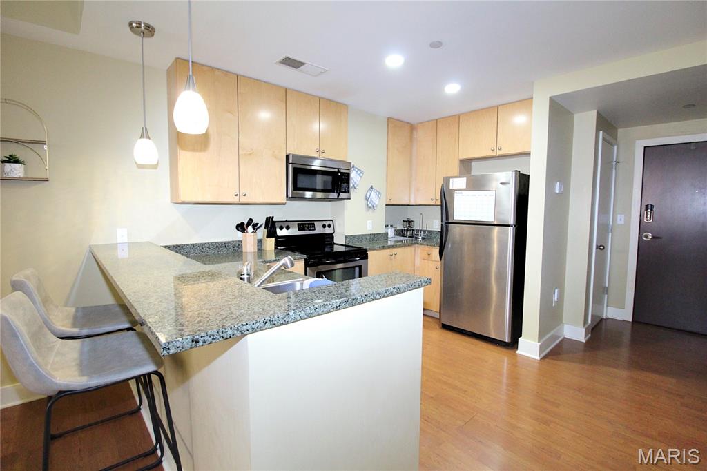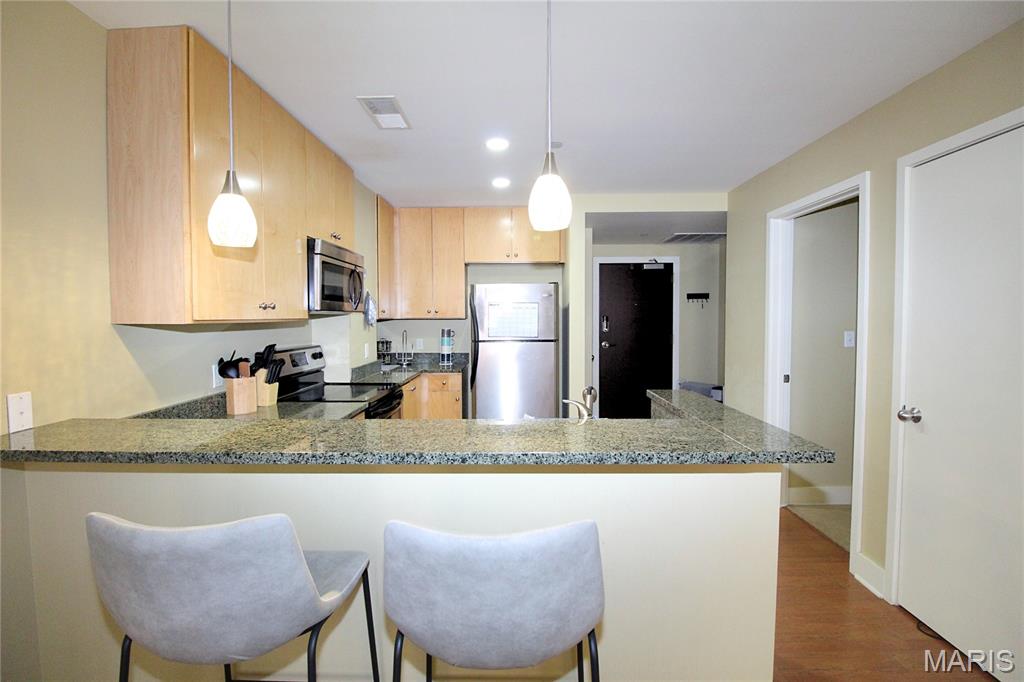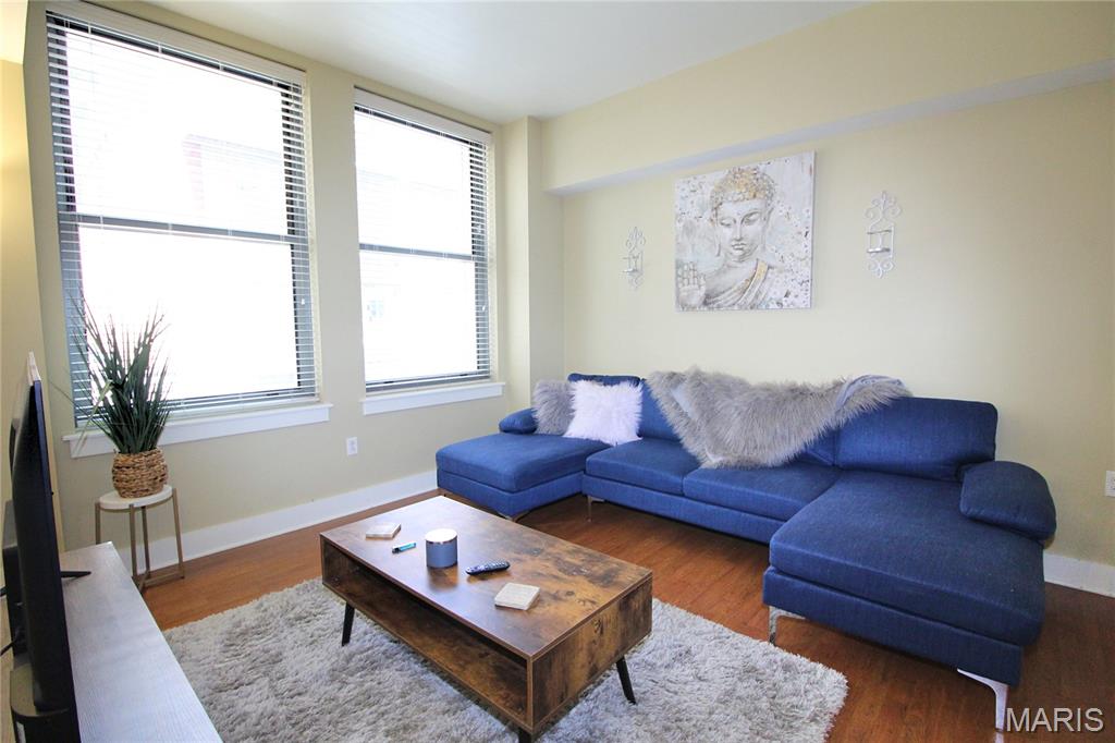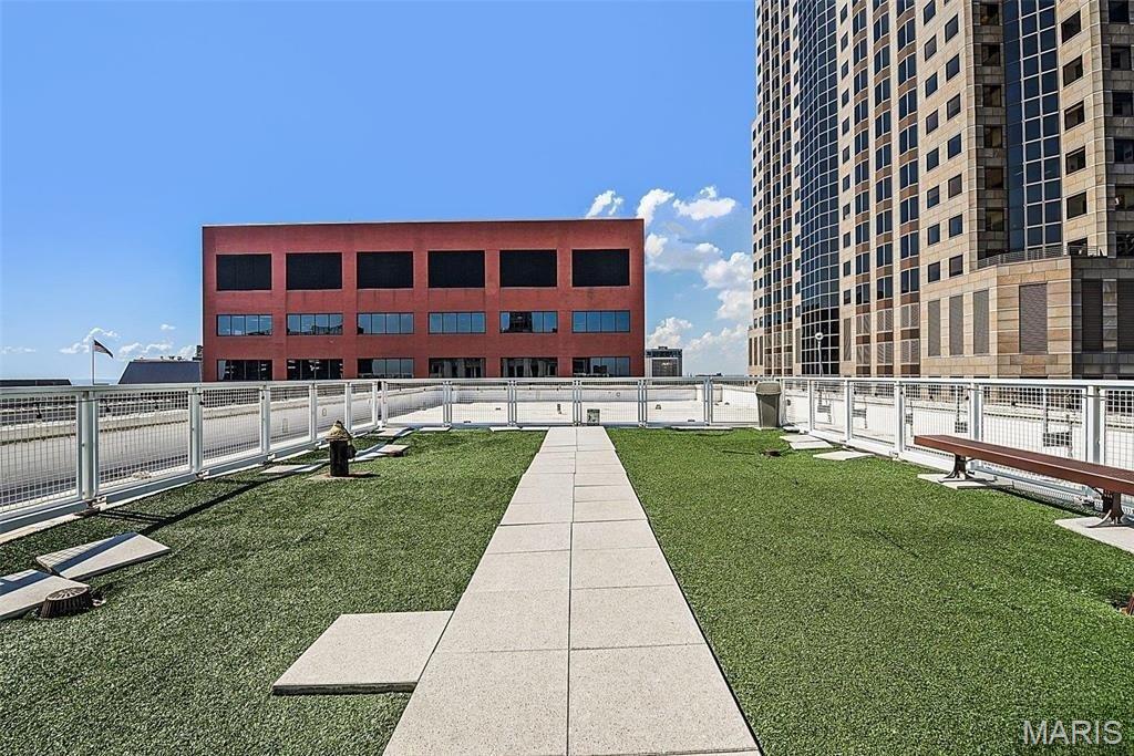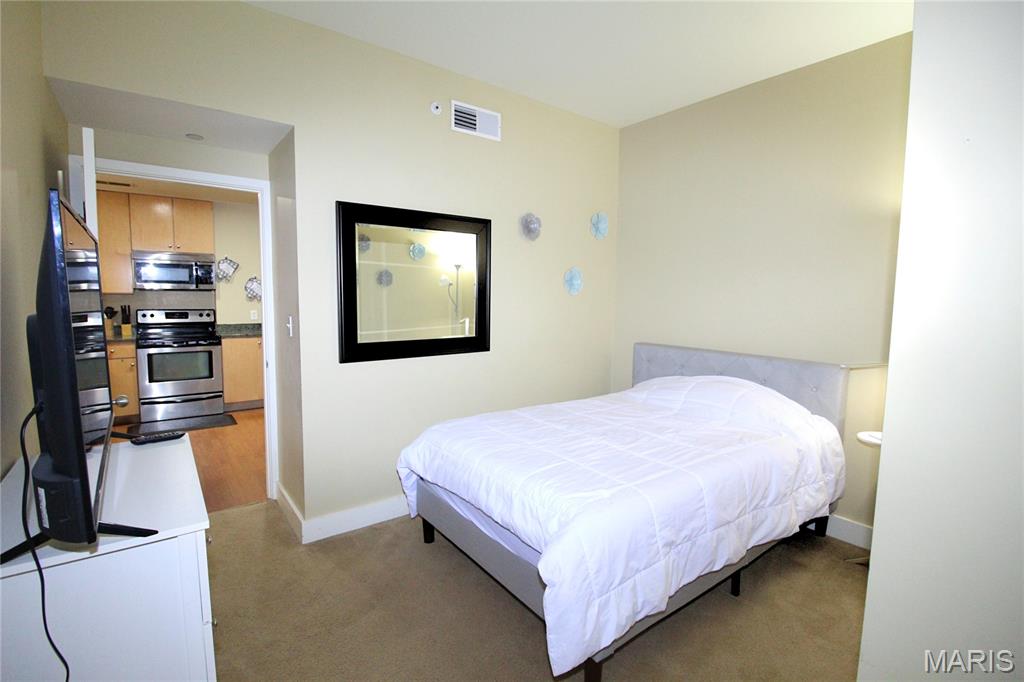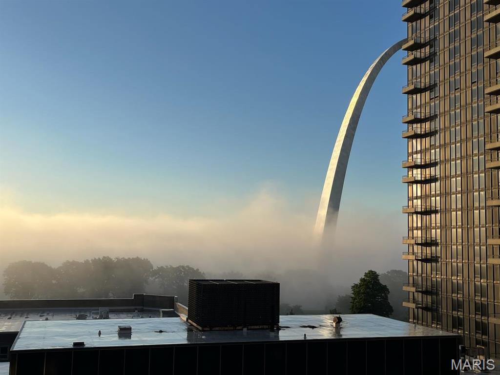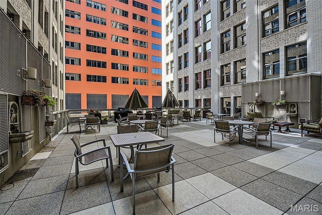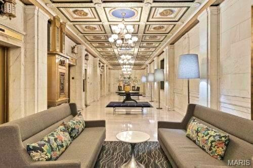 Welcome to refined city living at the iconic Marquette Building. This fully furnished 2-bedroom, 1-bath condo on the 6th floor combines historic grandeur with modern comfort. Soaring above the city, the open-concept living and dining area is bathed in natural light and offers breathtaking urban views through expansive windows. The kitchen is both stylish and functional, featuring granite countertops, stainless steel appliances, and a convenient breakfast bar—perfect for casual dining or entertaining. The spacious primary bedroom boasts a walk-in closet, while the second bedroom offers versatility as a guest room or private office. Additional features include in-unit laundry, dedicated storage, and one assigned parking space in the secure garage ($85/mo). Residents of the Marquette enjoy unmatched amenities: a grand lobby that echoes timeless elegance, rooftop pool and sun deck, a serene terrace dog park, community room, outdoor grills, doorman service, and elevator access—all nestled in the heart of downtown St. Louis. Live where classic charm meets contemporary convenience. Schedule your private showing today.