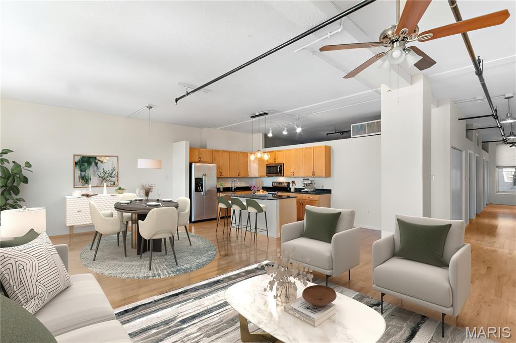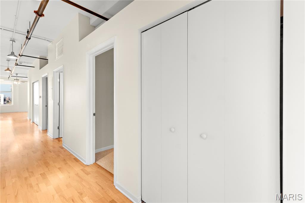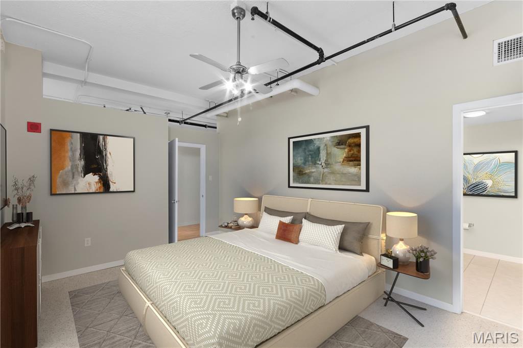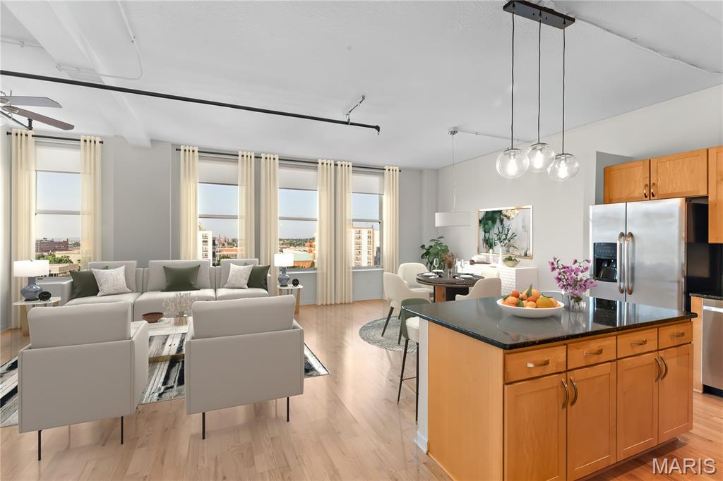 Indulge yourself in this contemporary and spacious 2 bed, 2 bath loft in the vibrant Downtown Loft District. Located on the 9th floor of Terra Cotta Lofts, this stylish and comfortable home features an art-worthy gallery hallway, open floor plan, high ceilings, and warm wood floors. Large windows offer stunning southern city views. The kitchen includes granite counters, maple cabinets, stainless appliances, and a center island with breakfast bar. The primary suite and second bedroom both offer generous double closets. A full-size stacked washer/dryer is included in the in-unit laundry room. The Terra Cotta Lofts is just steps from all downtown has to offer, including CITYPARK, home of St. Louis CITY SC and. Sale includes 1 deeded garage parking space #101 (located at 1523 Locust Street #101, St. Louis, MO 63103). The parking space has a separate quarterly condo fee of $275. THIS CONDO IS A MUST SEE!