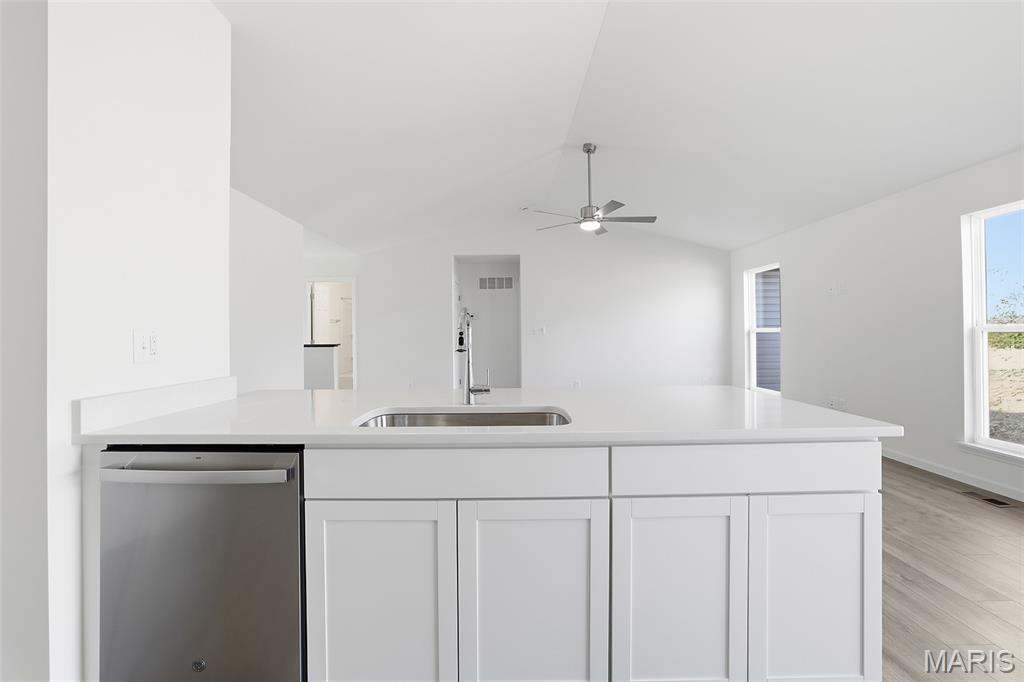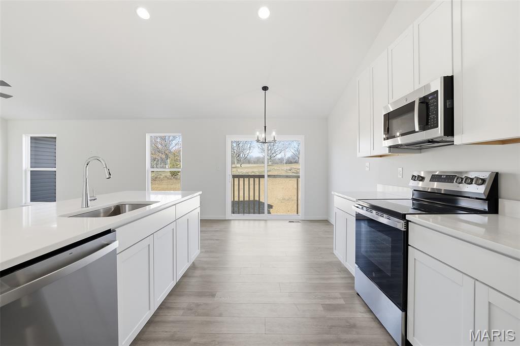 New McBride Homes Aspen ranch 3 BR & 2 BA, is ready now! Farmhouse exterior! Experience an open floor plan with vaulted ceilings, a great room with a ceiling fan & wood laminate flooring in the main living area. The kitchen features level 4 Brellin White 42” tall kitchen cabinetry, quartz countertops, peninsula w/flush breakfast bar for additional seating, & stainless GE appliances. The primary suite features a walk-in closet, & private bath includes a vanity with double sinks & 5’ walk-in shower. Two extra bedrooms & full bath add convenience. Other extras include 6’ windows, ceiling fan prewires, main floor laundry, coachlights at the garage, & white two panel interior doors throughout. The LL features ¾ bath rough in for a future finish. Riverstone offers plenty of local restaurants & shopping, plus there are several nearby golf courses & parks w/amenities. Enjoy peace of mind with McBride Homes’ 10 year builders warranty & incredible customer service! Similar photos shown.