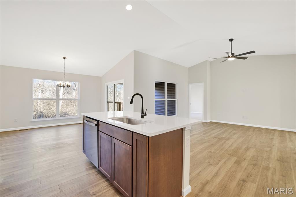 New McBride Homes Aspen II 3BR, 2BA is ready now! Craftsman exterior & Walkout homesite! Enjoy an open floorplan with a vaulted ceiling, 6ft windows, & beautiful wood laminate flooring in main living areas. The kitchen features a large island with a breakfast bar, level 4 Winstead Burlap 42” cabinets, quartz countertops, stainless steel GE appliances & walk-in pantry. The dining area has a sliding glass door to a future covered deck w/ceiling fan prewire. The primary suite features a large window, ceiling fan prewire, dual closets, & private bath w/double sinks & walk-in shower. Extras include main floor laundry, ¾ bath rough in at LL, upgraded matte black lighting/plumbing fixtures, 6 panel interior doors, plus coach lights at garage. Riverstone offers plenty of local restaurants & shopping, plus there are several nearby golf courses & parks w/amenities. Enjoy peace of mind with McBride Homes’ 10 year builders warranty & incredible customer service! Similar photos shown.