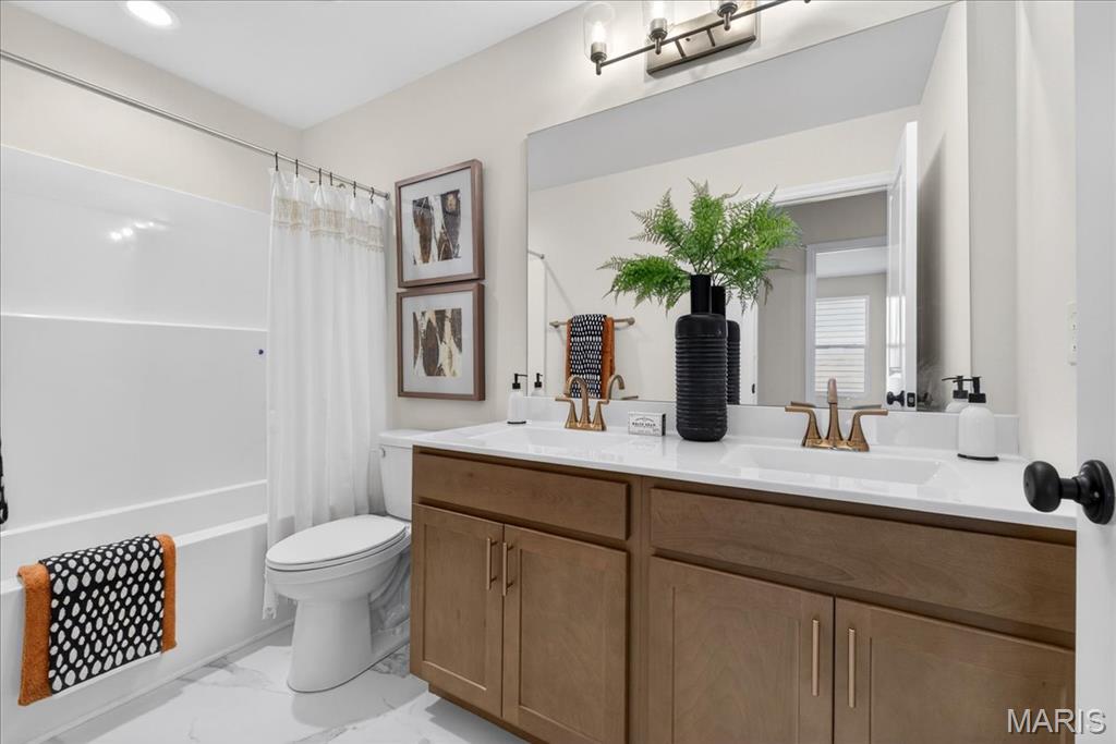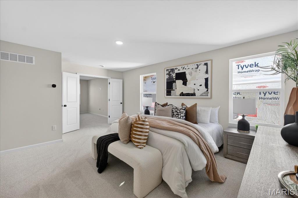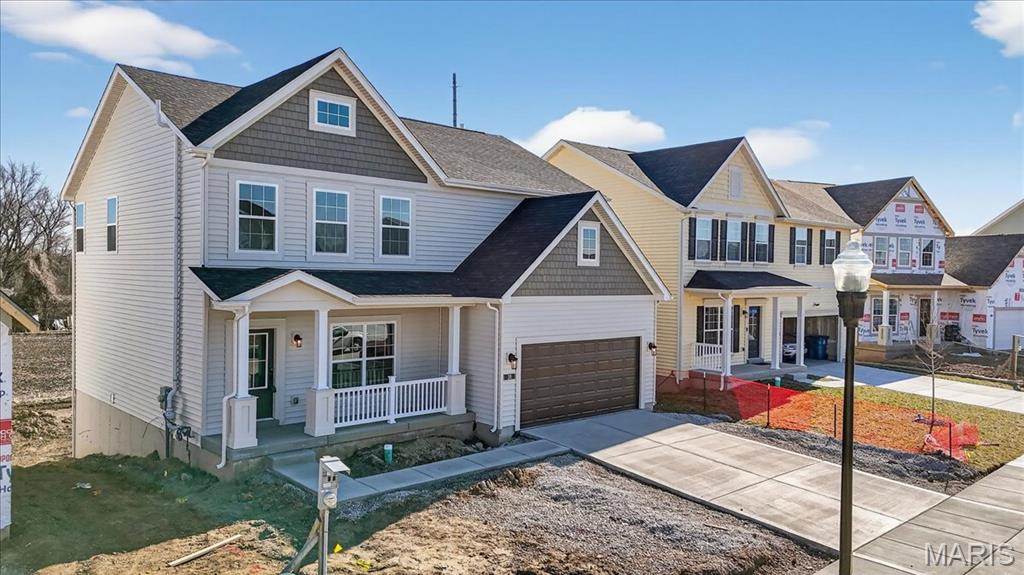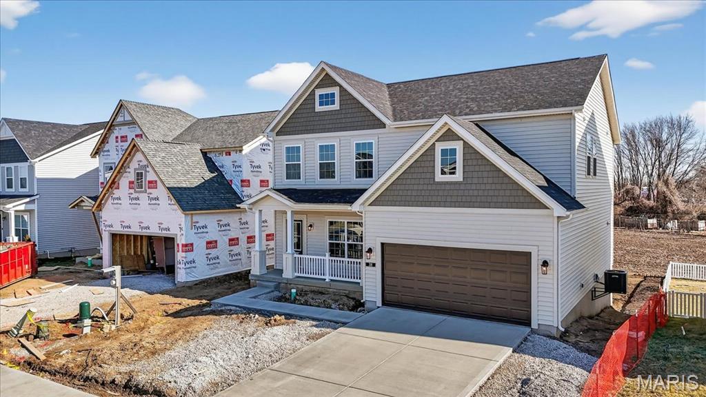 Located in River Breeze Estates, this two-story Sheridan plan offers 2,490 square feet of living space. The main level features laminate flooring throughout the living areas, including a great room with a window wall and recessed lighting, a dining room, and a kitchen with quartz countertops, 42” two-tone cabinetry, stainless steel gas appliances, a refrigerator cabinet, and a walk-in pantry. Upstairs are four bedrooms, including a spacious primary suite with a walk-in closet and a private bath featuring a double vanity, separate soaking tub, and shower. A bonus room provides additional flexible space for an office or recreation area. Additional highlights include a main-floor laundry room, 8’ foundation pour, unfinished basement with rough-in plumbing, a 14x14 composite deck, a two-car attached garage with opener, and a smart thermostat with zoned HVAC. The home is situated on a landscaped lot within the Orchard Farm School District.