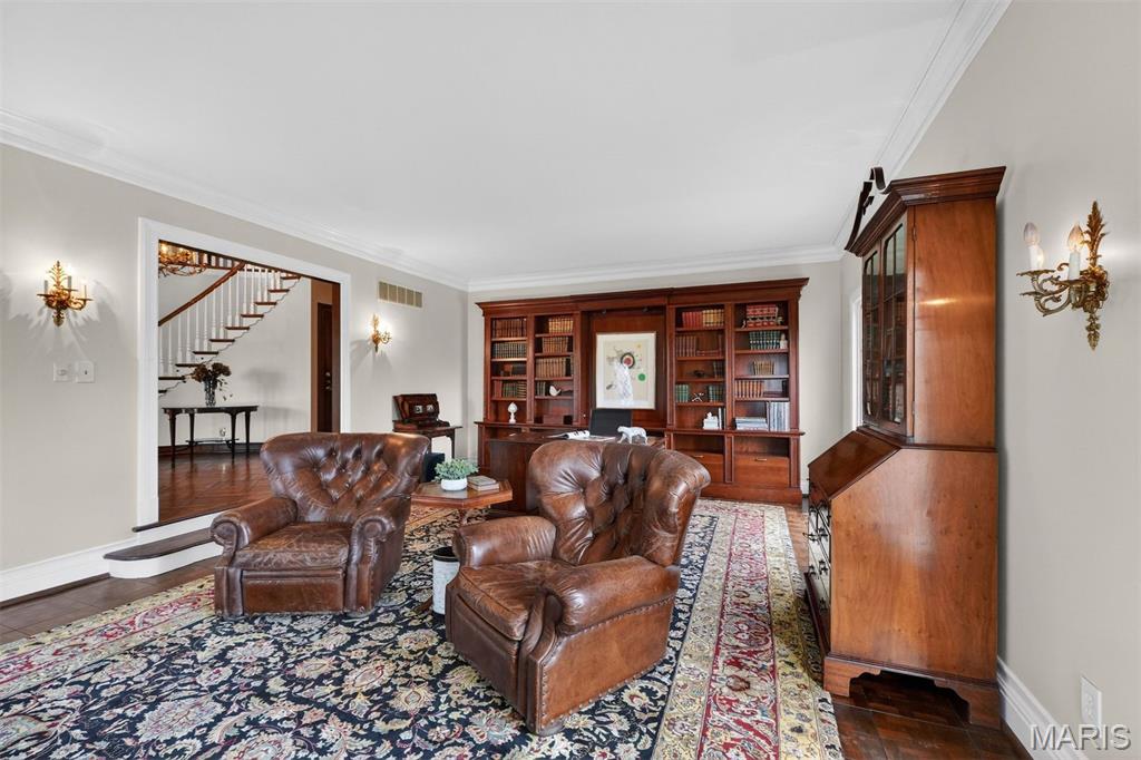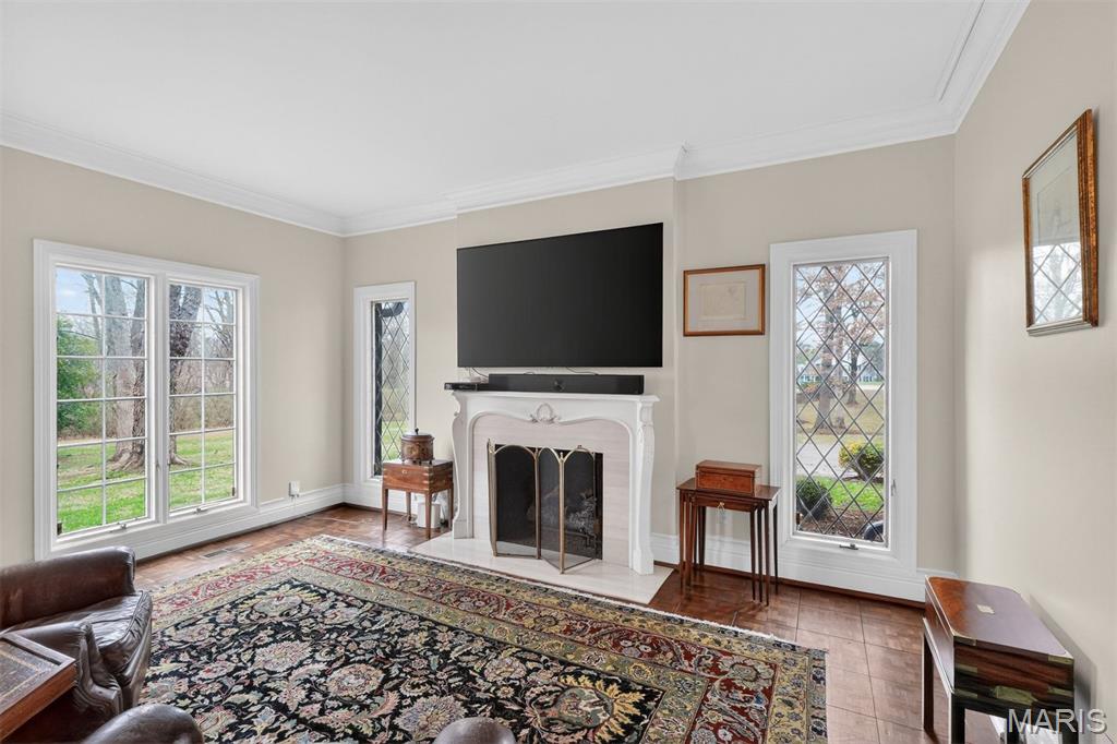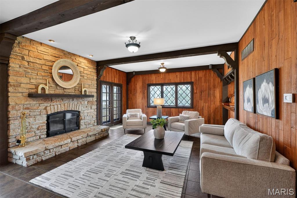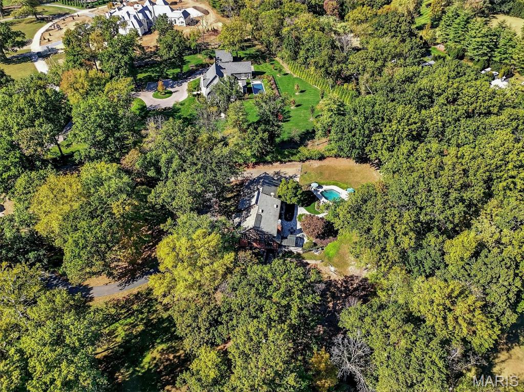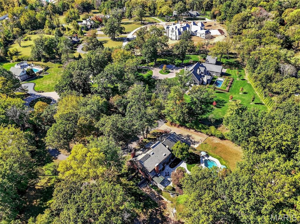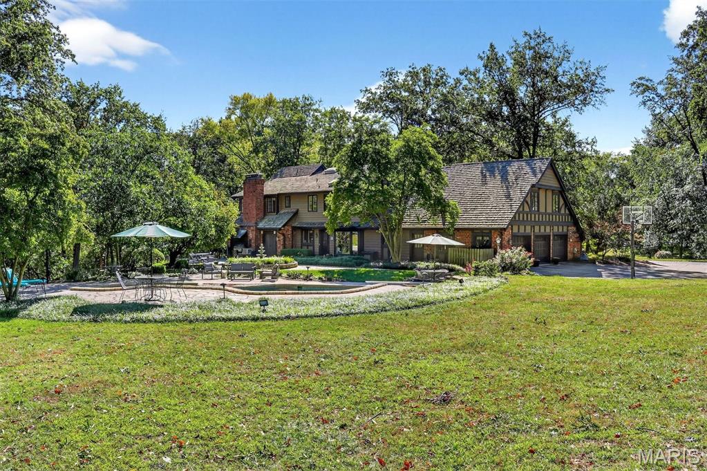 New look! New Price! Nestled in a serene, park-like setting of 3.5+ acres in one of Ladue’s most prestigious neighborhoods, this exquisite Tudor-style residence blends timeless elegance with modern comfort. Surrounded by mature trees and lush landscaping, the property offers a tranquil retreat complete with a saltwater pool, scenic pond, and multiple terraces designed for outdoor enjoyment and entertaining. Inside, classic architectural details abound, including leaded glass windows, parquet flooring, crown molding, and wainscoting. The grand entry welcomes you with a sweeping curved staircase leading to the second floor, setting the tone for the refined spaces beyond. Currently staged as a library, the Living Room's built-in bookcases and gas fireplace with marble surround provide the perfect spot for quiet reading or work. The expansive Family Room, inspired by a ski chalet, is truly a showpiece—featuring a massive stone fireplace as its focal point, a pub-style wet bar, a wall of built-ins, and two sets of French doors opening to a covered terrace that extends the living space outdoors. Ideal for entertaining, the large formal Dining Room is complemented by a spacious modern kitchen with ample room for casual dining and its own gas fireplace, creating a warm and inviting atmosphere. The main level also includes a guest suite that can serve as a second primary or in-law suite, offering flexibility and privacy. Convenience abounds with laundry rooms on both the main and second floors, as well as a perfectly situated second half bath for pool days. Upstairs, the stunning Primary Suite provides a luxurious escape with elegant finishes and serene views of the grounds. A rare combination of character, craftsmanship, and comfort, don't miss this opportunity to make this estate your own private piece of paradise.