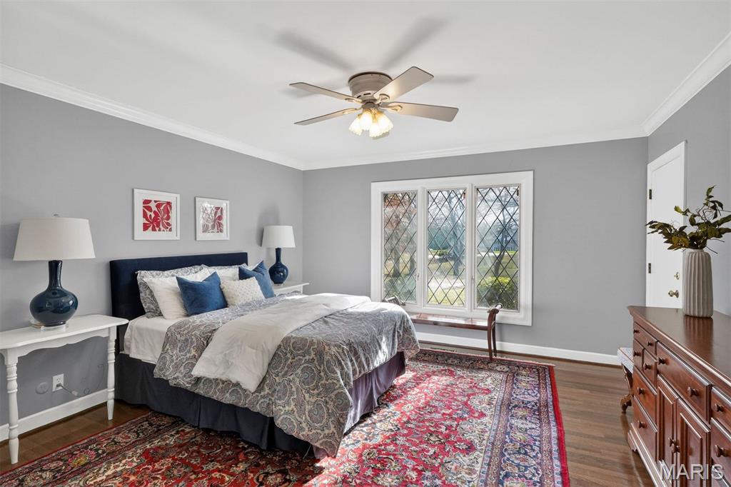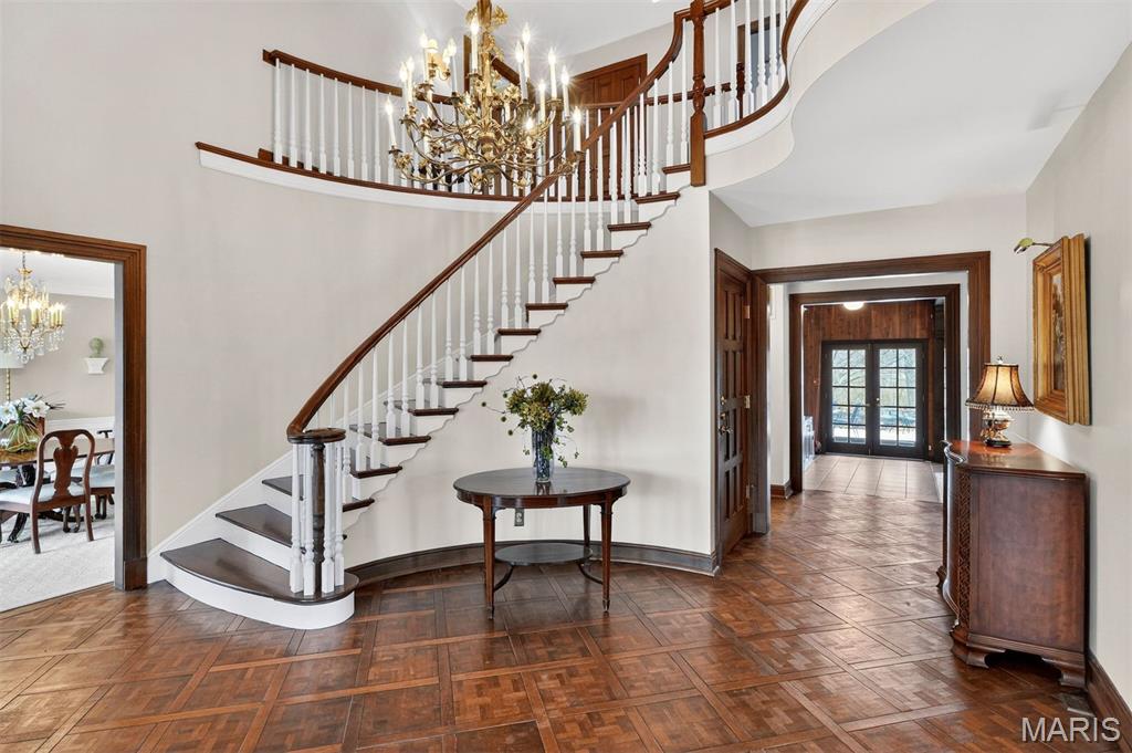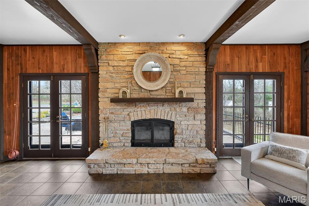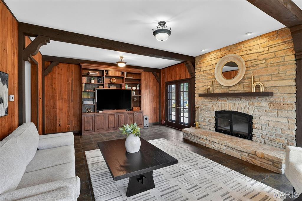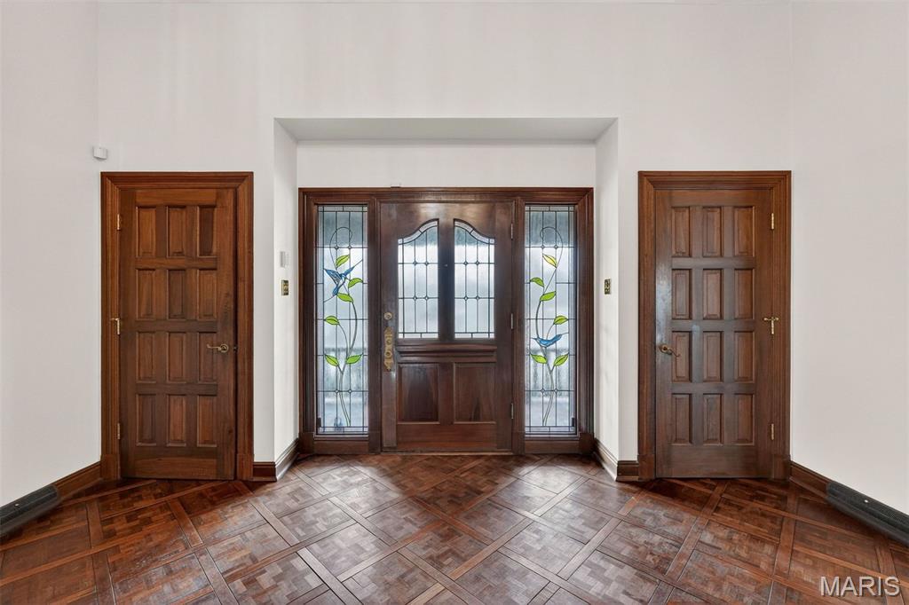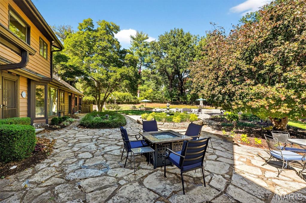 New look! New Price! Nestled in a serene, park-like setting of 3.5+ acres in one of Ladue’s most prestigious neighborhoods, this exquisite Tudor-style residence blends timeless elegance with modern comfort. Surrounded by mature trees and lush landscaping, the property offers a tranquil retreat complete with a saltwater pool, scenic pond, and multiple terraces designed for outdoor enjoyment and entertaining. Inside, classic architectural details abound, including leaded glass windows, parquet flooring, crown molding, and wainscoting. The grand entry welcomes you with a sweeping curved staircase leading to the second floor, setting the tone for the refined spaces beyond. Currently staged as a library, the Living Room's built-in bookcases and gas fireplace with marble surround provide the perfect spot for quiet reading or work. The expansive Family Room, inspired by a ski chalet, is truly a showpiece—featuring a massive stone fireplace as its focal point, a pub-style wet bar, a wall of built-ins, and two sets of French doors opening to a covered terrace that extends the living space outdoors. Ideal for entertaining, the large formal Dining Room is complemented by a spacious modern kitchen with ample room for casual dining and its own gas fireplace, creating a warm and inviting atmosphere. The main level also includes a guest suite that can serve as a second primary or in-law suite, offering flexibility and privacy. Convenience abounds with laundry rooms on both the main and second floors, as well as a perfectly situated second half bath for pool days. Upstairs, the stunning Primary Suite provides a luxurious escape with elegant finishes and serene views of the grounds. A rare combination of character, craftsmanship, and comfort, don't miss this opportunity to make this estate your own private piece of paradise.