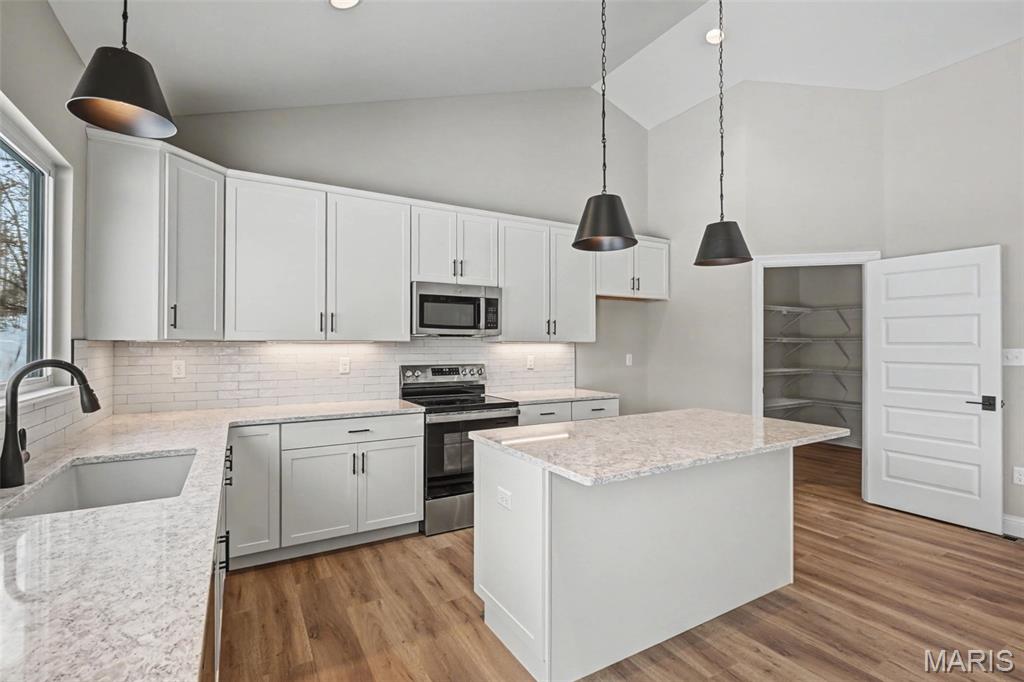 The Hudson Ranch home has a 2 car side entry garage & a 2 car front entry garage w/ plenty of storage. Features Include a Double Front Door, Laminate Floors throughout much of the main floor, upgrade white, staggered, soft close cabinets w/ dove tailed drawers, Stainless Appliances, a wood hood, a huge island, Cambria countertops, tiled backsplash, can lighting, Microwave drawer & walk in pantry. The breakfast room has a 9' wide slider that goes out to a composite deck. The Primary bath has an upg. shower, double bowl, adult hght. vanities, Granite Elite counters & Moen matte black faucets. Other features include iron spindles, 4' wide stairs to lower level, 8' tall doors, 5 1/4" base, 3 1/4" door casing, 8' tall carriage style, insulated garage doors, exterior soffit lighting & a fully sodded & landscaped yard.
