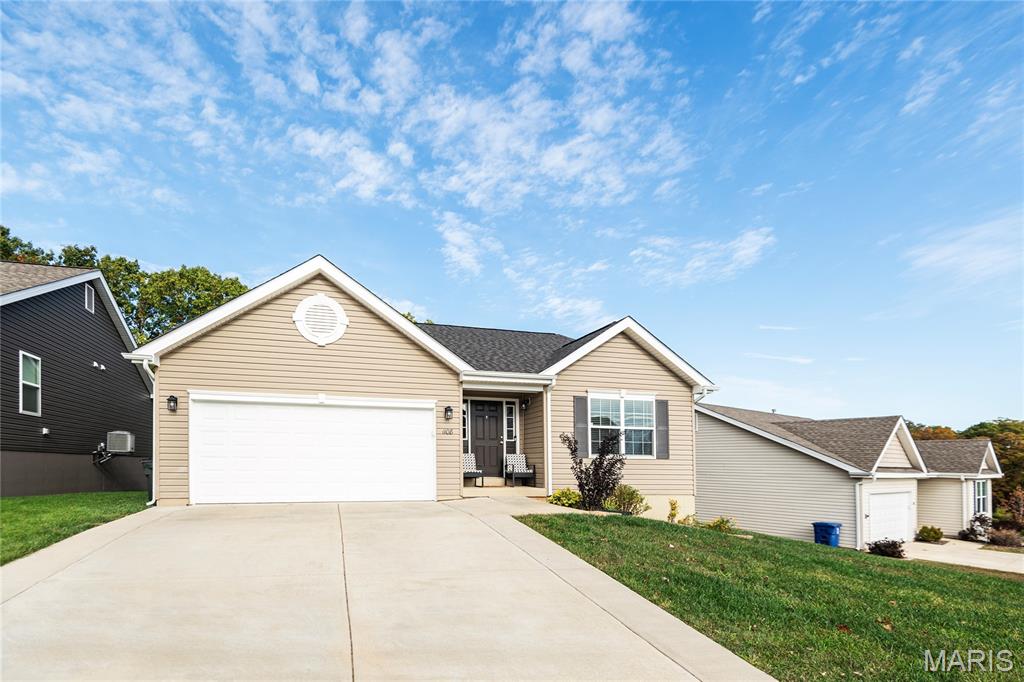 Welcome to this beautiful and updated 7 year old home in the Huntington Glen subdivision. This 3 bedroom, 2 bathroom home includes many updates since it was built. The upgrades include a luxury kitchen with 42" soft-close cabinets, oversize island with seating, custom backsplash, white marble countertops, stainless steel appliances, beverage refrigerator and a walk-in pantry. The living area is an open floor concept with vaulted ceilings and upgraded hardwood floors. The primary bedroom features a walk-in closet and a full bathroom with shower. Two additional bedrooms, a full bathroom and laundry room complete the main level. Freshly painted walls and ceilings truly make this home move-in ready. The unfinished basement is roughed in for a full bathroom, and includes an egress window for a future bedroom and plenty of storage space. Additional upgrades include a new roof (2025) and extended driveway. The backyard overlooks trees that can be enjoyed from the covered patio. Schedule your private showing to experience this beautiful home for yourself.