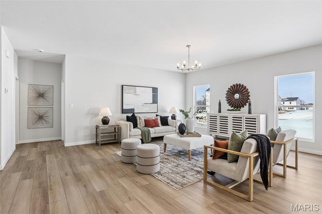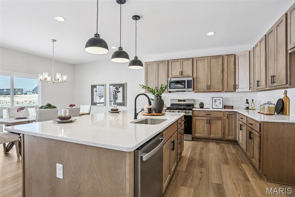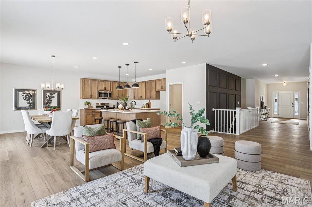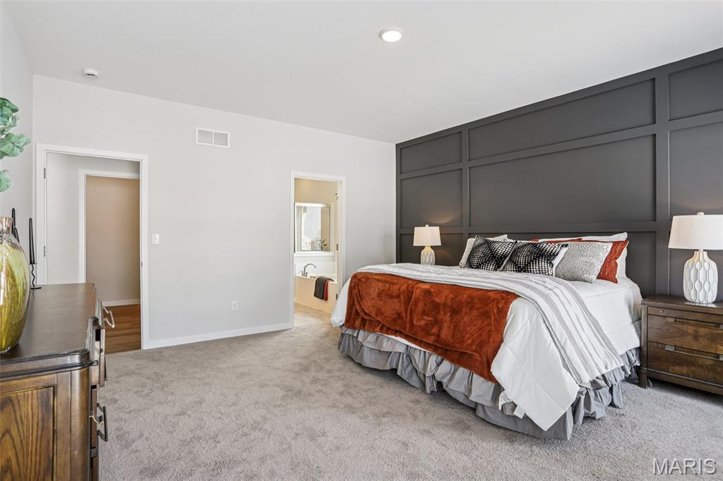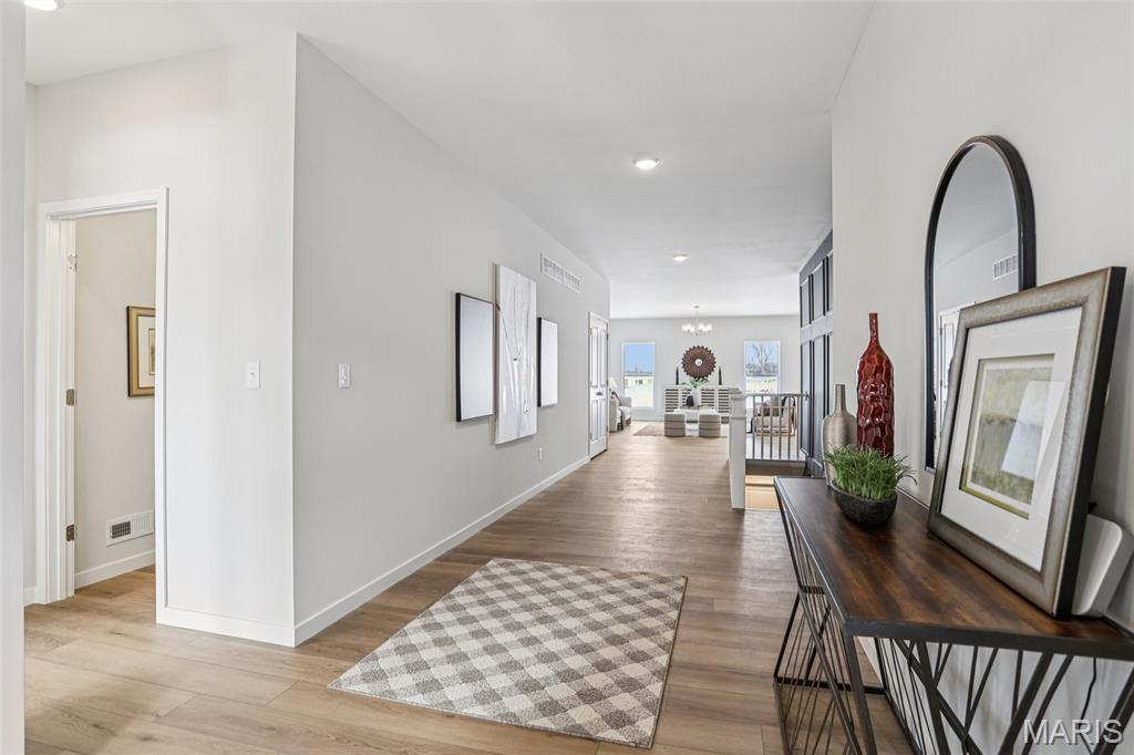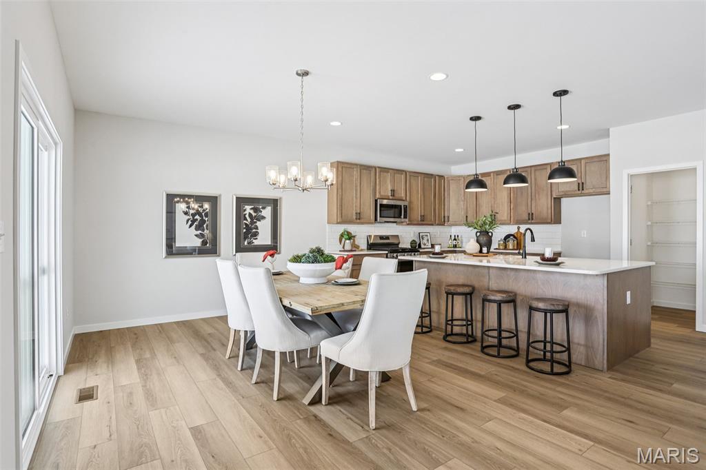 Welcome to a beautifully crafted Edgewood floor plan in the heart of St. Charles, MO! This move-in ready home showcases thoughtful design, modern finishes, and exceptional craftsmanship throughout. Featuring 9-foot ceilings on the main floor, the open layout creates a bright and inviting atmosphere perfect for both entertaining and everyday living. The gourmet kitchen is a chef’s dream, complete with stainless steel appliances, 42” cabinetry, quartz countertops, and a large center island that seamlessly connects to the dining area and great room. A sliding glass door floods the space with natural light, enhancing the home’s warm and welcoming feel. The owner’s suite provides a private retreat with a spacious walk-in closet and a luxurious bath featuring a garden tub, marble shower, and dual vanities. Additional highlights include an unfinished lookout basement with plumbing rough-ins for a future bath and a 2-car front-entry garage with tandem space, perfect for extra storage or a workshop. Ideally located just minutes from major highways, shopping, and dining, this home combines comfort, convenience, and timeless style. Contact us today for more information or to schedule your private tour! Photos and virtual tour may depict a similar home; finishes may vary