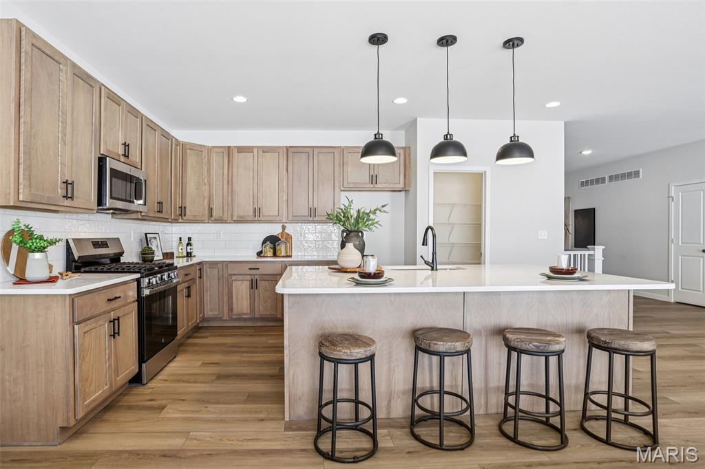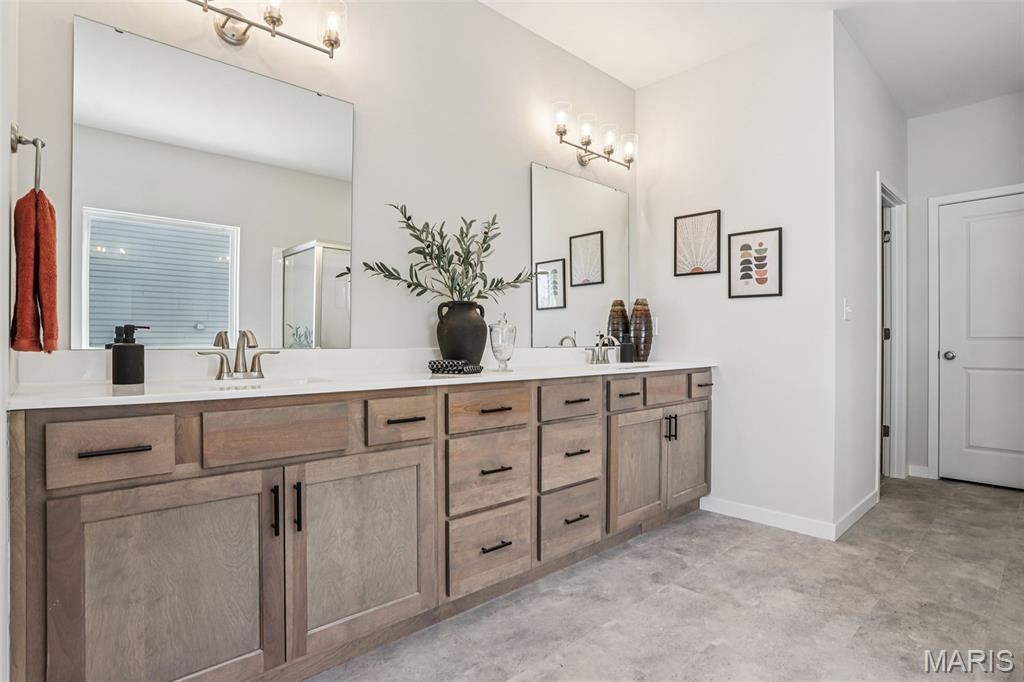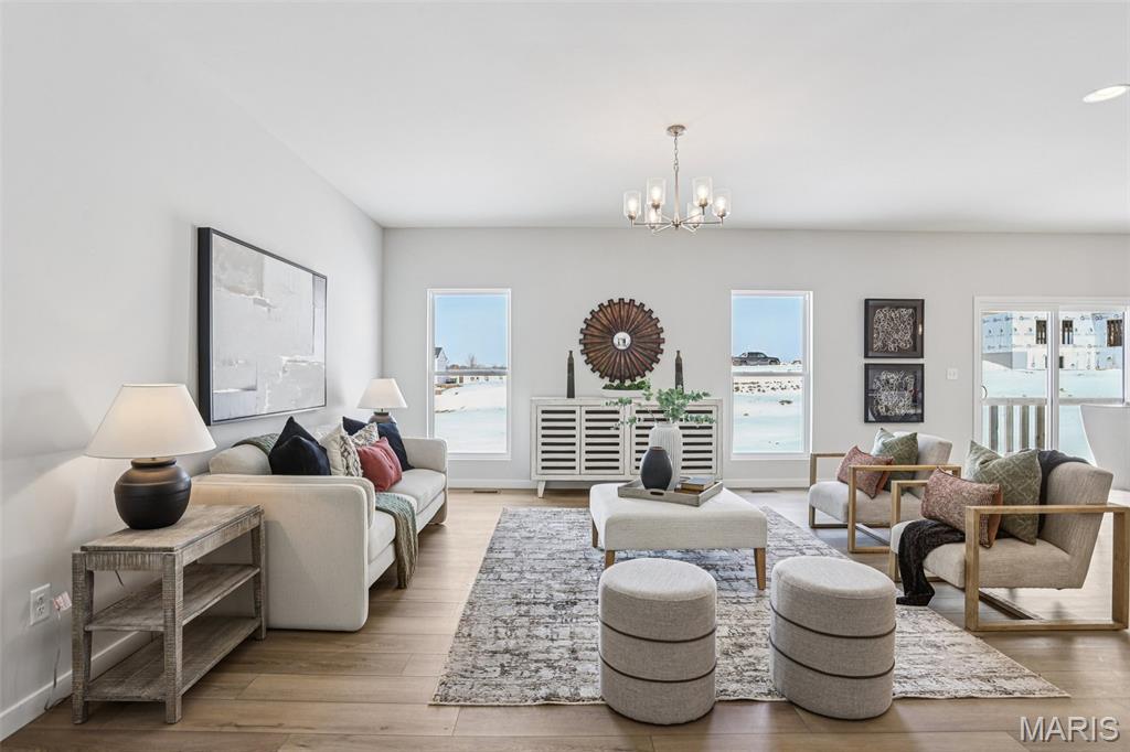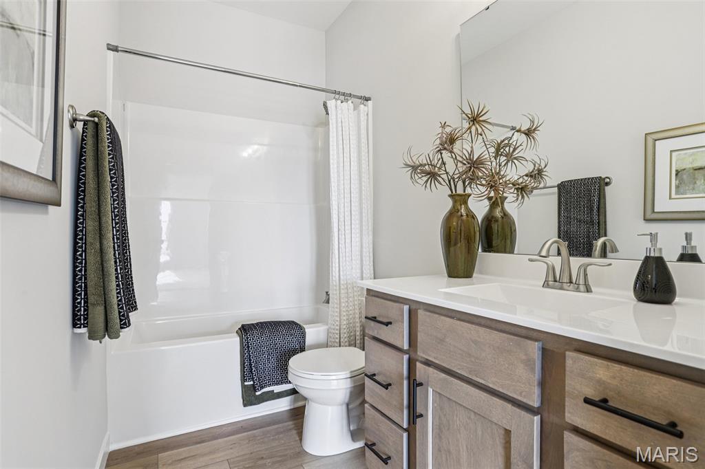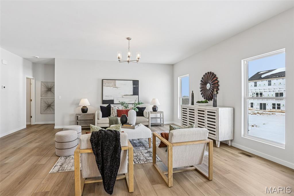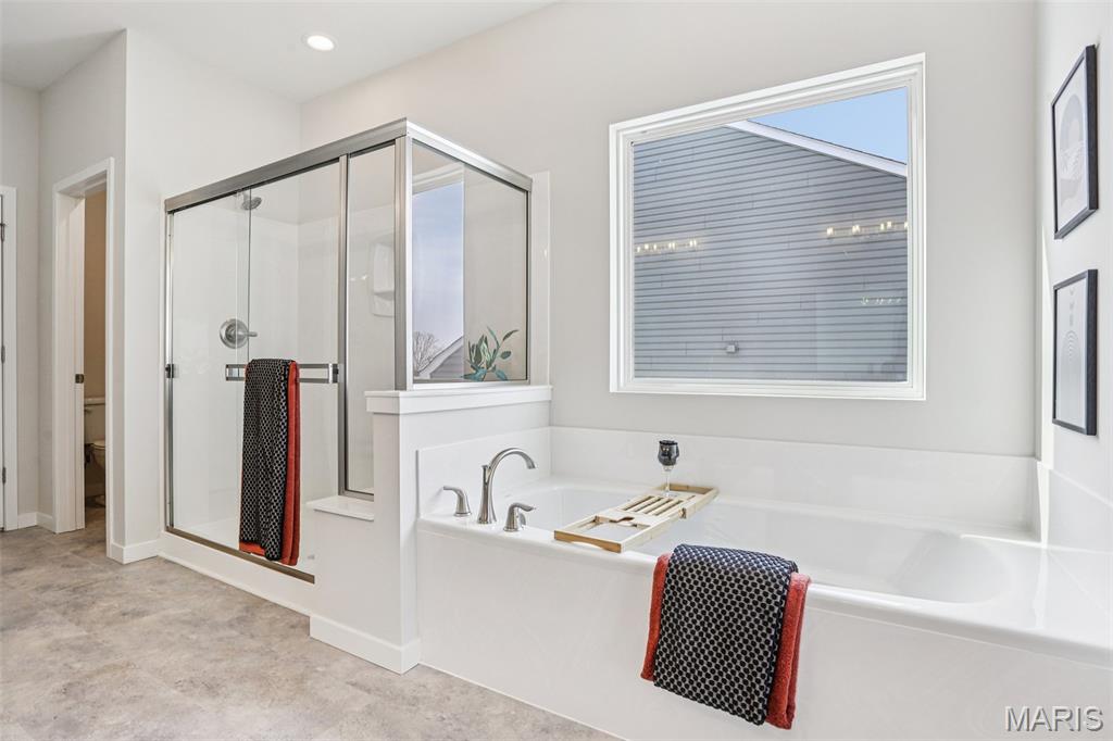 Welcome to a beautifully crafted Edgewood floor plan in the heart of St. Charles, MO! This move-in ready home showcases thoughtful design, modern finishes, and exceptional craftsmanship throughout. Featuring 9-foot ceilings on the main floor, the open layout creates a bright and inviting atmosphere perfect for both entertaining and everyday living. The gourmet kitchen is a chef’s dream, complete with stainless steel appliances, 42” cabinetry, quartz countertops, and a large center island that seamlessly connects to the dining area and great room. A sliding glass door floods the space with natural light, enhancing the home’s warm and welcoming feel. The owner’s suite provides a private retreat with a spacious walk-in closet and a luxurious bath featuring a garden tub, marble shower, and dual vanities. Additional highlights include an unfinished lookout basement with plumbing rough-ins for a future bath and a 2-car front-entry garage with tandem space, perfect for extra storage or a workshop. Ideally located just minutes from major highways, shopping, and dining, this home combines comfort, convenience, and timeless style. Contact us today for more information or to schedule your private tour! Photos and virtual tour may depict a similar home; finishes may vary