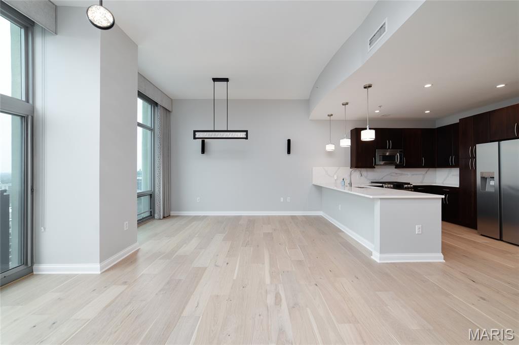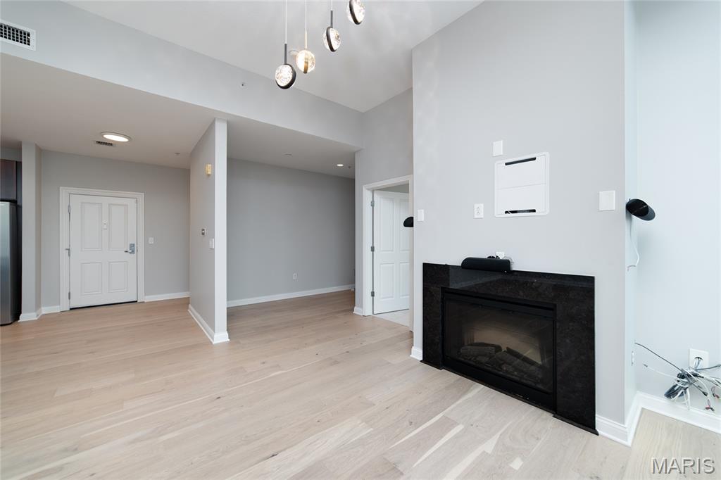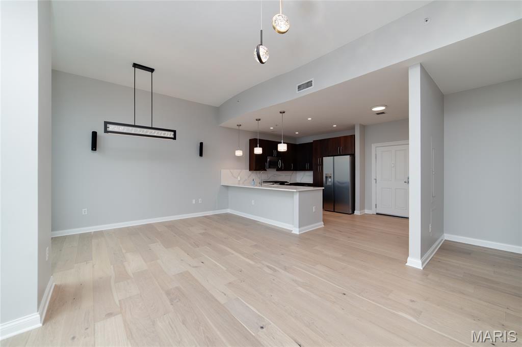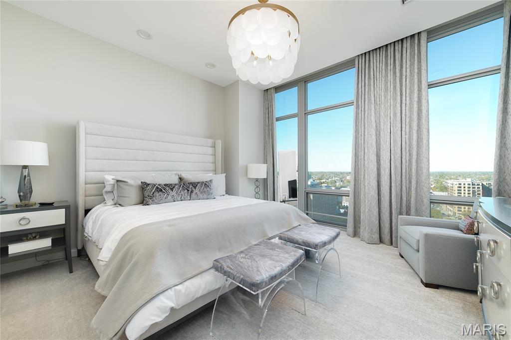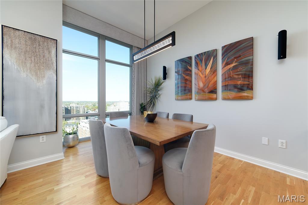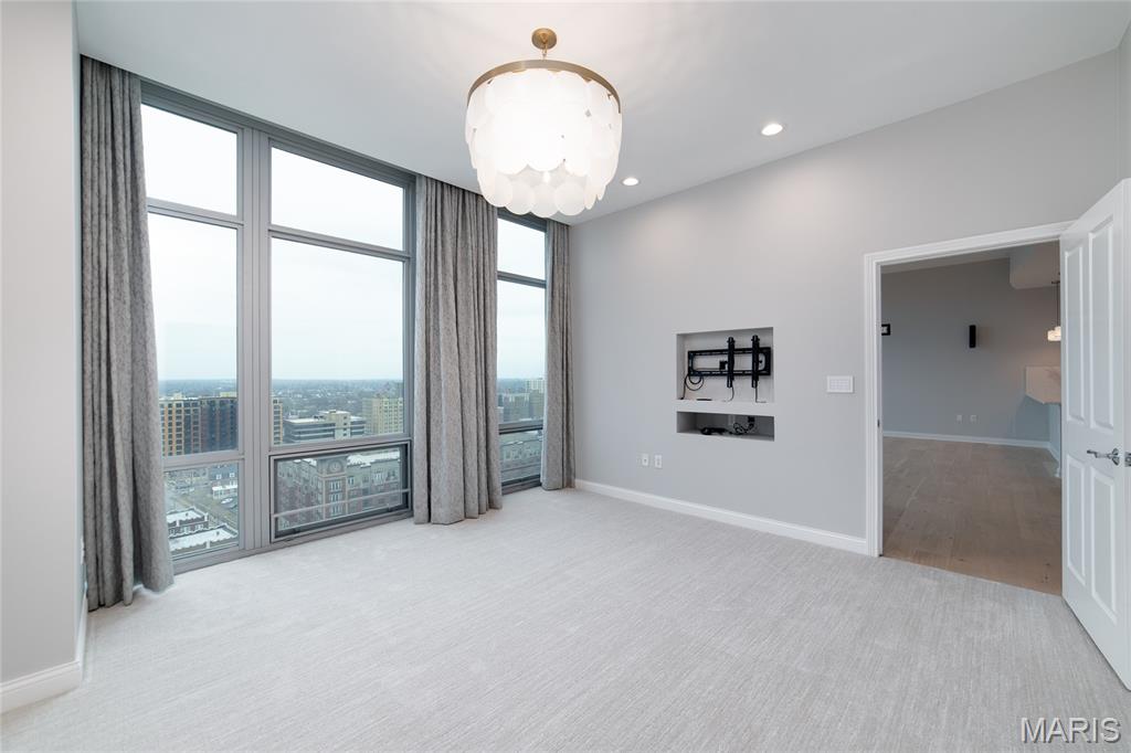 This elegant condominium seamlessly combines contemporary luxury with thoughtful design, offering a refined living experience throughout every space. The open-concept living and dining area welcomes you with sophisticated custom draperies—stationary panels trimmed in a rich, textured fabric that frame the room beautifully. A stunning Mariana Glitzer 9-light LED chandelier sparkles above the dining space, complemented by the sculptural Equilibrium pendant light that adds a modern artistic touch. The electric fireplace serves as the focal point of the living area, creating both warmth and ambiance for relaxing evenings or stylish entertaining. New carpeting and European White Oak Engineered flooring has been added. The adjacent office area is designed for productivity and style, and two ceiling can lights that provide ample illumination for work or creative projects. This well-appointed space offers both function and quiet retreat within the home. The kitchen is a chef’s delight, centered around a high-end GE Café 30-inch dual-fuel range with double ovens—perfect for cooking and entertaining alike. The Calacatta Leon Gold quartz counters deliver a luxurious aesthetic with their delicate veining and bright finish, complemented by a premium Kohler Simplice faucet and Kohler Prolific stainless steel sink. New pendant lights grace the breakfast bar, while four recessed can lights and a new flush fixture in the entrance ensure the entire kitchen is bright, inviting, and impeccably lit. The primary bedroom is a tranquil sanctuary, featuring plush new carpet that extends into the spacious closet. A graceful chandelier adds soft elegance, while remote-controlled blackout roller shades allow for total light control and restful sleep. Custom stationary drapes complete the refined aesthetic, creating a serene and private atmosphere. The adjoining primary bathroom continues the theme of comfort and sophistication, enhanced by four new can lights and updated lighting above the mirror. The double vanity offers abundant space, while the jetted tub and separate shower provide a spa-like retreat within the comfort of home. Additional features, including 11-ft ceilings, enhance the convenience and modern functionality of the residence. A stacked LG True Balance washer and dryer make laundry simple and efficient. The powder room has been tastefully updated with new lighting and a decorative ceiling that adds a touch of glamour. Fresh paint throughout the condominium lends a bright, pristine finish, while the Nest thermostat ensures effortless climate control. The Lutron lighting system allows you to set the perfect ambiance in every room with ease. Combining high-end finishes, modern upgrades, and timeless design, this condominium offers a truly elevated living environment—sophisticated, inviting, and ready to welcome you home.