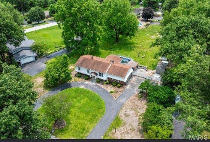 Back at Market at No-Fault to Seller! Set on roughly an acre with mature trees, this light-filled multi-level home offers flexible spaces inside and out. The main level features a bright living room, dining area, and an updated kitchen with center island, pendant lighting, and sliding doors to a cheerful sunroom. Three comfortable bedrooms are served by two full baths, plus an additional quarter bath near the living areas. The finished lower level includes a fireplace, built-ins, and generous space suited to media, hobby, or office use. Recent improvements include a poured-concrete entertaining patio with pavilion, fresh carpeting, new ceiling fans, and epoxy-finished utility areas. Outside, enjoy a circular drive, attached two-car garage, fenced area, storage shed, and expansive yard for everyday enjoyment. Convenient access to area parks and Hwy 67/367. Approx. 1,806 sq ft per prior records.