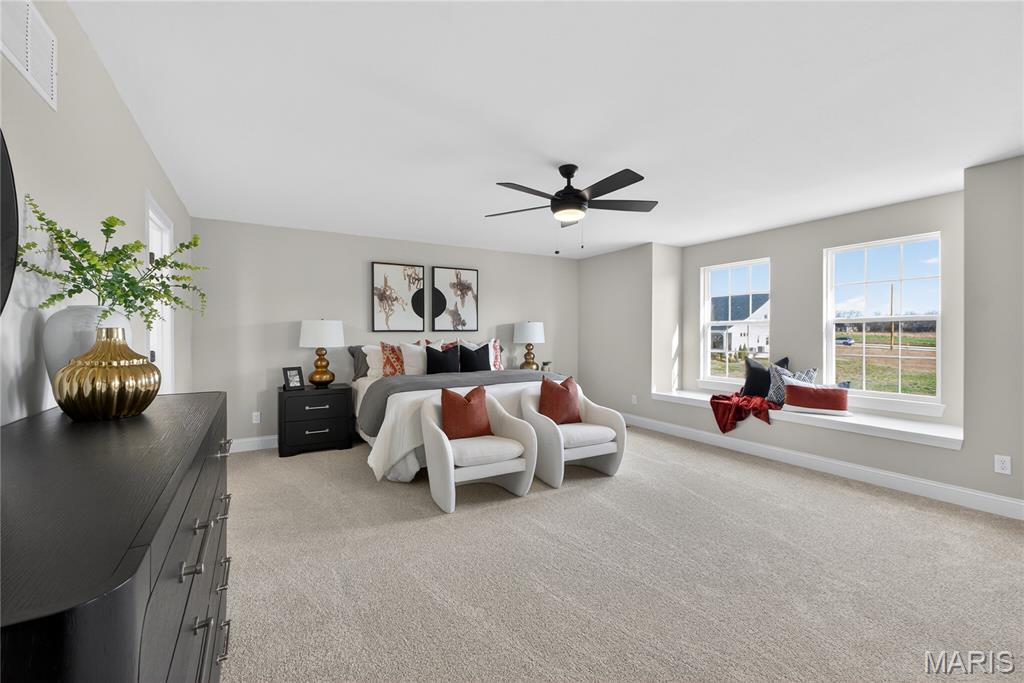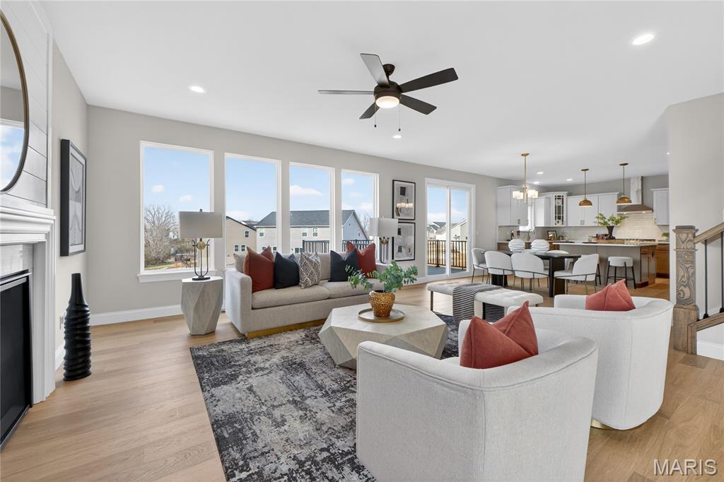 Welcome to this new 2-story home by Consort Homes in Prairie Bluff offering 2,892 sq. ft. of living space. The main level features LVP flooring throughout the family room, living room, dining room, kitchen, and breakfast room. The family room includes a window wall, gas fireplace, and ceiling fan. The kitchen offers staggered cabinets with glass mullion accents, crown molding, roll trays, decorative panels, soft-close features, dovetail construction, full-extension drawers, two-tone cabinetry, quartz countertops, stainless steel gas appliances, a refrigerator cabinet, island, and pendant lighting. The upper level includes a bonus room, laundry room, and four bedrooms. The primary suite features a 16x19 bedroom with ceiling fan, walk-in closet, and a bath with double wave-bowl vanity, freestanding tub, and upgraded hardware. Secondary bedrooms include bracing for future ceiling fans. Additional baths feature wave-bowl vanities and LVT flooring. The home includes a walkout basement with rough-in plumbing, sump pump, and concrete construction. Exterior features include brick veneer, vinyl siding, composite deck (14x14), concrete patio (12x12), and landscaped yard. Three-car attached garage with opener, concrete driveway, and coach lights.