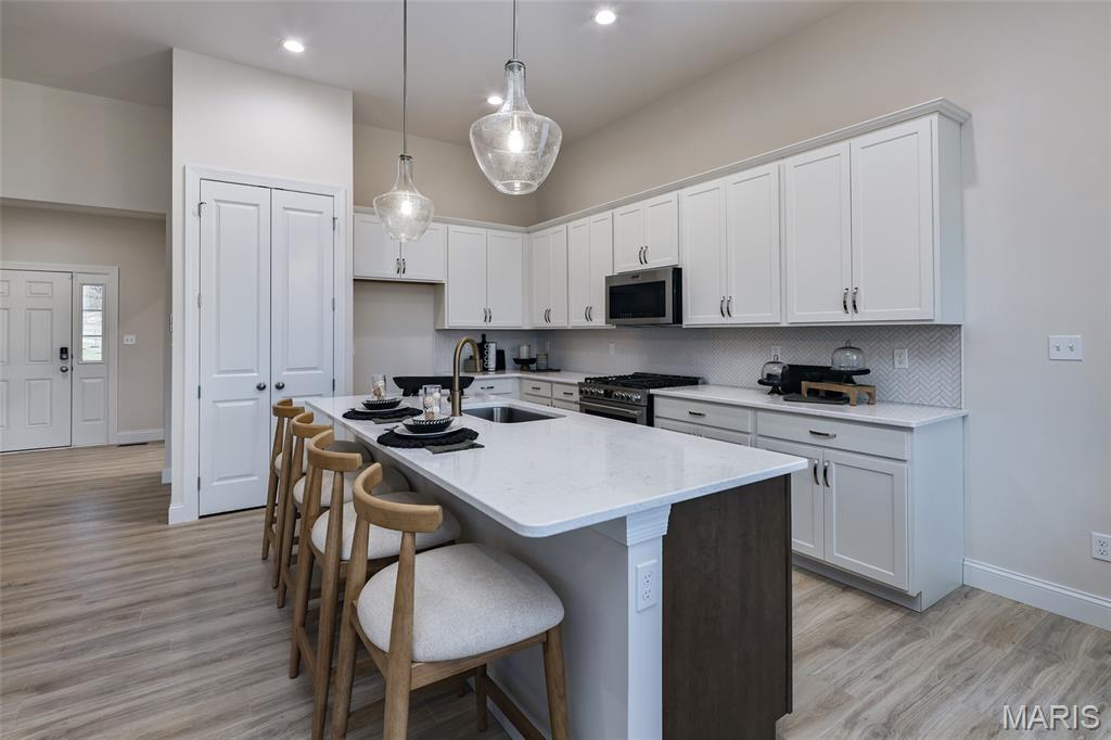Come see the Davenport by Consort Homes located in the Harvest subdivision. This single-story residence offers 1,870 sq ft of above-grade living space with 3 bedrooms, 2 bathrooms, and an open-concept layout. The great room features a window wall, ceiling fan, and a volume ceiling that continues into an elegant kitchen with quartz countertops, custom 42" cabinets with crown molding, stainless steel gas appliances, center island, pantry, and pendant lighting. The primary suite includes a ceiling fan and private bath with double vanity, separate soaking tub and shower. Two additional bedrooms feature bracing for future ceiling fans. Main-floor laundry room adds everyday convenience. Luxury vinyl plank flooring throughout main living areas and bedrooms. Full unfinished walk-out basement with rough-in bath and sump pump provides future expansion potential. Exterior features include brick veneer with vinyl siding, architectural shingle roof, landscaped lot, and 3-car attached garage with opener. Located in the Wentzville R-IV School District. Harvest community amenities include common ground, playgrounds, pickleball, dog park, bocce ball, food truck court, nature play area with water feature, civic lawn area, orchards, pumpkin patch and walking trails.