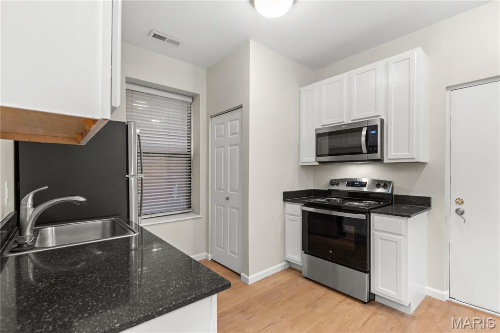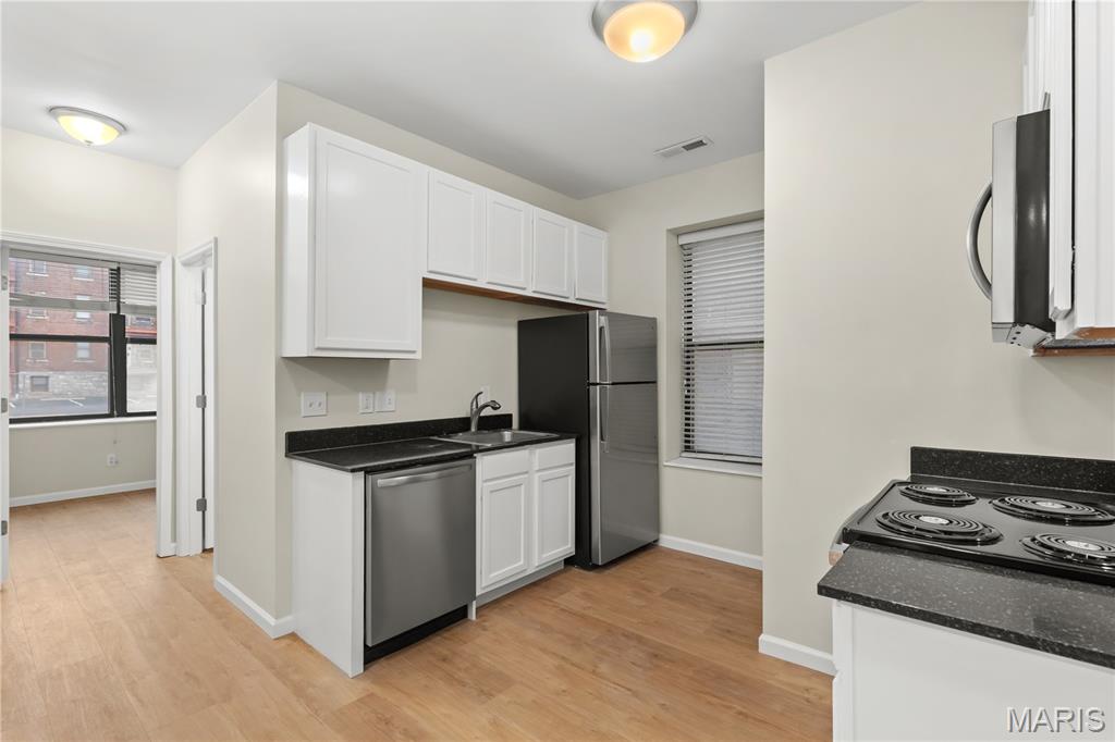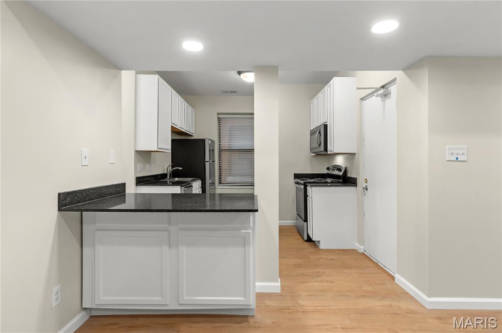 Completely rebuilt from top to bottom, this beautifully updated first-floor unit offers modern comfort in a classic brick building. Inside, you’ll find an open and inviting living space with luxury plank flooring, neutral paint tones, recessed lighting, and abundant natural light throughout. The updated kitchen features crisp white cabinetry, sleek black countertops, stainless steel appliances, and a convenient breakfast bar that opens to the main living area—ideal for both everyday living and entertaining. Spacious bedrooms include generous closet space and ceiling fans, while the fully renovated bathroom offers clean, contemporary finishes and ample storage. Additional highlights include in-unit laundry hookups, private entry access, and dedicated off-street parking. Located near Forest Park, major universities, dining, highways, and within walking distance to public transportation, this move-in-ready unit is an excellent opportunity for an owner-occupant or investor. Schedule your showing today!
