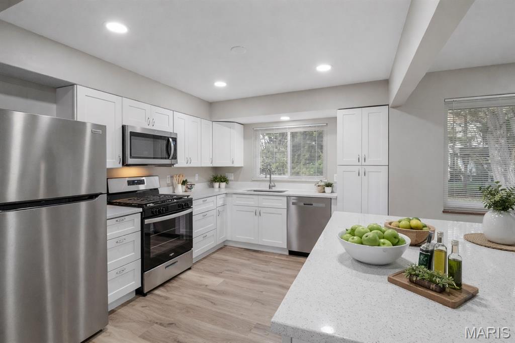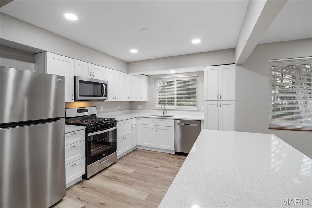 Don't Miss this BEAUTIFULLY & PROFESSIONALLY UPDATED OPEN FLOOR PLAN boasting 1465 Square Foot of total living area! This MOVE-IN-READY ranch features a bright front living room that flows seamlessly into the eat-in kitchen with beautiful newer cabinetry, quartz countertops, and stainless steel appliances. Recent improvements include luxury vinyl plank flooring, updated doors, trim, baseboards, and modern lighting throughout. Three comfortable bedrooms and an updated full bath complete the main level. The partially finished lower level adds additional living space with new carpet and flexible use for a family room, office, or recreation area. Additional updates include an upgraded 100-amp electric panel, whole main level has newer energy-efficient windows with transferable warranty, and updated PVC main plumbing stack. Oversized single-car garage and great functionality throughout make this home truly move-in ready. Convenient location close to shopping, parks, and schools! Schedule your showing today!
