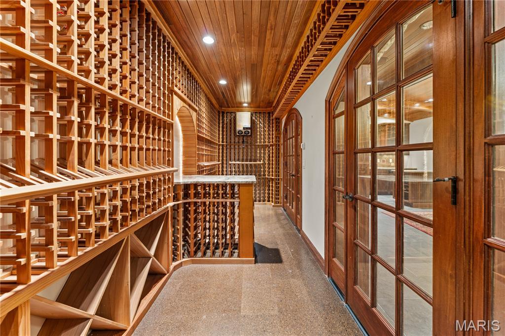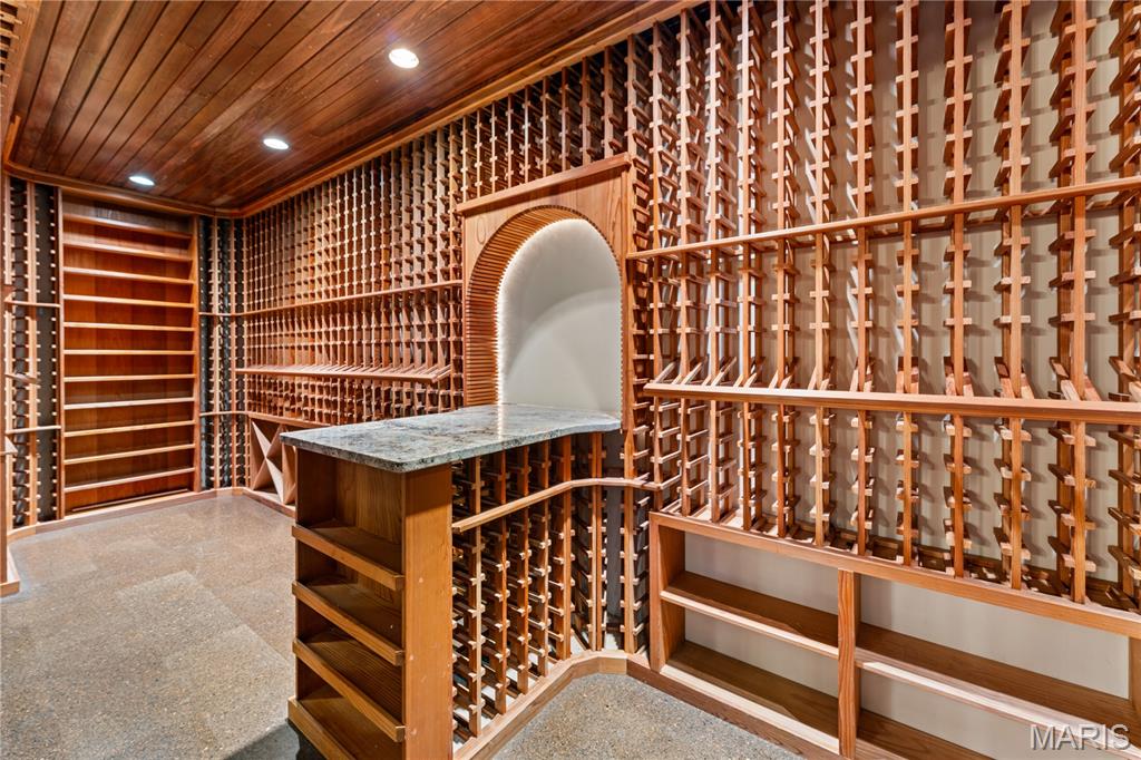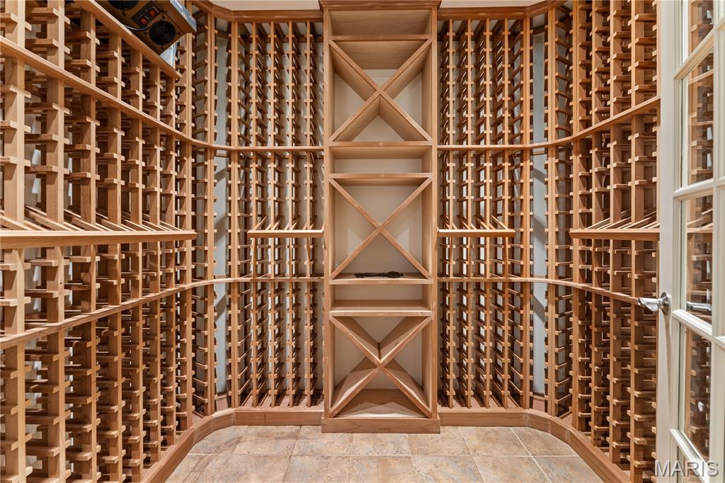 This impressive 6,000+-square-foot brick-and-limestone home is set on 1.29 acres in Sunset Hills and includes a separate 2,000+-square-foot, two-story guest house. The thoughtfully designed layout is ideal for both everyday living and entertaining. Hardwood floors flow through the living and dining areas into the kitchen. The kitchen offers generous cabinetry, extensive workspace, a large walk-in pantry, and a breakfast room open to the family room. The dramatic two-story living room features a two-sided fireplace shared with the family room, while a circular library creates a fun spot for reading or working. The main-level primary suite includes dual vanities, a soaking tub, a separate shower, and walk-in closets. Upstairs, a loft overlooks the foyer and leads to three bedrooms - one with an ensuite bath and two joined by a Jack-and-Jill bath. The walk-out lower level expands the living space with a family room featuring a fireplace, a bar area, a bedroom, and a full bath. The guest house offers exceptional flexibility, with a private apartment above featuring a full kitchen and bath, and a freshly painted wine cellar below with a barrel-vaulted ceiling. Outdoor amenities include a pool and spa, plus a lower, level yard with a swing set.
