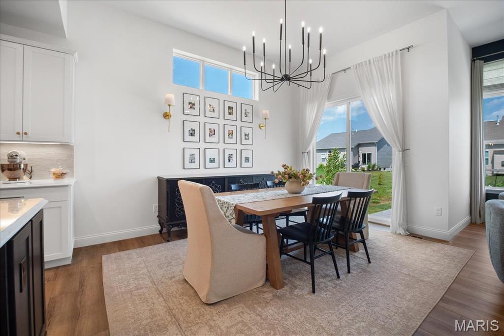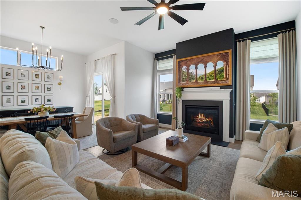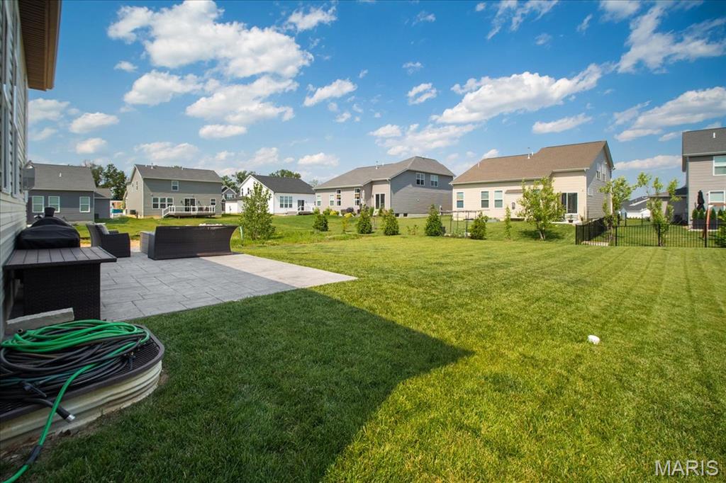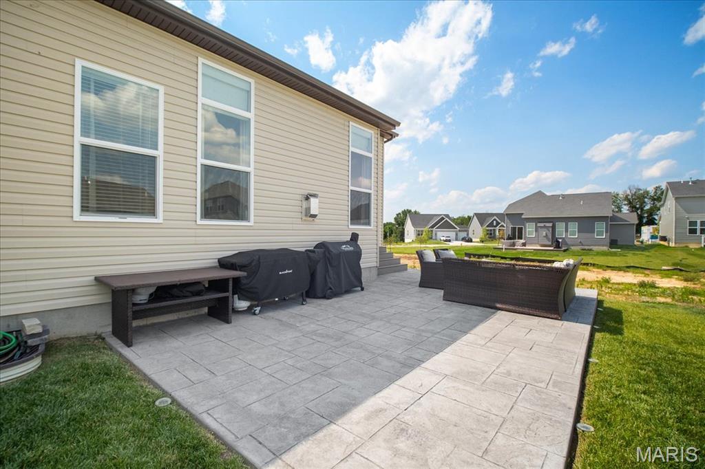 Beautiful 4 bedroom 1.5 story Madison w/ rare custom 4-car garage (34.5'' deep tandem) less than 2 years young! This home is a blend of luxury, relaxation & functionality. Step inside & you're greeted by the formal dining, currently set up as a game room accented with trendy paint & decor. Main floor Owner's Suite with luxury bath, adult height vanities, separate garden tub, walk-in shower & large walk-in closet. Natural light cascades through the open main living area w/ 11' ceilings in family room & breakfast room. Take in the ambience & relax in the family room w/ gas fireplace, recessed lighting, huge fan, expansive windows & built in Klipsch ceiling speakers. Gourmet Kitchen w/ 42" soft close cabinets, quartz center island & countertops, & walk-in pantry. All GE Appliances; 5-burner gas stove w/ SS hood, wall oven w/ convection microwave, & dishwasher. Breakfast area w/ transom window w/ O/S 8' slider patio door leading to exquisite stamped concrete patio w/ natural gas fire pit overlooking a level backyard perfect for summertime fun or future pool! MFL doubles as a mudroom equipped w/ utility sink. Upstairs has 3 add'l bedrooms & loft/bonus room w/ some walk-in closets & full bath. Zoned HVAC damper system w/ ceiling fans in all bedrooms. Basement w/ 9' pour, rough-in bath, egress window & awaits your finishing touches. Walking distance to Frontier Middle School & Discovery Elementary w/ Liberty High 1.2 miles away. Close to shopping @ Pointes of Hawk Ridge. Hurry in!"