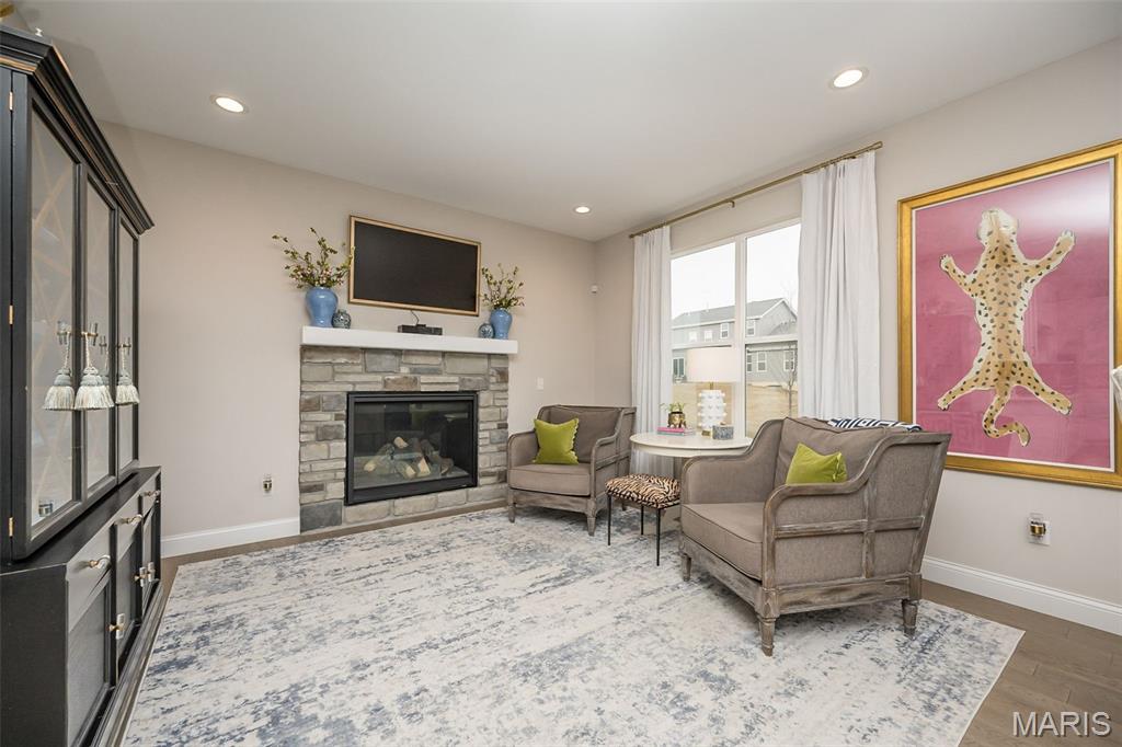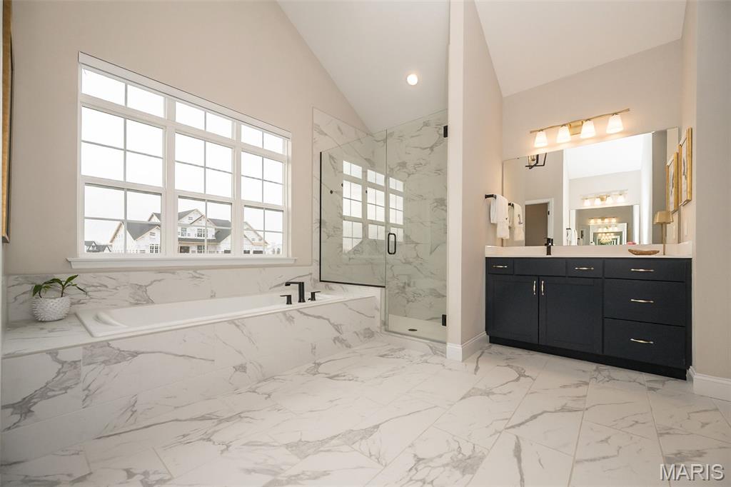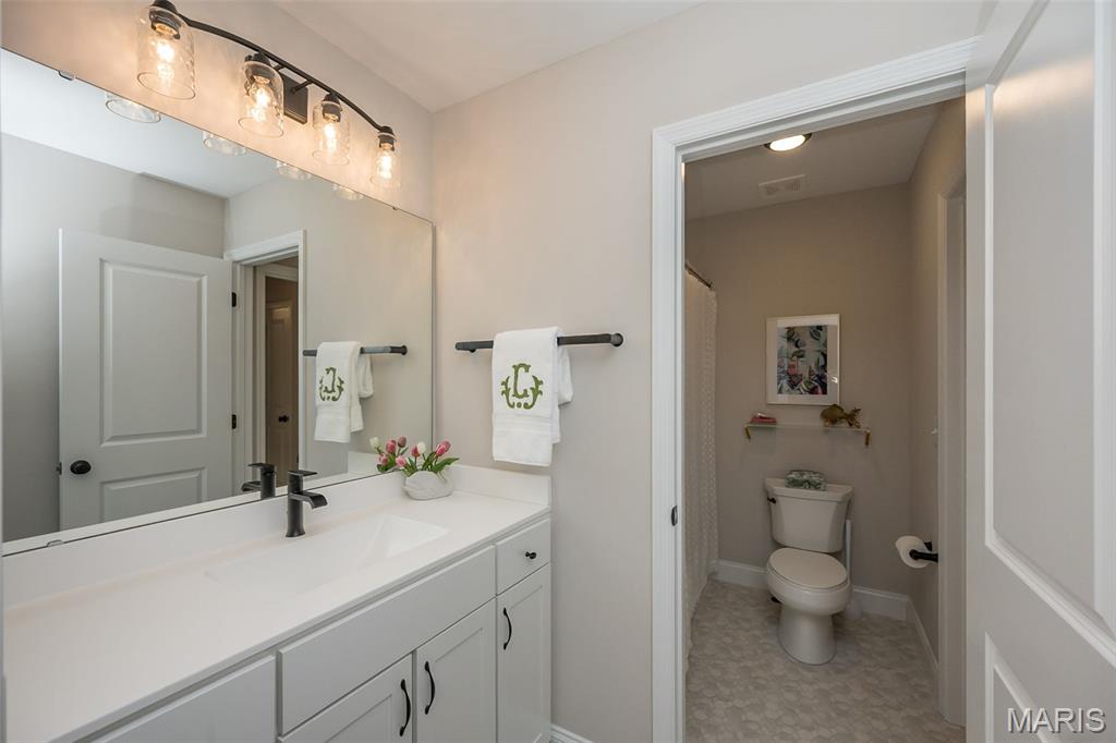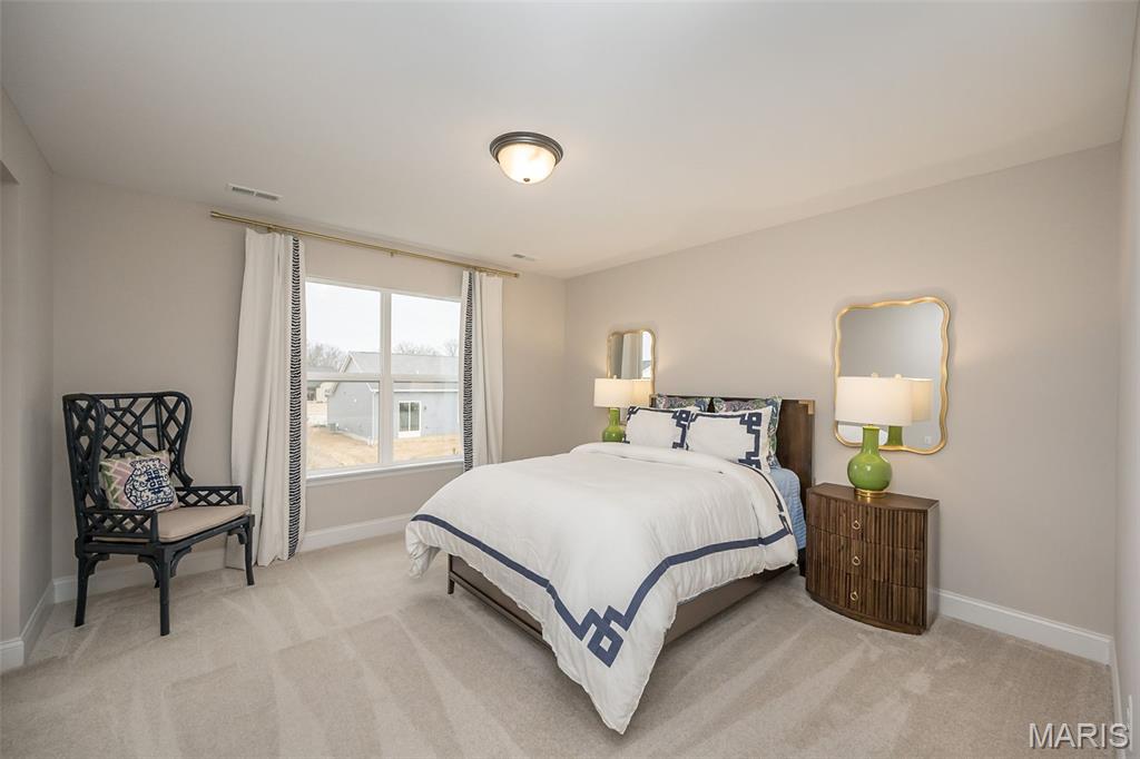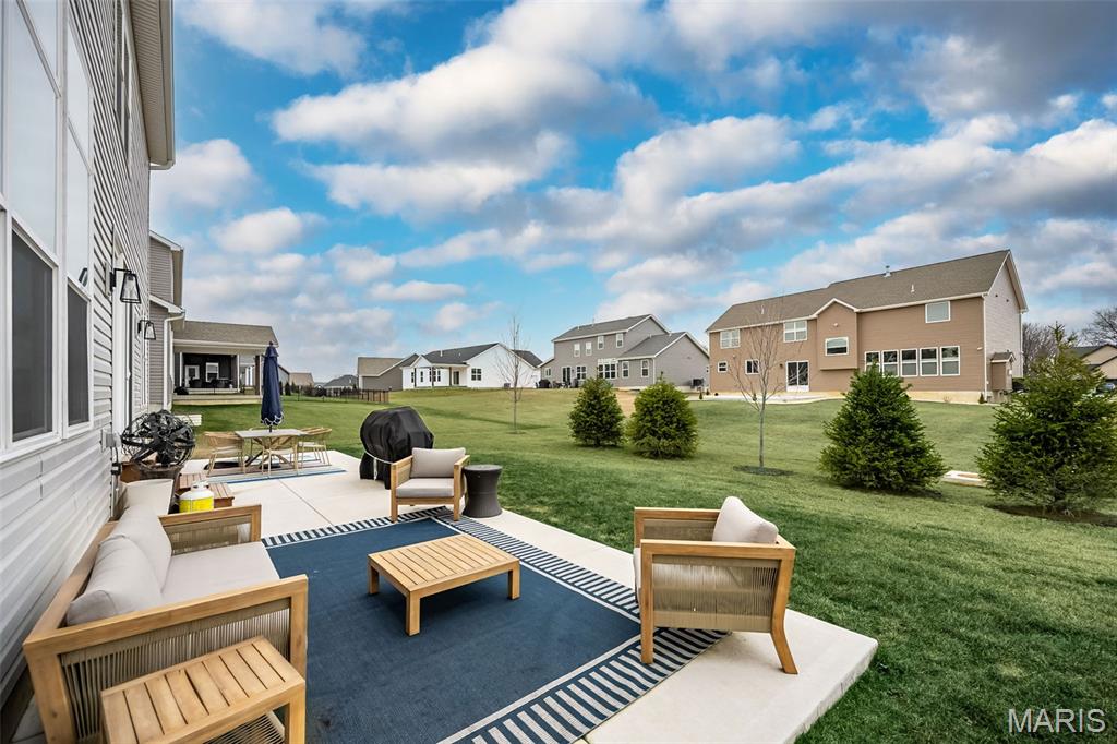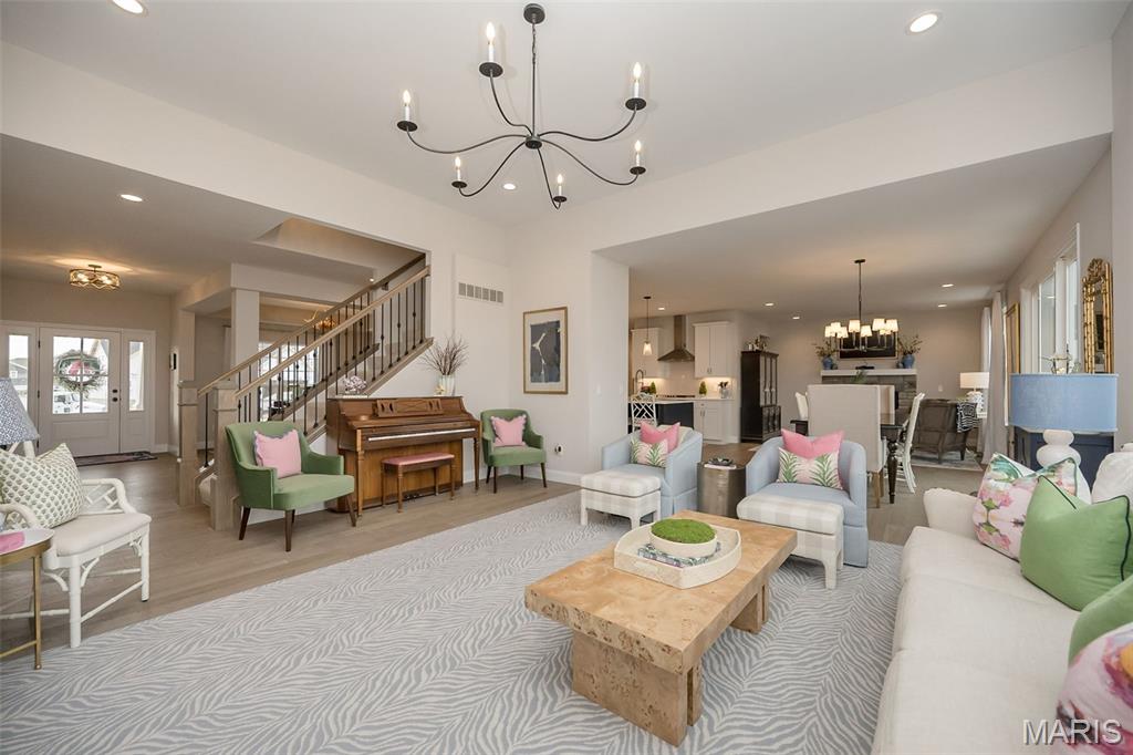 This Designer Series Muirfield model blends sophisticated style with functional luxury. This 4-bedroom, 3.5-bath home features a stunning Great Room with 11' ceilings, transom windows, and a stone fireplace. The kitchen is fully equipped for the home chef, featuring a professional gas cooktop with a dedicated stainless steel hood, built-in wall ovens, and a high-performance French door refrigerator. Thoughtful details like under-cabinet task lighting, a deep farmhouse-style sink with a pull-down sprayer, and a stylish subway tile backsplash make this space as practical as it is beautiful. Whether hosting a casual brunch at the breakfast bar or preparing a multi-course dinner, this kitchen is designed to impress.The main floor Owner’s Suite is a true sanctuary, anchored by a spa-inspired primary bath that rivals any five-star retreat. This expansive space features striking Calacatta-style porcelain tile that flows seamlessly from the floors to the deck of the deep soaking tub and into the shower. Situated under a large window, the tub offers a serene spot to unwind while flooding the room with natural light. The walk-in shower is a masterclass in modern design, featuring a heavy glass enclosure, floor-to-ceiling tiling, and sleek matte black fixtures that provide a sharp, contemporary contrast. This bold hardware is echoed in the expansive double vanity, which boasts deep navy cabinetry for a sophisticated pop of color against the neutral walls. Vaulted ceilings add an airy, architectural dimension to the room, while a massive expanded walk-in closet ensures that storage is never an afterthought. Every detail here is curated for ultimate relaxation and style. Elevate your lifestyle in the versatile step-up bonus room, a bright and airy retreat designed for relaxation or play. Large, sun-drenched windows offer expansive views of the neighborhood while filling the space with natural light.This flexible living area features plush carpeting and a modern ceiling fan, making it the perfect spot for a cozy media room, a quiet home office, or a dedicated play space. Its unique elevated position provides a sense of privacy while staying connected to the home's main levels via the elegant wrought-iron staircase. Whether you're hosting a movie night or seeking a peaceful afternoon escape, this bonus room is a true standout feature. Additional highlights include a 3-car garage, smart upgrades like a full irrigation system, Aprilaire humidifier, and smart thermostats ensure modern comfort. The exterior is equally impressive, featuring white shake siding, Pewter Mist stone, and professional landscaping and expansive patio. Experience the ultimate in suburban luxury at Inverness, a premier master-planned community in Dardenne Prairie/O'Fallon. Designed with a "park-like" ambiance, this 106-acre development features 4 scenic lakes, explore over 30 acres of common ground, a meandering walking and biking trail system that connects intimate enclaves and pocket parks. Top-Tier Education in the highly-rated Wentzville School District, including Crossroads Elementary, Frontier Middle, and Liberty High School.