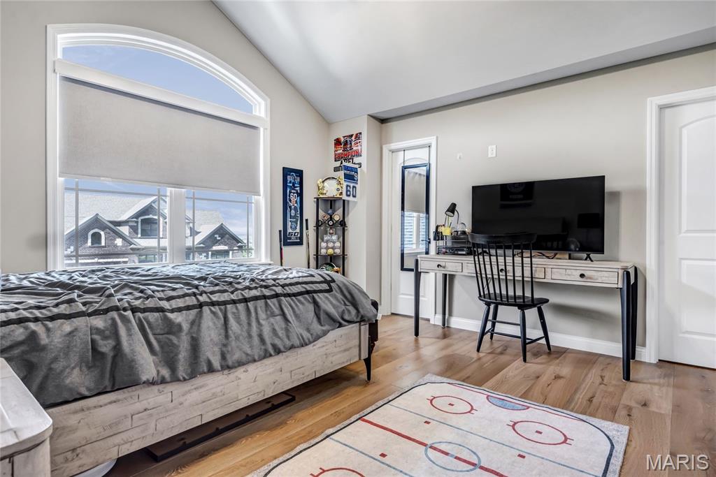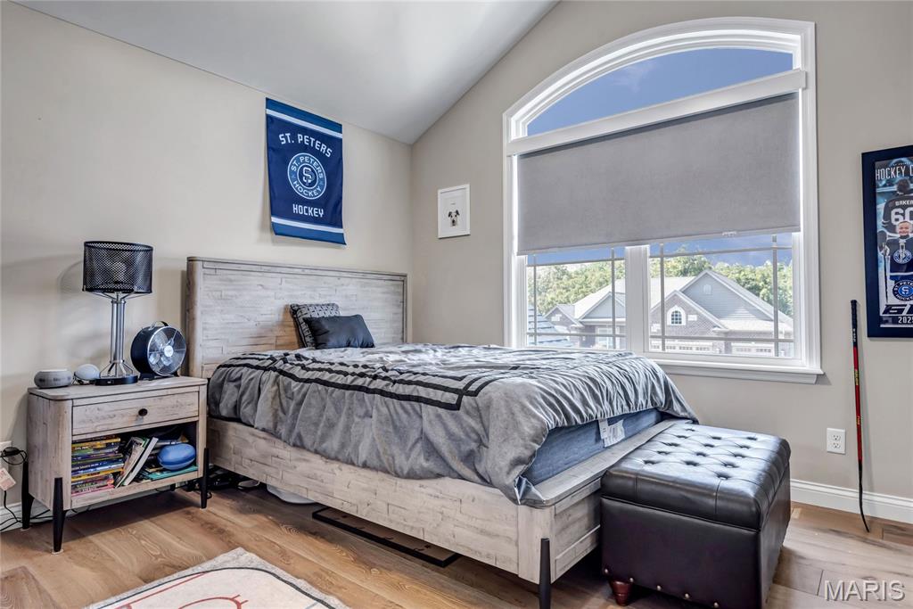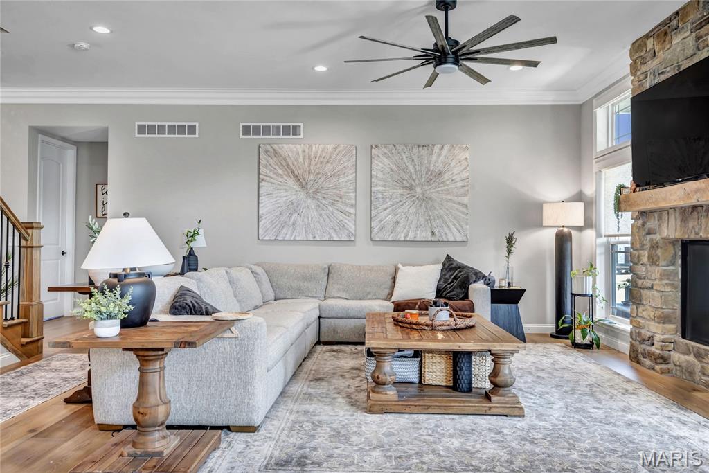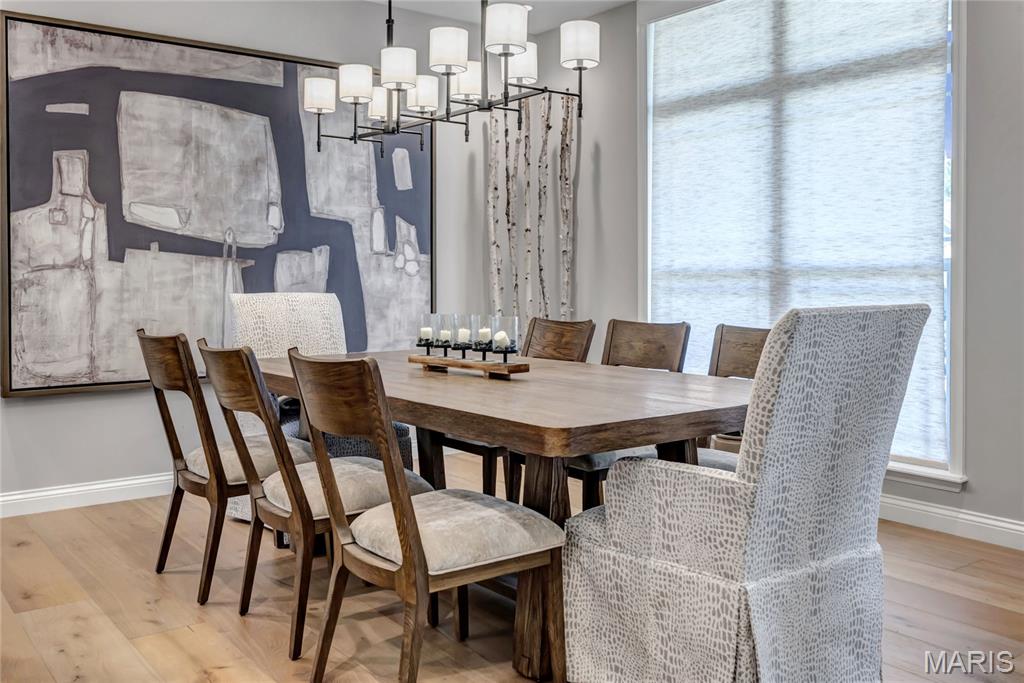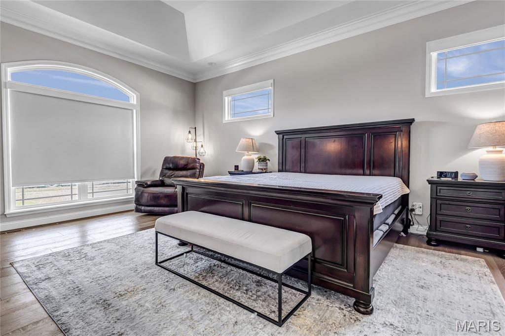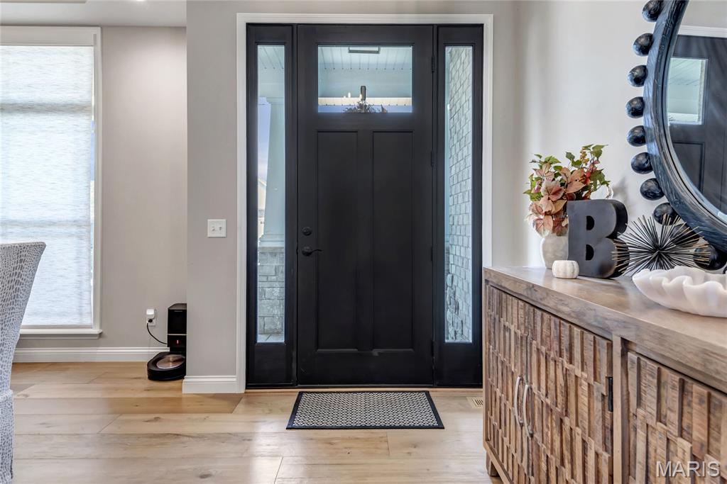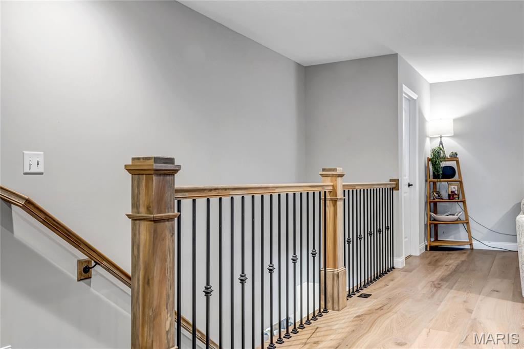 Luxury living in this quant and private subdivision of only 30 Executive Homes built convenient to downtown, Boeing, Amazon headquarters and STL airport. Soaring ceilings and stone fireplace surround just past the wood stairs w/wrought iron spindles will be the first thing to catch your eye as you walk in. This grand home built in 2023 by an esteemed custom home builder that only builds small select communities. Coffered ceiling dining room w/recessed lighting, 8’ doors throughout main level, along w/wide planked engineered wood flooring, crown molding and wall of transom windows on the back of home. All shades are remote controlled. Kitchen has all the bells w/large walk-in pantry, staggered white cabinets, quartz counters & on large island, pendant lighting, under-mount lighting, classy porcelain backsplash, 2-tone stainless appliances including 6-burner gas cooktop & vented hood. Beverage station has wine fridge and rinse sink. Mud room is large w/window and slop sink. Plenty of area to toss your coats & shoes w/bench and coat rack near 3-car garage entry also main coat closet near front foyer. Primary bedroom on main level has coffered ceiling, palladium window, gorgeous bath w/floor to ceiling tiled shower w/rain shower head, soaking tub, dbl vanities, natural stone flooring and 2 closets. Upper level sports a large bonus room and 3 bedrooms one with vaulted ceiling all with walk-in closets. 2 beds have private baths & 1 has a jack-n-jill bath. See-thru gas fireplace adjoins the backyard for chilling in the covered patio area or entertaining guest by watching the football game outside. Dual Zoned, Sprinkler system, 9'pour basement w/rough-in unfinished and ready for your plans.