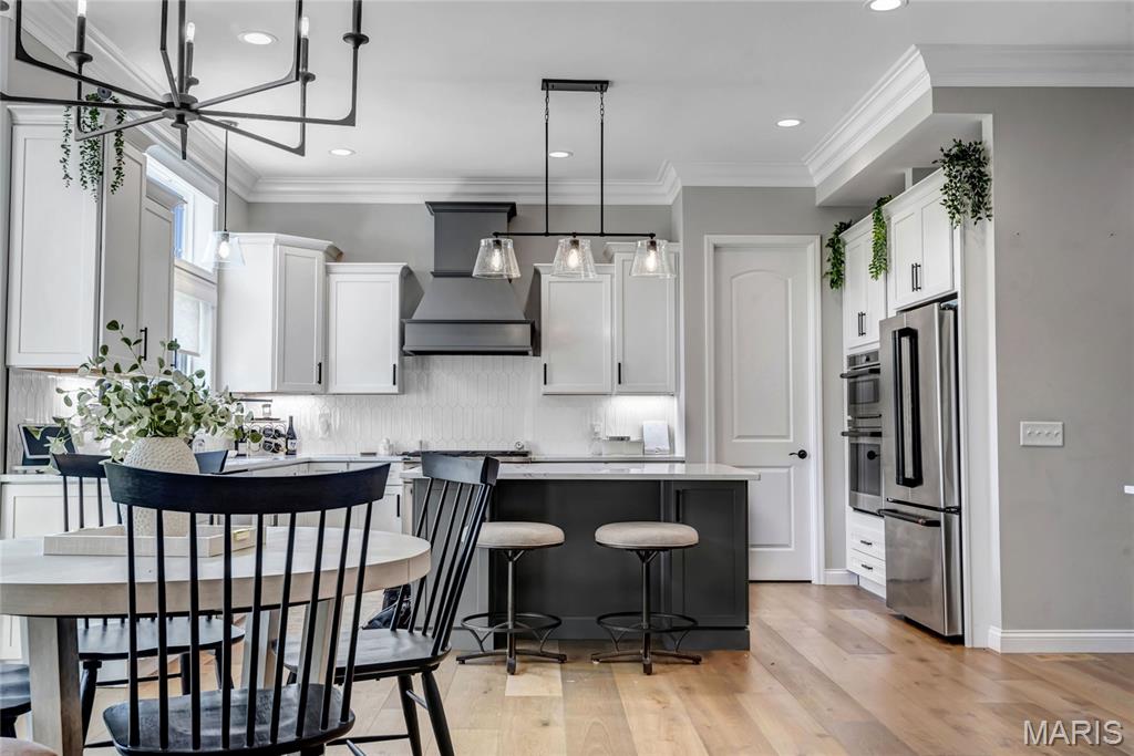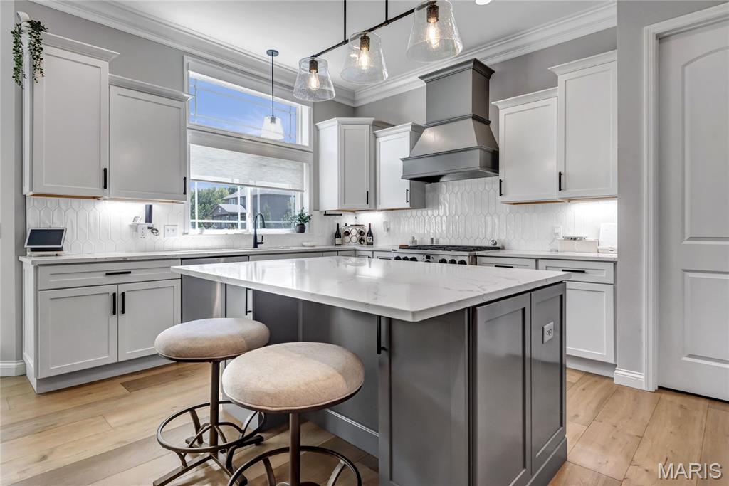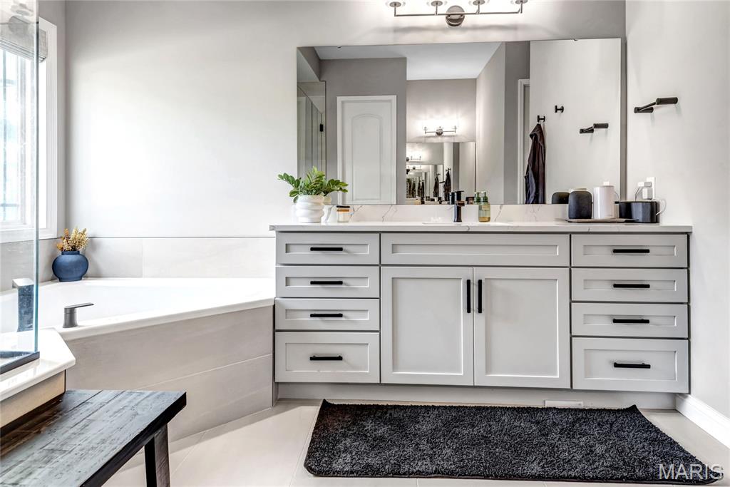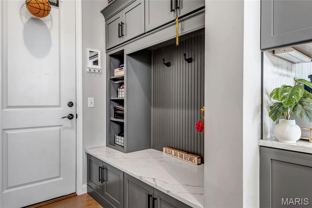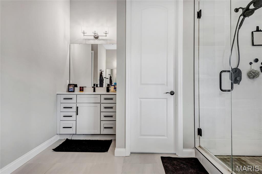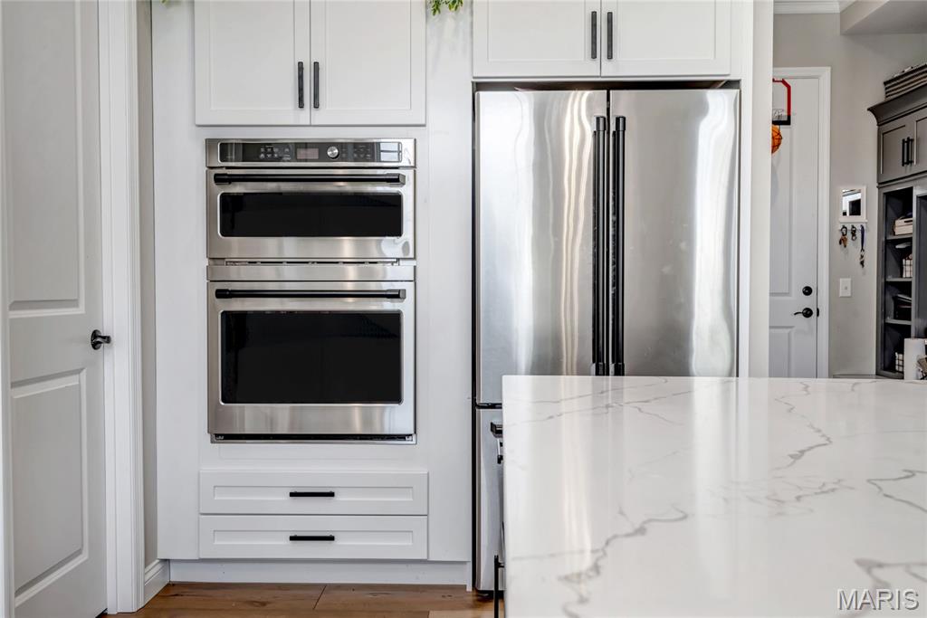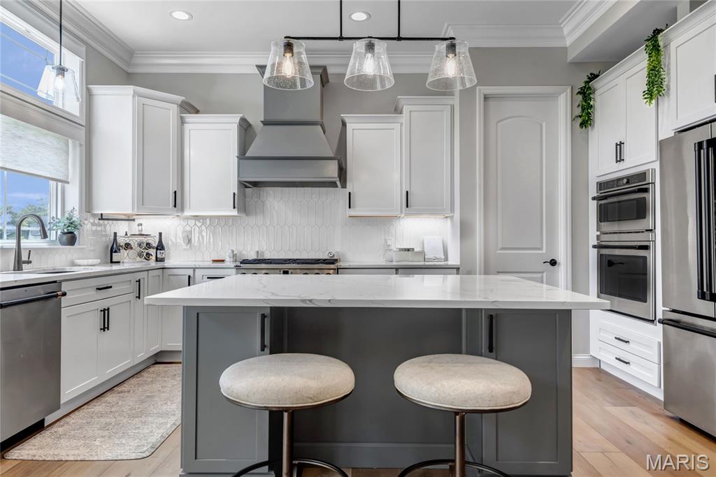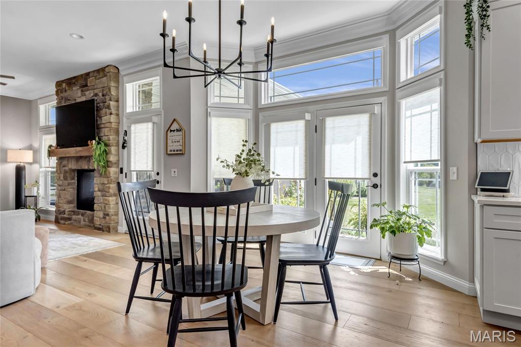 Luxury living in this quant and private subdivision of only 30 Executive Homes built convenient to downtown, Boeing, Amazon headquarters and STL airport. Soaring ceilings and stone fireplace surround just past the wood stairs w/wrought iron spindles will be the first thing to catch your eye as you walk in. This grand home built in 2023 by an esteemed custom home builder that only builds small select communities. Coffered ceiling dining room w/recessed lighting, 8’ doors throughout main level, along w/wide planked engineered wood flooring, crown molding and wall of transom windows on the back of home. All shades are remote controlled. Kitchen has all the bells w/large walk-in pantry, staggered white cabinets, quartz counters & on large island, pendant lighting, under-mount lighting, classy porcelain backsplash, 2-tone stainless appliances including 6-burner gas cooktop & vented hood. Beverage station has wine fridge and rinse sink. Mud room is large w/window and slop sink. Plenty of area to toss your coats & shoes w/bench and coat rack near 3-car garage entry also main coat closet near front foyer. Primary bedroom on main level has coffered ceiling, palladium window, gorgeous bath w/floor to ceiling tiled shower w/rain shower head, soaking tub, dbl vanities, natural stone flooring and 2 closets. Upper level sports a large bonus room and 3 bedrooms one with vaulted ceiling all with walk-in closets. 2 beds have private baths & 1 has a jack-n-jill bath. See-thru gas fireplace adjoins the backyard for chilling in the covered patio area or entertaining guest by watching the football game outside. Dual Zoned, Sprinkler system, 9'pour basement w/rough-in unfinished and ready for your plans.