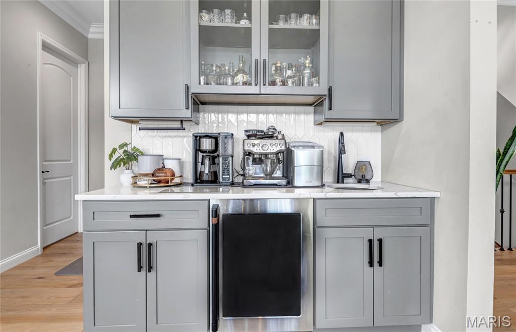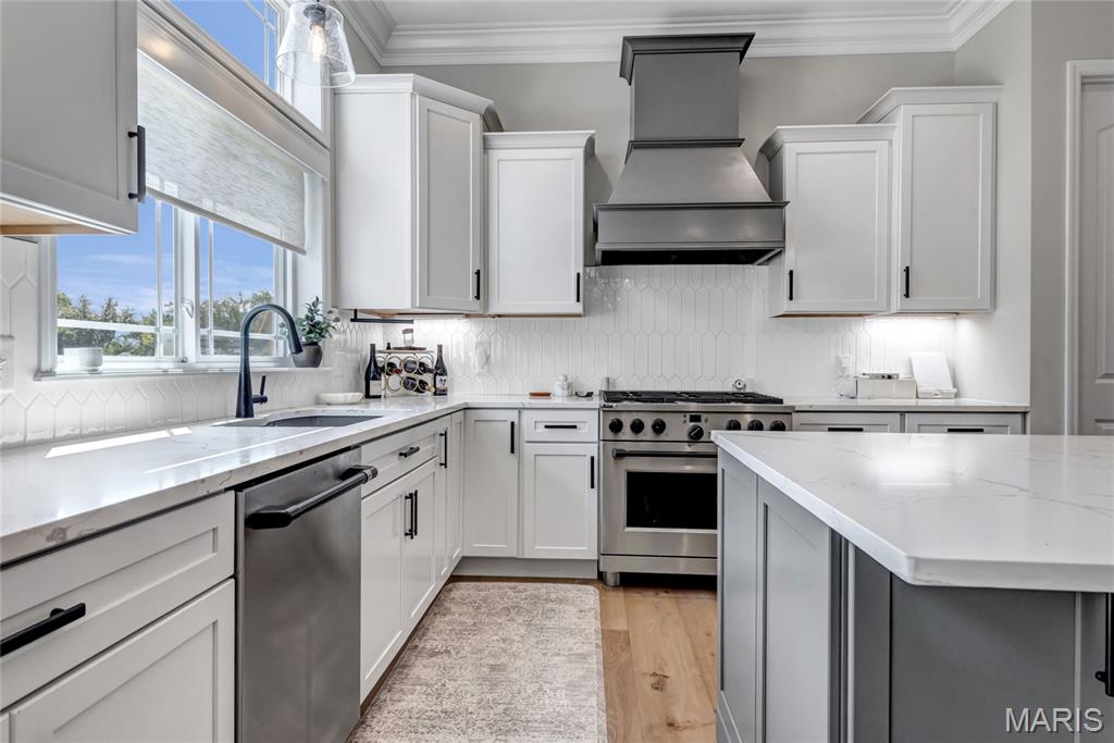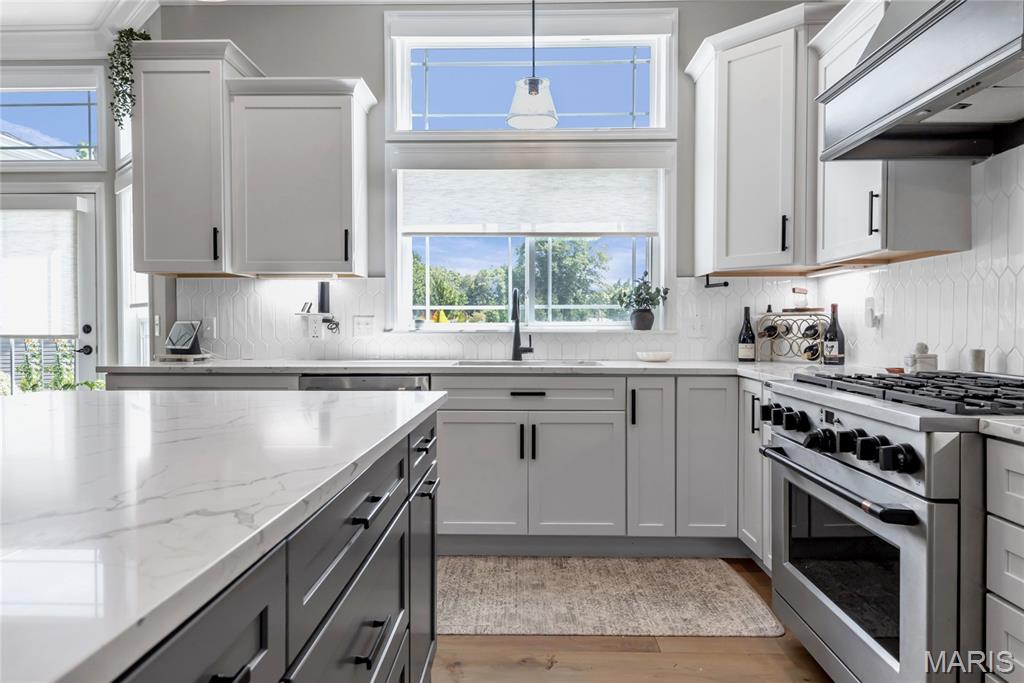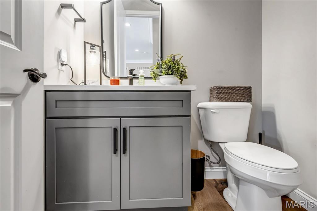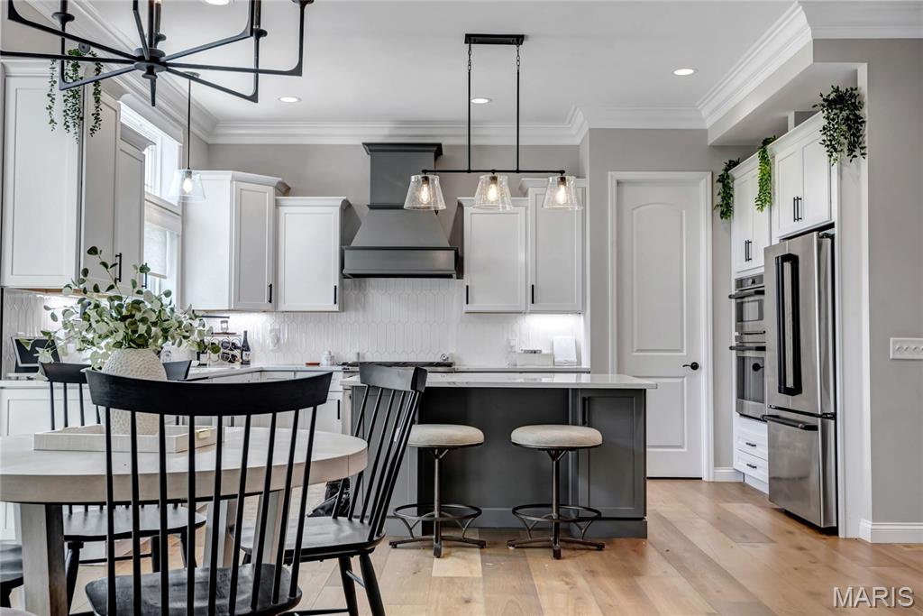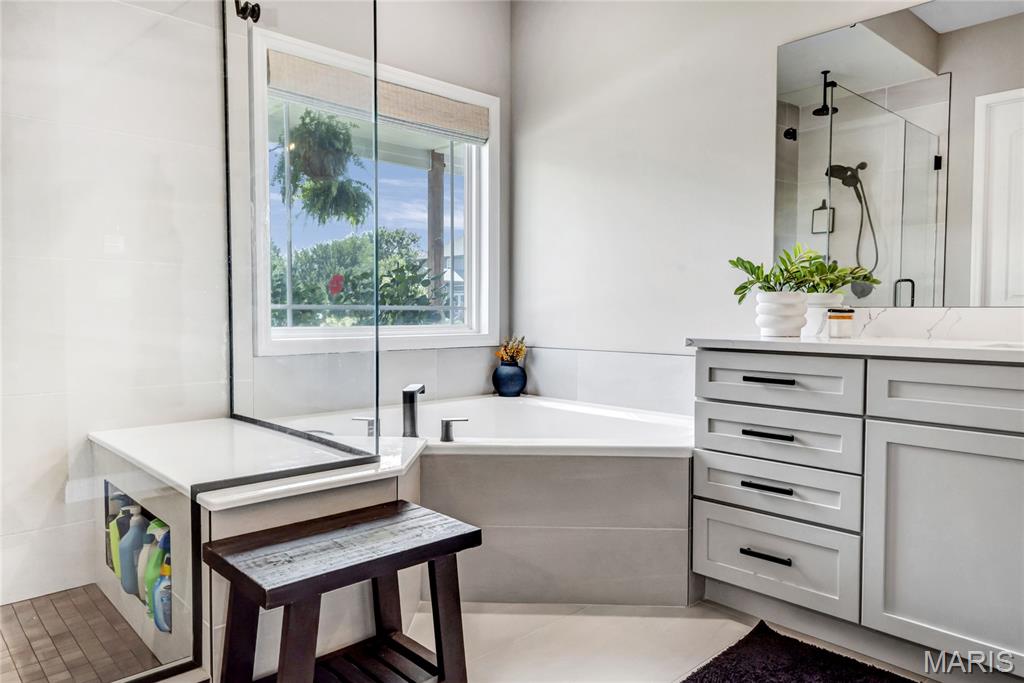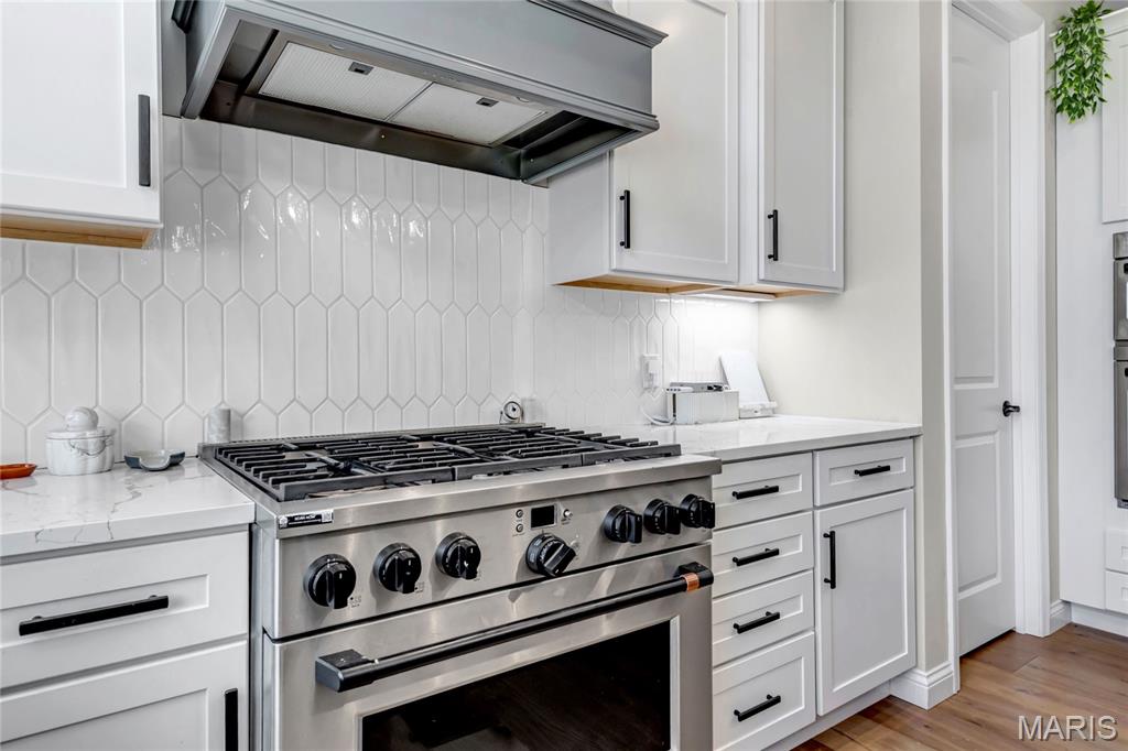 Luxury living in this quant and private subdivision of only 30 Executive Homes built convenient to downtown, Boeing, Amazon headquarters and STL airport. Soaring ceilings and stone fireplace surround just past the wood stairs w/wrought iron spindles will be the first thing to catch your eye as you walk in. This grand home built in 2023 by an esteemed custom home builder that only builds small select communities. Coffered ceiling dining room w/recessed lighting, 8’ doors throughout main level, along w/wide planked engineered wood flooring, crown molding and wall of transom windows on the back of home. All shades are remote controlled. Kitchen has all the bells w/large walk-in pantry, staggered white cabinets, quartz counters & on large island, pendant lighting, under-mount lighting, classy porcelain backsplash, 2-tone stainless appliances including 6-burner gas cooktop & vented hood. Beverage station has wine fridge and rinse sink. Mud room is large w/window and slop sink. Plenty of area to toss your coats & shoes w/bench and coat rack near 3-car garage entry also main coat closet near front foyer. Primary bedroom on main level has coffered ceiling, palladium window, gorgeous bath w/floor to ceiling tiled shower w/rain shower head, soaking tub, dbl vanities, natural stone flooring and 2 closets. Upper level sports a large bonus room and 3 bedrooms one with vaulted ceiling all with walk-in closets. 2 beds have private baths & 1 has a jack-n-jill bath. See-thru gas fireplace adjoins the backyard for chilling in the covered patio area or entertaining guest by watching the football game outside. Dual Zoned, Sprinkler system, 9'pour basement w/rough-in unfinished and ready for your plans.