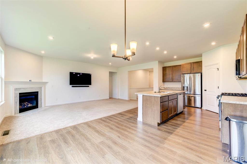 GRAB THIS GREAT BARGIN TODAY!! WHY WAIT TO BUILD?! PRICED TO SELL at over $10.000 BELOW INITIAL BUILDING COST PLUS BASEMENT FINISH AFTER PURCHASE. This Fischer Davinci ranch model home is in the sought-after Caledonia Subdivision. Home boasts open floorplan w/9 ft ceilings. Great room has lots of windows, canned lights & cozy gas fireplace. Gorgeous kitchen has 42" cabinets, massive island, stainless steel appliances, quiet close doors & drawers, canned lights, walk-in pantry & is an open floorplan giving the home social flow to the dining area & great room. Primary master suite has private luxury bath w/double sinks, large shower, private commode & walk-in closet that jack-n-jills to main floor laundry rm. 3rd bedroom is currently displayed as an office w/French doors, no current closet. Open carpeted stairwell to the finished lower level w/massive open 880 sq ft family room that could be split to add 4th bedroom w/egress window, full rough-in bath could add a 3rd full bathroom, high efficiency furnace & lots of natural light on multiple sides of the lower level. Awesome subdivision amenities that are walkable from the home to the clubhouse, pool, indoor exercise area w/equipment, pickleball courts, bocci ball area, playground, water features, walking trails & more. Highly rated Wentzville schools, convenient to restaurants, shopping, highways, parks & businesses. QUICK CLOSING AVAILABLE!