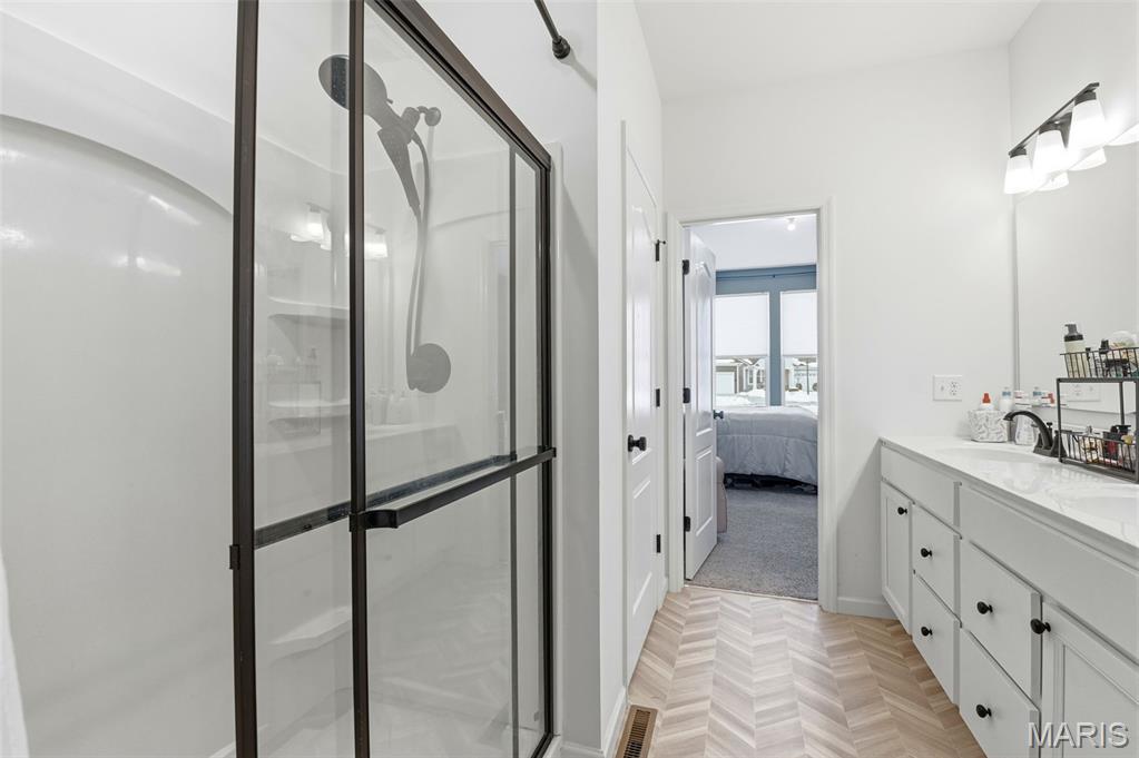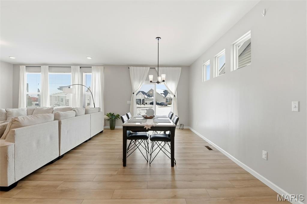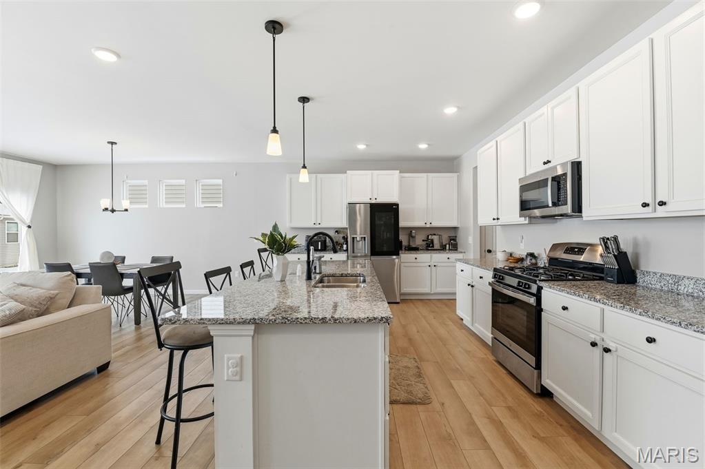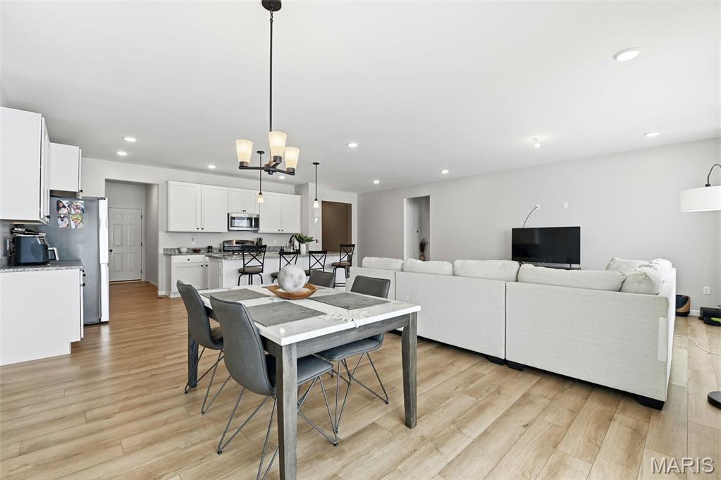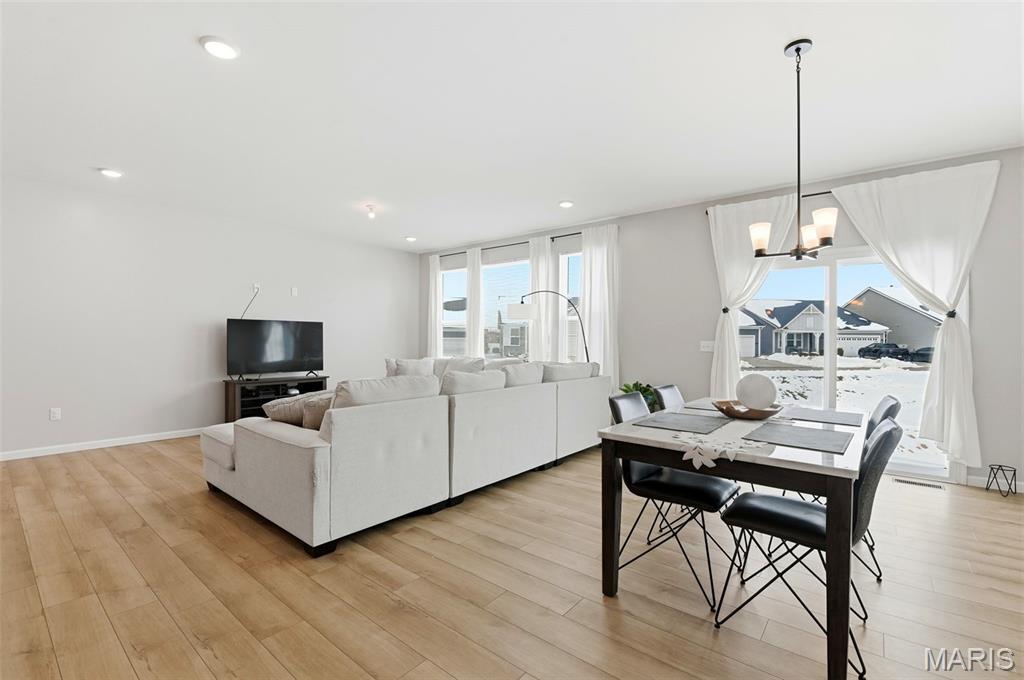 Beautiful ranch home in St Peters Village Point community, built just 3 years ago. Open floor plan, kitchen island with sink, stainless appliances, granite tops, pantry, and huge windows drench the large family room/kitchen/dining room space with sunlight. Huge primary suite with 2-sink bath, spacious enclosed shower and luxurious walk-in closet. Main floor laundry room. Unfinished basement with full bath rough-in. Enjoy back patio with level backyard and common ground access.