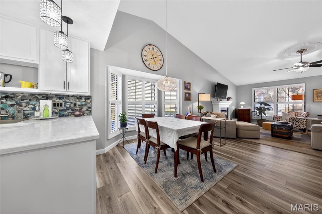 Let’s get you in to see it before someone else grabs this deal! Welcome to this contemporary end-unit Ranch Villa offering two spacious bedrooms, an updated luxury bath, over-sized, insulated and drywalled one-car garage with plenty of storage. The open-concept floor plan is emersed with natural light, showcasing a vaulted ceiling which encapsulates the oversized living room providing warmth and ambiance from an electric "free - standing" fireplace. Vaulted dining area encased by a large bay window provides an abundance of natural light perfect for everyday living and entertaining. New full glass door with contemporary side light! The updated kitchen features all-new cabinetry, counter depth new refrigerator, stainless steel appliances, a breakfast bar, oversize pantry, and a updated sliding door leading to the private patio. Enjoy outdoor relaxation in your fully fenced patio with a 6-ft privacy fence, gated access, and a serene rock-landscaped oasis. The spacious primary suite is a true retreat, featuring a " walk in" ample closet, updated, spa-like bath with garden tub, separate shower, dual sinks, two entry doors and tiled flooring. A main-floor laundry room with cabinets adds everyday convenience and direct access to garage. Additional highlights include an all-electric home, upgrade vinyl plank, plantation shutters, washer, dryer, and refrigerator included, new water heater (2023), ample storage throughout, and HOA dues that cover water and trash. Enjoy access to the subdivision pool and a prime location with quick highway and shopping access, yet peacefully tucked away in a tree-lined cul-de-sac with green space.
