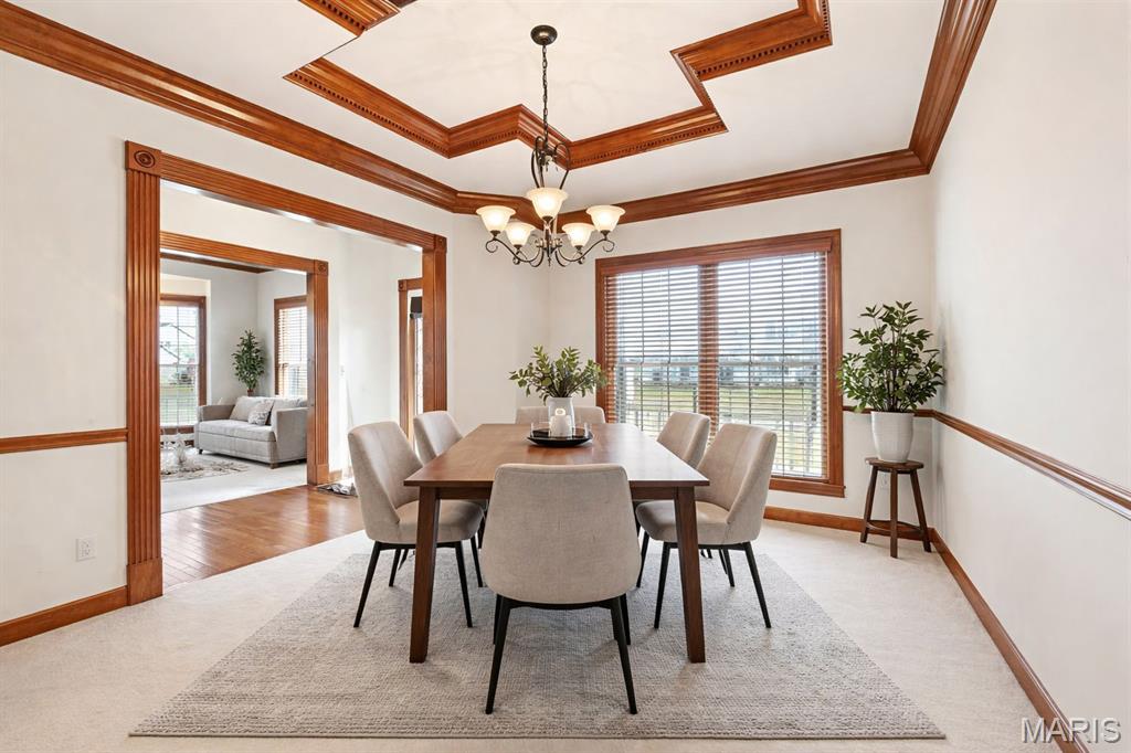 Step into this beautifully crafted two-story home where timeless design and exceptional woodwork take center stage. Just off the foyer, a bright sitting area with bay windows creates the perfect space to relax and unwind. The formal dining room is a true showpiece, featuring a breathtaking coffered ceiling and exquisite craftsmanship. In the living room, a stunning ventless gas fireplace is framed by custom built-in shelving, creating a warm and inviting focal point. The kitchen was thoughtfully designed with custom, taller-than-standard cabinetry, a large statement island ideal for gathering, and an oversized walk-in pantry. Just off the kitchen and garage, you’ll appreciate the spacious mudroom for added convenience. The insulated garage includes a utility sink, perfect for projects or clean-up. Upstairs, French doors lead into the impressive primary suite, highlighted by vaulted ceilings and a striking wood beam that runs the length of the room. The en-suite bath and generous layout create a true retreat. All bedrooms are above average in size and feature walk-in closets, offering plenty of storage and space. The walk-out basement expands your living area with finished space and a full bath. Two framed-in windows and a partially finished room provide excellent potential for a fifth bedroom or additional flex space. Step outside from the kitchen onto the freshly stained covered deck. Below, the patio has been extended the full length of the home, creating incredible space for entertaining. The fenced, flat backyard sits on one of the larger corner lots in the subdivision and includes a double gate on one side and an additional gate on the other for easy access. A sprinkler system keeps the lawn lush, and the front flower beds are already equipped with misters for added convenience. The roof is only roughly 4 years old. Exceptional craftsmanship, thoughtful upgrades, and outstanding outdoor living space make this home truly stand out.