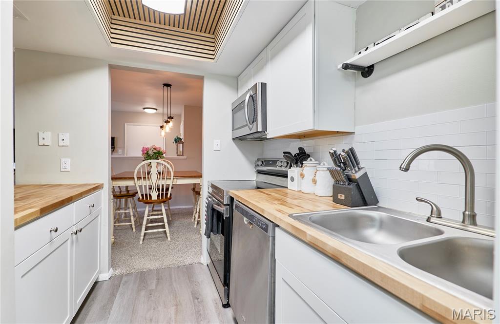 Move-in ready ground-floor condo featuring 2 bedrooms and 1 full bath in a convenient central location. Major updates were completed in 2022, including fresh interior paint, new carpet, remodeled kitchen with stainless steel appliances and butcher block countertops, and an updated bathroom with new vanity and toilet. The open floor plan connects the living room, dining area, and kitchen, creating a comfortable space for everyday living and entertaining. Large windows provide abundant natural light, and the private balcony with storage offers a quiet place to relax. From the living room you can see the community pool just a short walk away. The primary bedroom includes private access to the bathroom. Oversized laundry closet with washer and dryer hookups and shelving, plus an additional hallway linen closet for extra storage. Basement storage locker also included. One assigned parking space directly in front of the building. HOA fee covers water, sewer, trash, lawn care, snow removal, and community pool access. One dog allowed up to 30 lbs. Ground level unit located in a suburban setting close to shopping, dining, and daily conveniences.