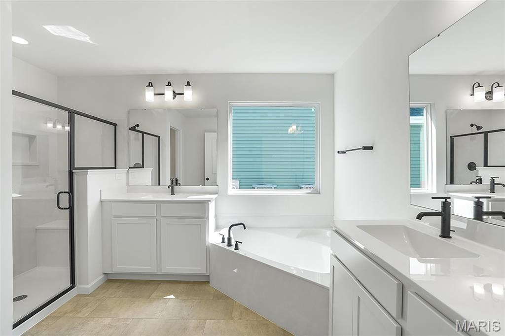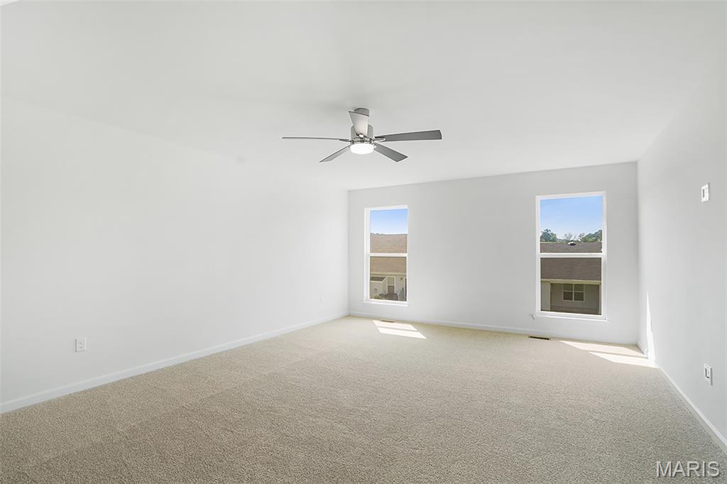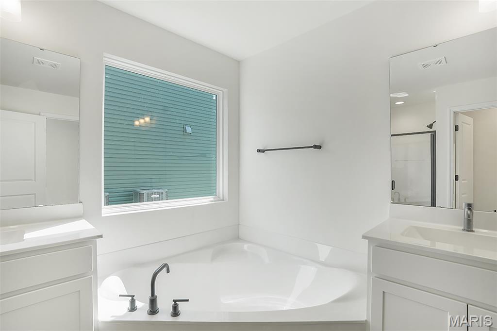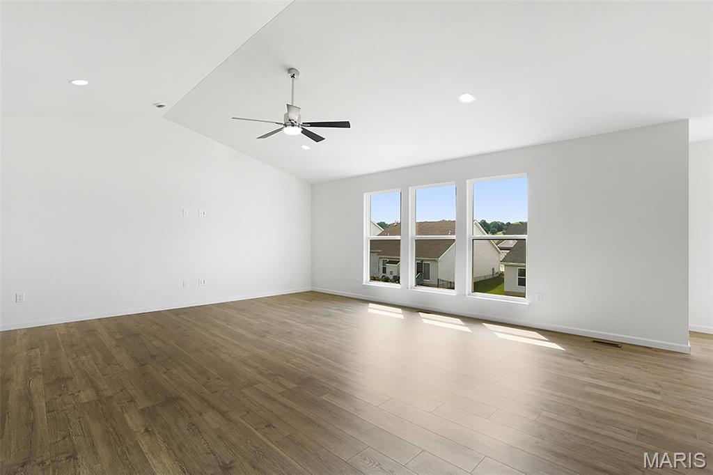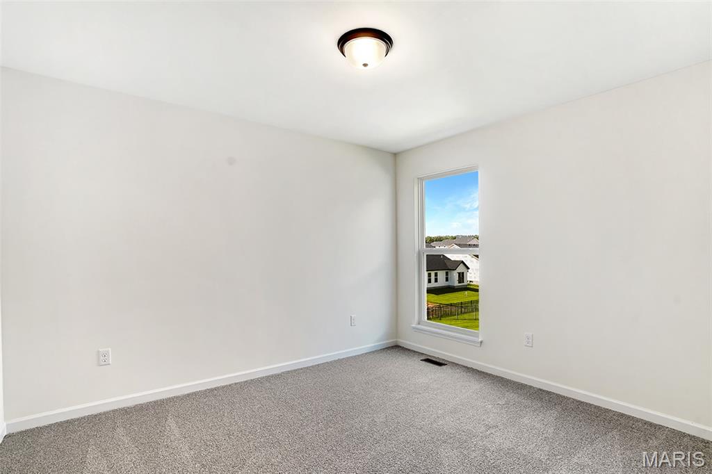 New McBride Homes Maple Expanded ranch 3BR, 2BA, ready this summer! Rustic Farmhouse exterior! This home has a 3-CAR GARAGE, open floor plan w/vaulted ceilings, living rm w/ceiling fan, 6’ windows, & wood laminate flooring in the main living area. The kitchen has Landen Burlap 42” cabinets, lg center sq. island w/breakfast bar, quartz countertops, & stainless GE appliances. The master suite has a ceiling fan, walk in closet, & private bathroom w/a corner tub w/window, shower w/seat, dual vanities, & private toilet rm. 2 more BRs w/ceiling fan prewires, 2nd full bath, & main floor laundry add convenience. Upgrades include 2 panel interior doors, garage coachlights, LL ¾ bath rough-in & more. Langeneckert Farm offers beautiful new homes in Mehlville with convenient access to shopping, dining, parks, and major highways for easy commuting throughout St. Louis County. Enjoy peace of mind with McBride Homes’ 10 year builders warranty & incredible customer service! Similar photos shown.