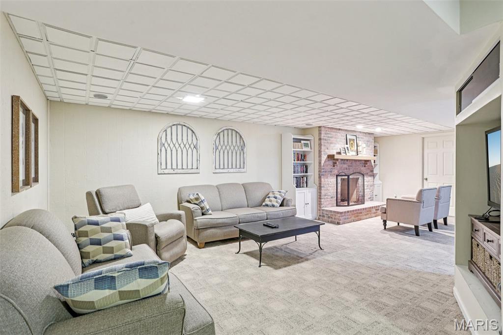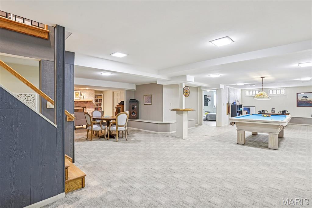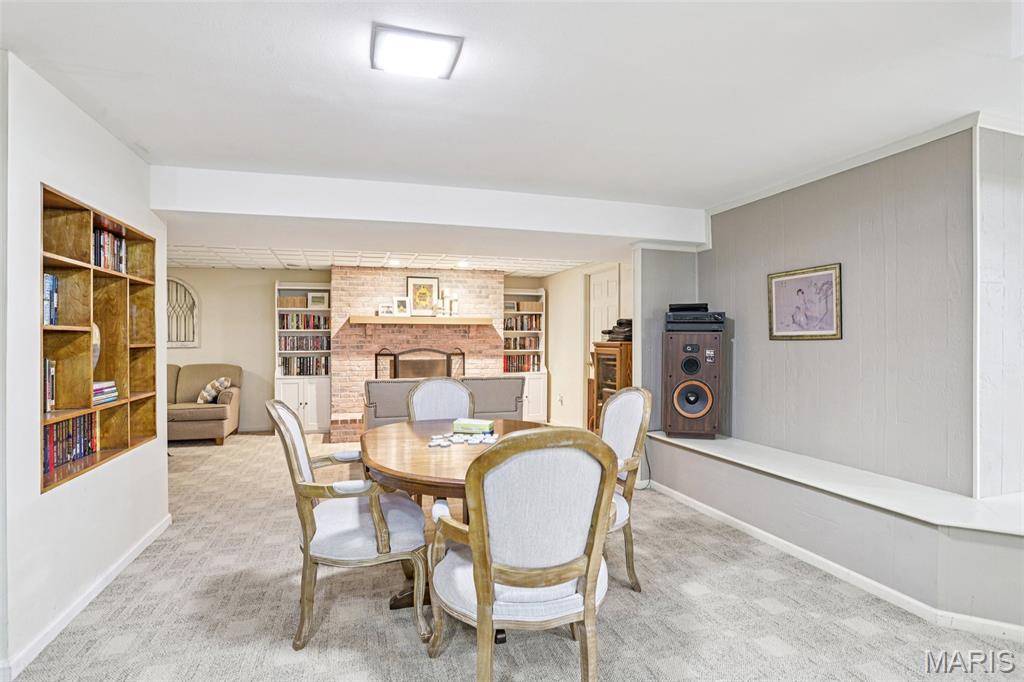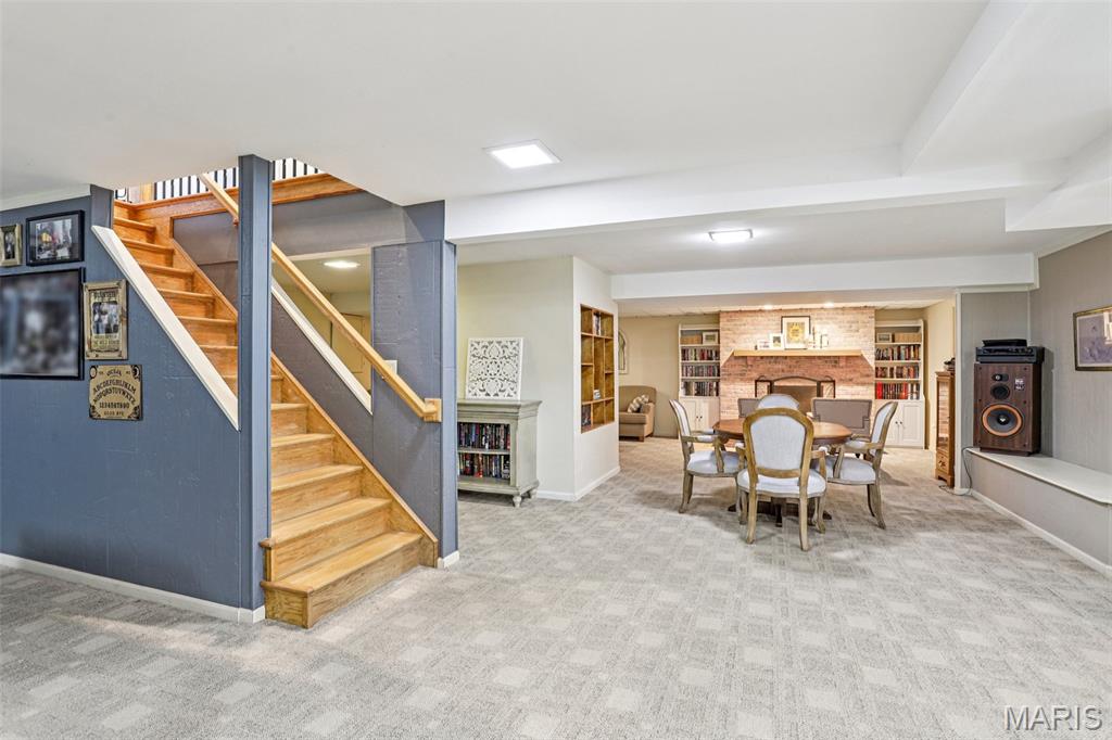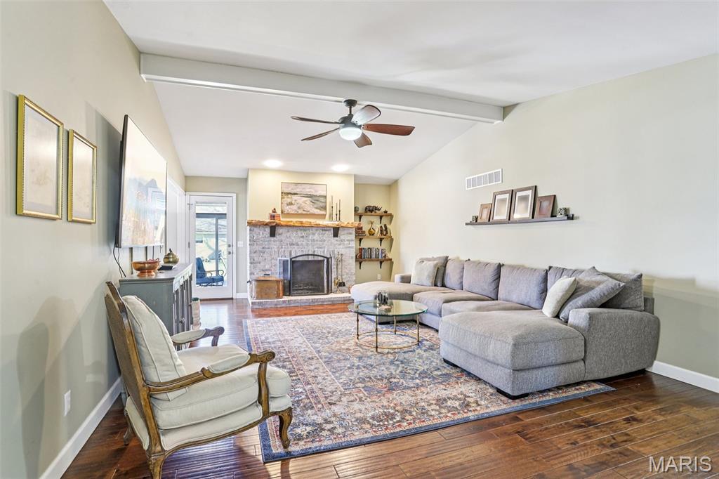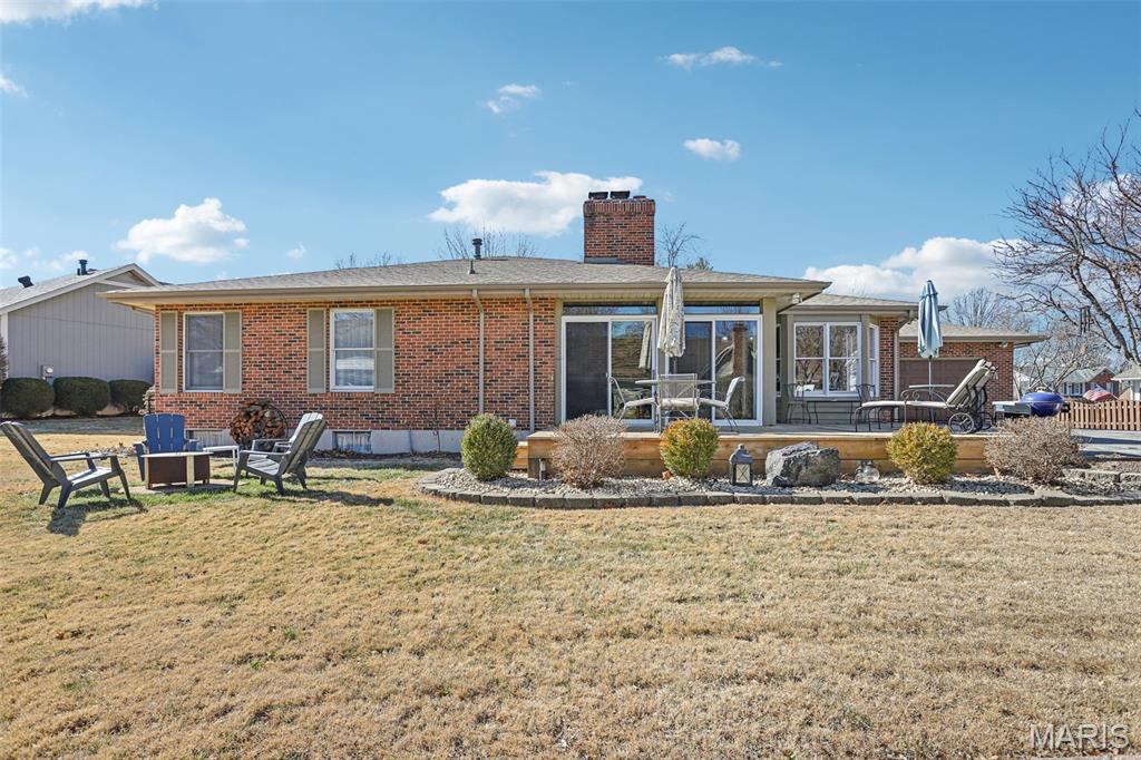 OPEN HOUSE 3/7 11-2pm. Spacious 4-bedroom, 3 bath full-brick ranch in established St Charles neighborhood offering over 4,000 sq ft of finished living space and true main-floor living. The main level features 3 bedrooms, 2 full baths, hardwood flooring, crown molding, and multiple living areas including a vaulted family room with exposed beam and wood-burning fireplace. The kitchen offers granite countertops, stainless appliances, tile backsplash, abundant cabinetry, and opens to a bright breakfast bay, with formal living and dining rooms providing flexible entertaining space. The finished lower level significantly expands the home with a large recreation area, full brick fireplace with built-ins, dedicated media/lounge space, 4th bedroom, full bath, additional flex room, and generous storage. A spacious sunroom overlooks the deck and flat backyard with mature trees, creating ideal indoor-outdoor flow. Located minutes from Highway 370, shopping, dining, Boeing, and Historic Main Street St. Charles, this home combines square footage, classic construction, and a prime location in one of St. Charles’ established neighborhoods.