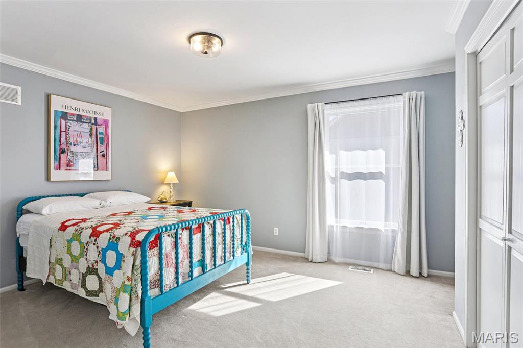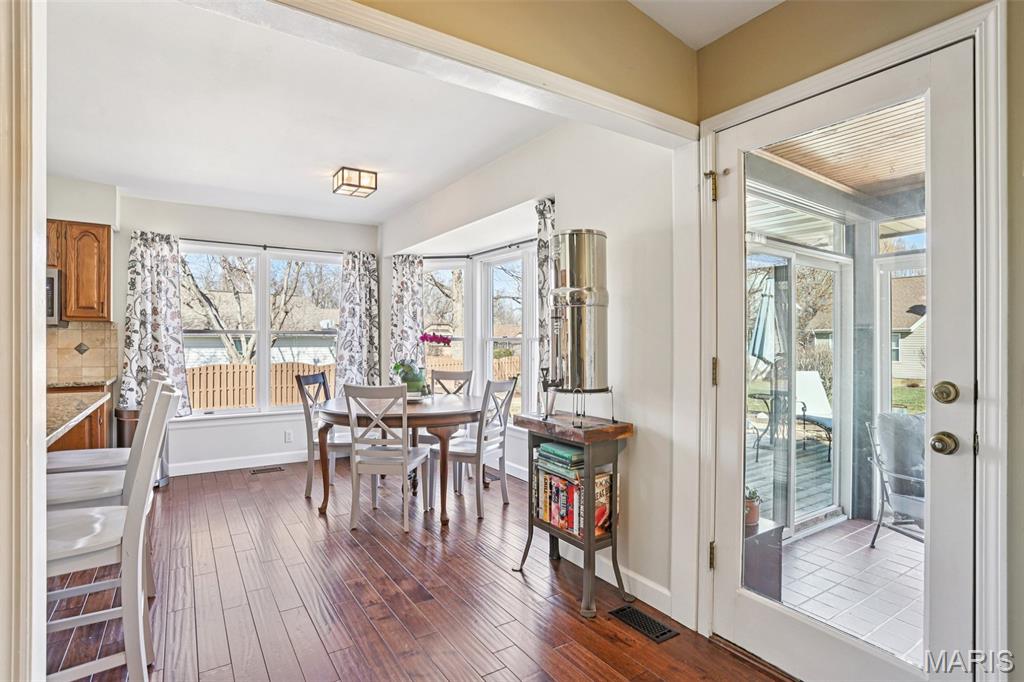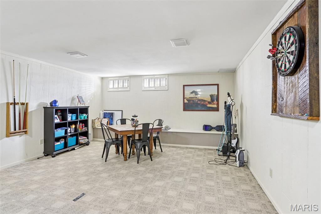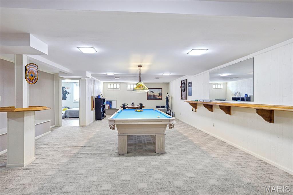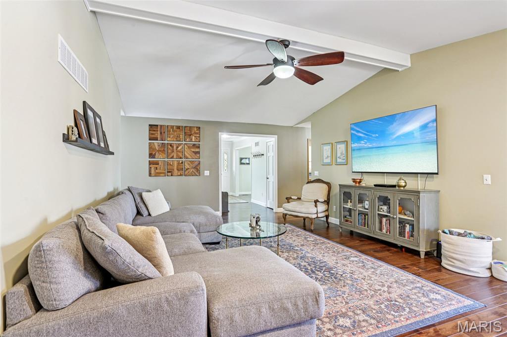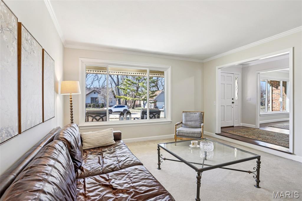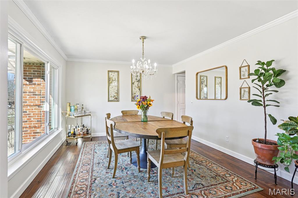 OPEN HOUSE 3/7 11-2pm. Spacious 4-bedroom, 3 bath full-brick ranch in established St Charles neighborhood offering over 4,000 sq ft of finished living space and true main-floor living. The main level features 3 bedrooms, 2 full baths, hardwood flooring, crown molding, and multiple living areas including a vaulted family room with exposed beam and wood-burning fireplace. The kitchen offers granite countertops, stainless appliances, tile backsplash, abundant cabinetry, and opens to a bright breakfast bay, with formal living and dining rooms providing flexible entertaining space. The finished lower level significantly expands the home with a large recreation area, full brick fireplace with built-ins, dedicated media/lounge space, 4th bedroom, full bath, additional flex room, and generous storage. A spacious sunroom overlooks the deck and flat backyard with mature trees, creating ideal indoor-outdoor flow. Located minutes from Highway 370, shopping, dining, Boeing, and Historic Main Street St. Charles, this home combines square footage, classic construction, and a prime location in one of St. Charles’ established neighborhoods.