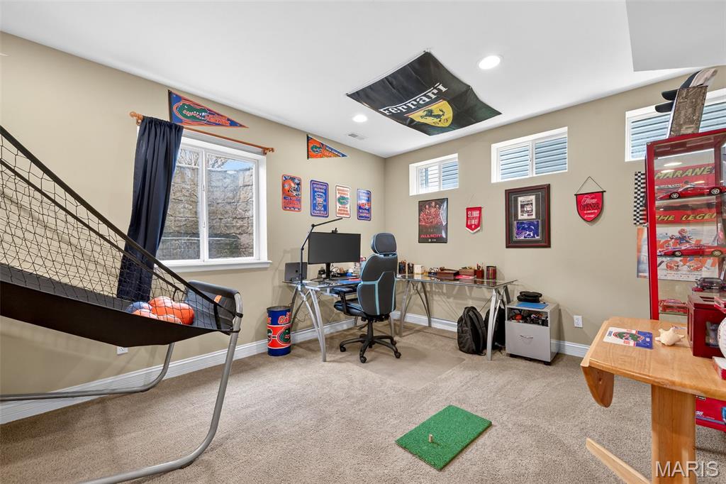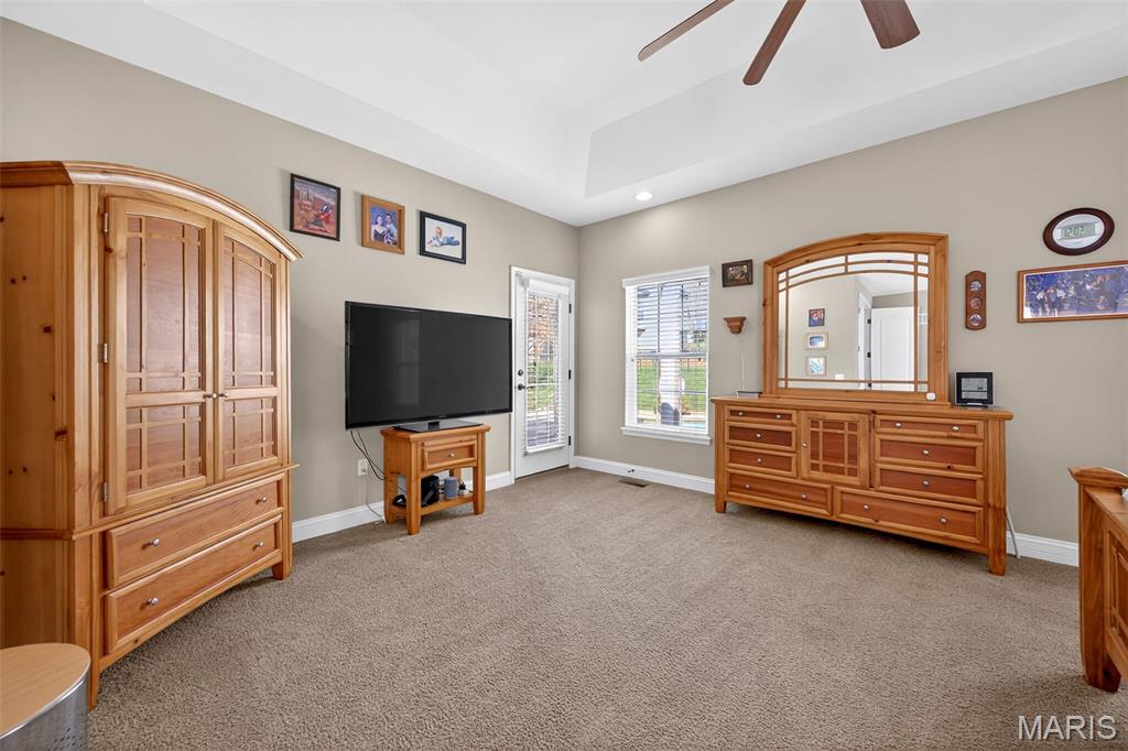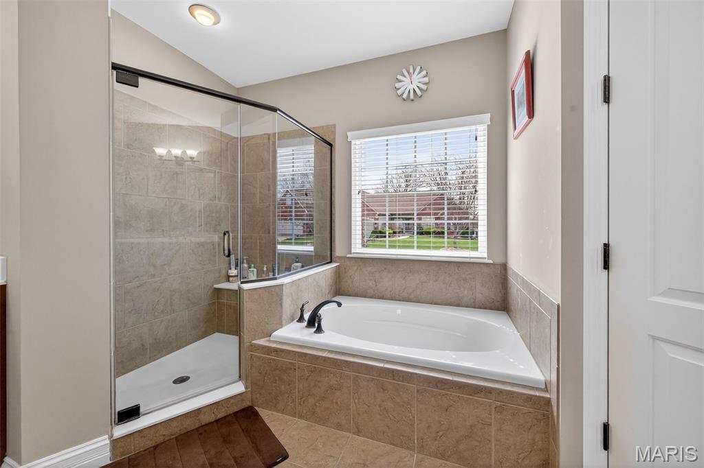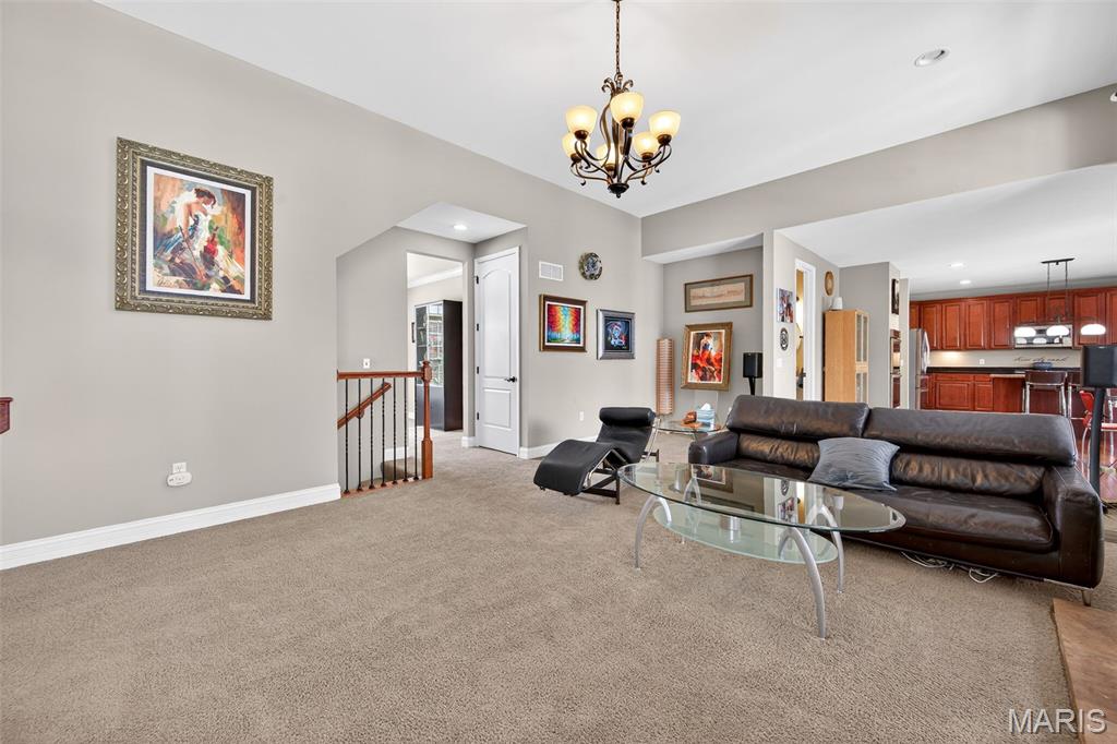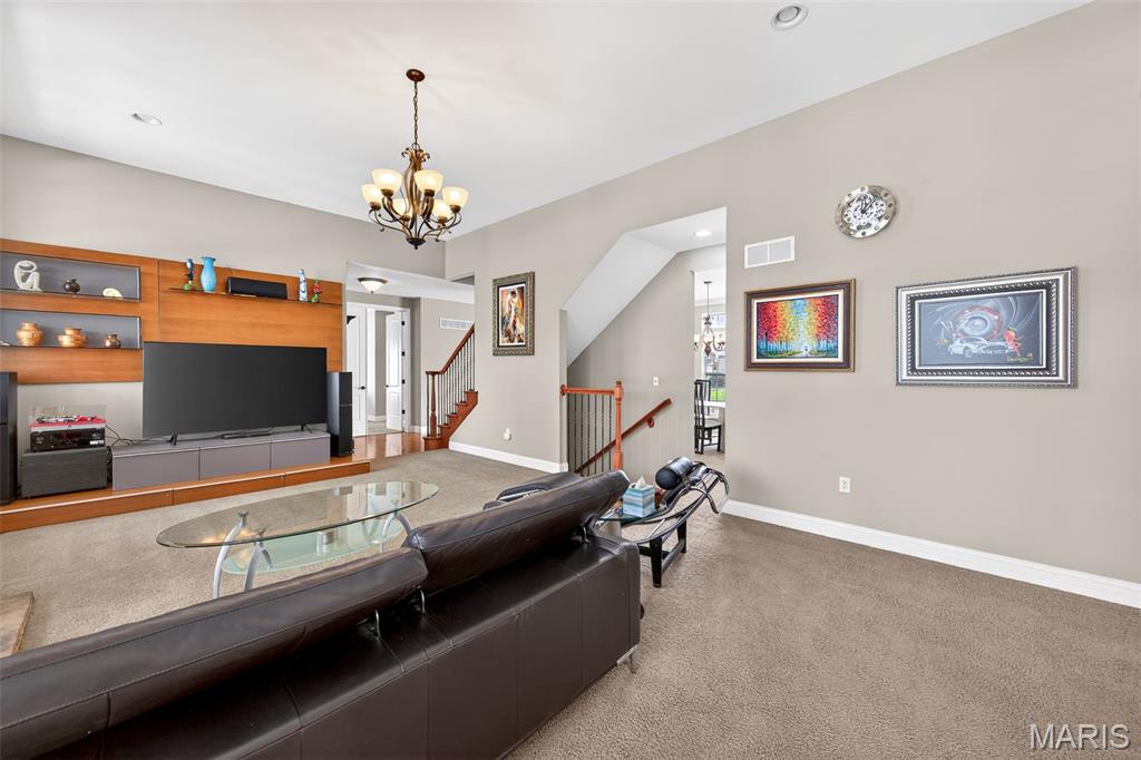Stunning luxury 1.5-story home in Ft. Zumwalt West offering exceptional indoor-outdoor living and resort-style amenities. The backyard is truly a showpiece—featuring a heated in-ground saltwater pool, newer concrete decking, cover, pump, and salt cell, wrought iron fencing, and a covered patio with a dramatic see-through fireplace connecting seamlessly to the great room. Inside, the main level showcases a spacious great room with soaring 11’ ceilings, walls of windows, and a floor-to-ceiling stone fireplace that extends through to the outdoor living space. A formal dining room provides the perfect setting for entertaining. The chef’s kitchen is beautifully appointed with wood flooring, granite countertops, custom cabinetry with crown molding, abundant counter space, a large center island with overhang, gas range, new double wall oven, sink overlooking the backyard, and an oversized walk-in pantry. A convenient half bath and large laundry room with utility sink, hanging racks, and natural light complete the main level living area. The luxurious primary suite is privately situated on the main floor and features a sitting area, coffered ceiling, private patio access, dual walk-in closets, and a spa-like bath with vaulted ceiling, separate vanities, large soaking tub, oversized tiled shower with bench, and private water closet. Upstairs offers incredible flexibility with two generously sized bedrooms, both with walk-in closets, sharing a Jack-and-Jill bath with separate vanities, a fourth bedroom with large walk-in closet and private en suite bath, a secondary living area perfect for a family hangout space, and a spacious loft ideal for desks, study area, or playroom. The finished lower level expands the living space with egress window, large family room, recreation area with built-in wet bar (granite counters, tile flooring, bar seating), full bath, and a tiered theater room—equipment and furnishings negotiable. Additional highlights include a 3-car garage, new concrete driveway, newer roof, siding, facia, and subdivision amenities featuring a community pool and sports court. This home combines luxury, function, and exceptional entertaining space in one incredible package.