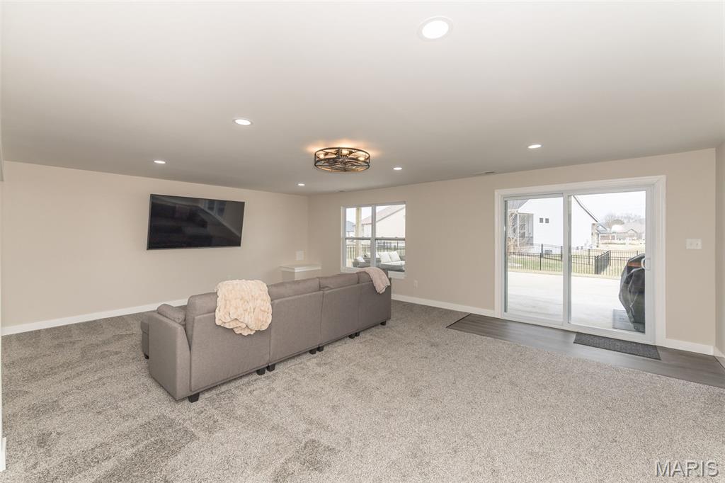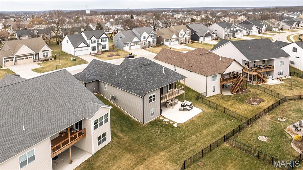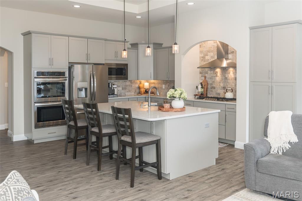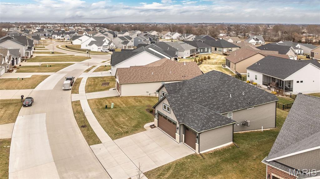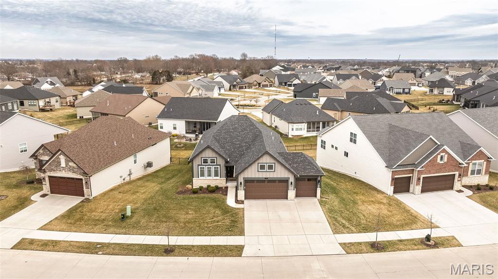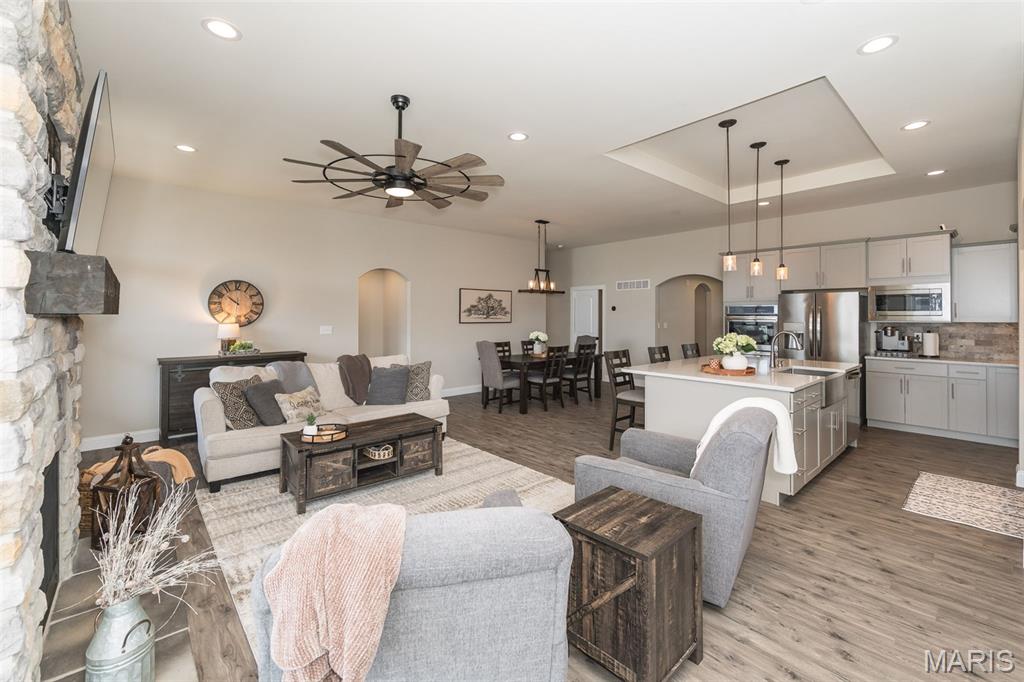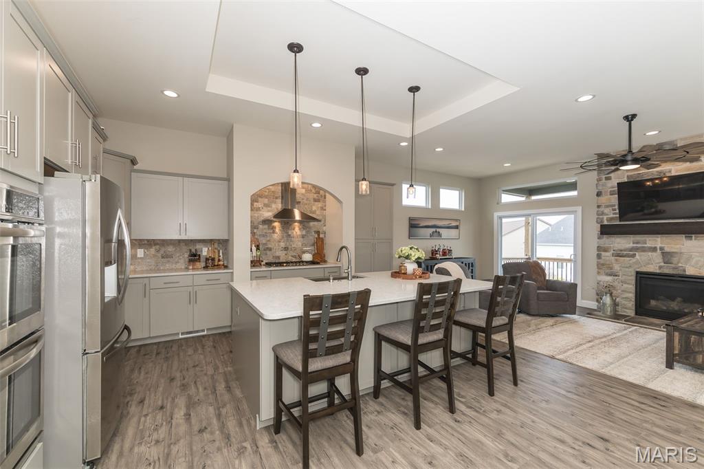 Stunning custom-built Berkshire floor plan by Lombardo Homes, just five years young — enjoy the perks of newer construction without the wait! This impressive home offers dramatic ceilings and elevated finishes throughout. The chef’s kitchen is a showstopper featuring an arched cooktop design with stainless hood, gas cooktop, travertine backsplash, quartz countertops, double ovens, built-in microwave, and luxury vinyl plank flooring that flows through most of the main level. Beautiful trim details include 5-1/4” baseboards and 3-1/4" door casings for a refined finish. The great room is anchored by a striking stone gas fireplace and opens to a 24-foot deck — perfect for relaxing or entertaining. Retreat to the spacious primary suite offering a spa-like bath with dual adult-height vanity, separate water closet, large shower, linen closet, and an oversized walk-in closet. The finished walkout lower level expands your living space with a huge rec room, additional walk-in closet, and direct access to a 24x25 patio — ideal for gatherings or quiet evenings outdoors. Car enthusiasts and hobbyists will love the oversized three-car garage, providing ample storage and workspace. Although classified as a single-family residence, this home offers truly carefree living. The $200/month HOA covers lawn care, irrigation, landscaping, and snow removal. The community is very golf cart friendly, making it easy to cruise to nearby amenities. Scenic walking trails and four beautiful lakes add to the resort-style feel. Enjoy easy access to Lake Forest Country Club featuring a pool, golf course, pickleball, tennis courts, clubhouse, and more. Conveniently located with quick access to Hwy 40/64, 364, and 70 — offering the perfect blend of luxury, lifestyle, and location.