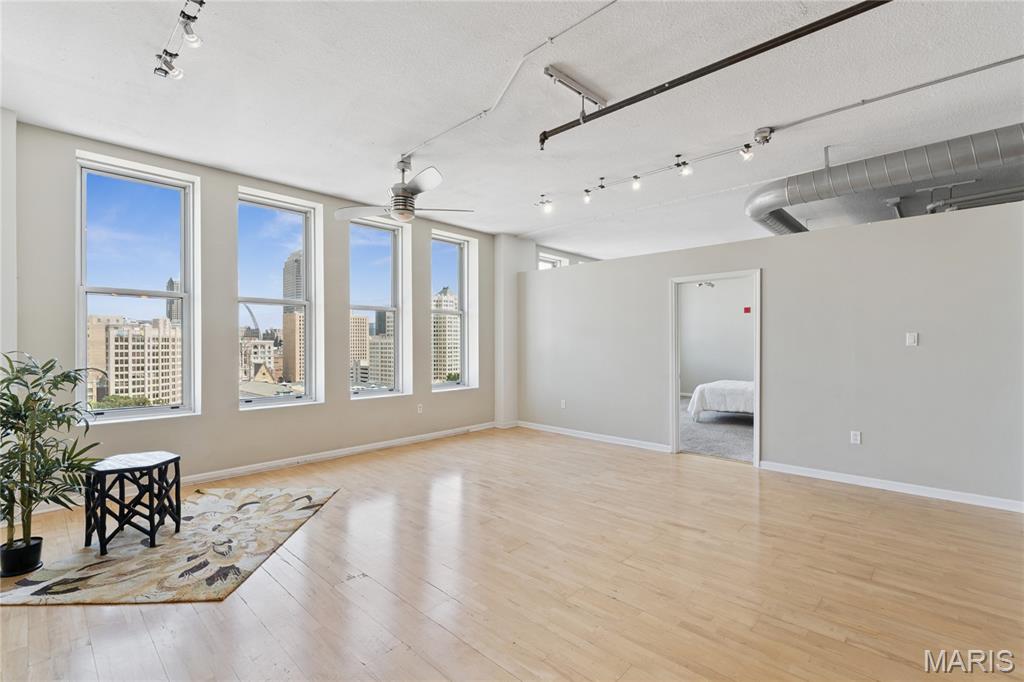 Experience true city living in this stylish 2 bed, 2 bath loft featuring unobstructed, jaw-dropping views of Downtown St. Louis and the Gateway Arch right from your windows. Oversized windows in the living room and primary suite frame panoramic skyline views and flood the space with natural light. The open-concept layout showcases soaring ceilings, exposed ductwork, and authentic loft character. The primary suite offers a full en suite bath and incredible city vistas, while the second full bath provides flexibility for guests or roommates. New water source heat pump installed March 2025. Secured building access and one deeded interior garage parking space included. Located in the historic Terra Cotta Lofts (built 1917) in the heart of downtown with walkability to CITYPARK (home of St. Louis City SC), Busch Stadium, Ballpark Village, Citygarden, Washington Avenue dining and nightlife, and the iconic Gateway Arch. Skyline views, walkable entertainment, and true downtown energy—live above it all.