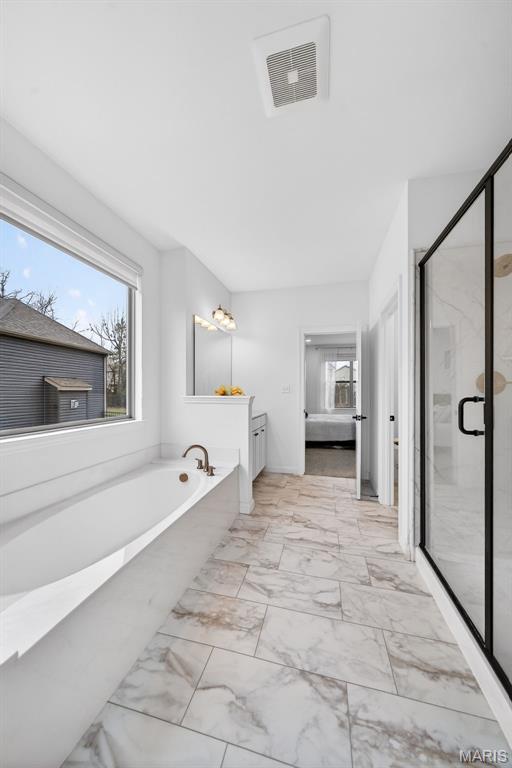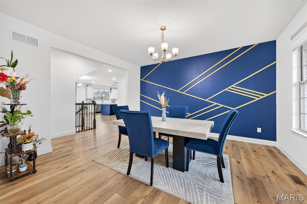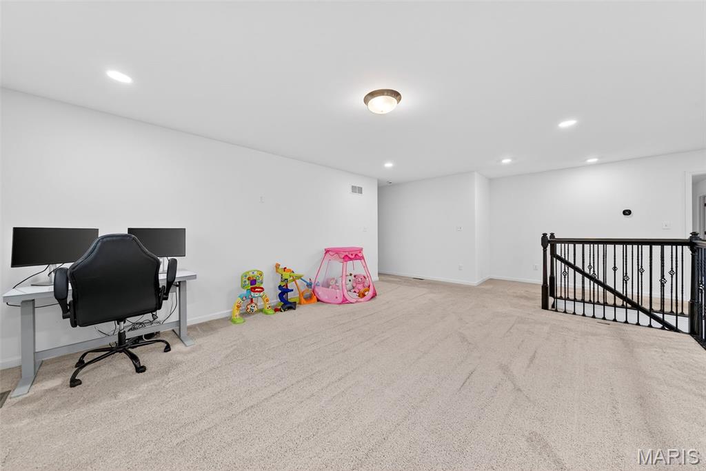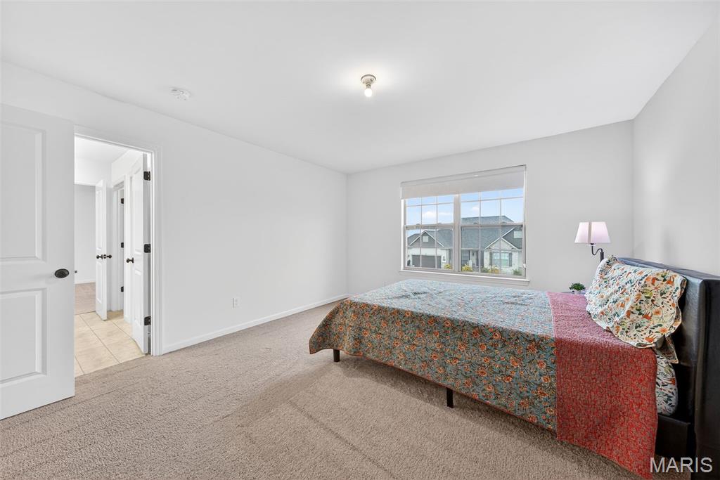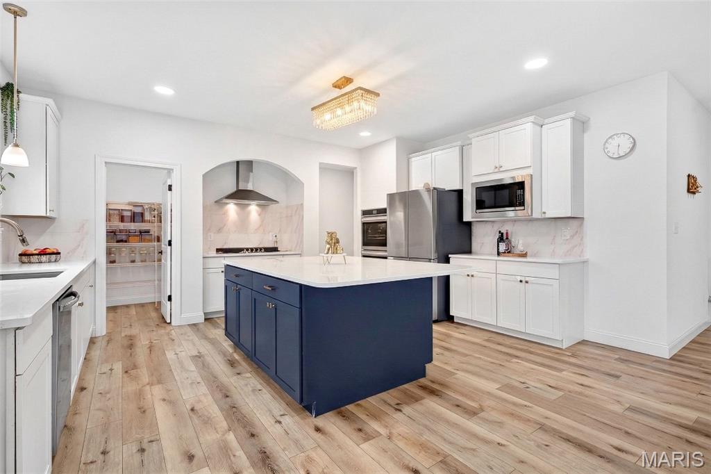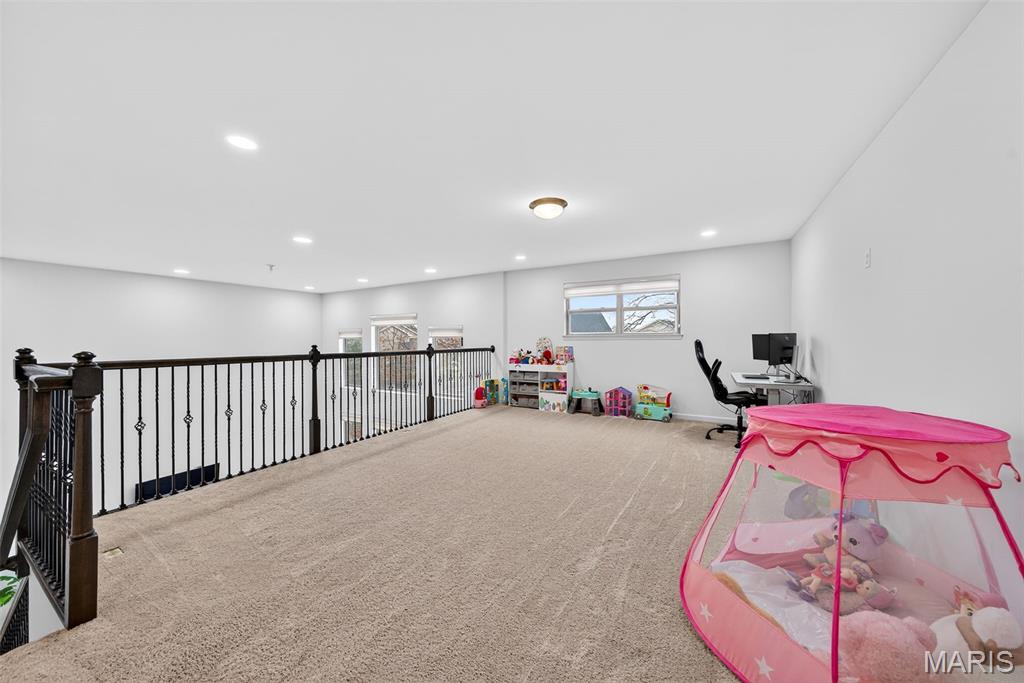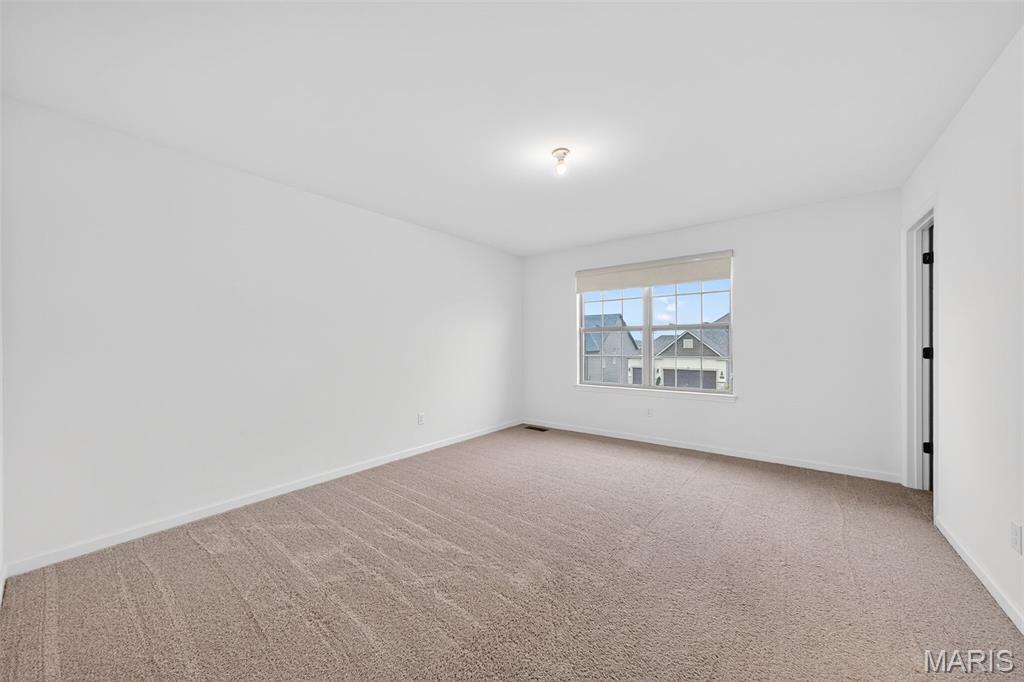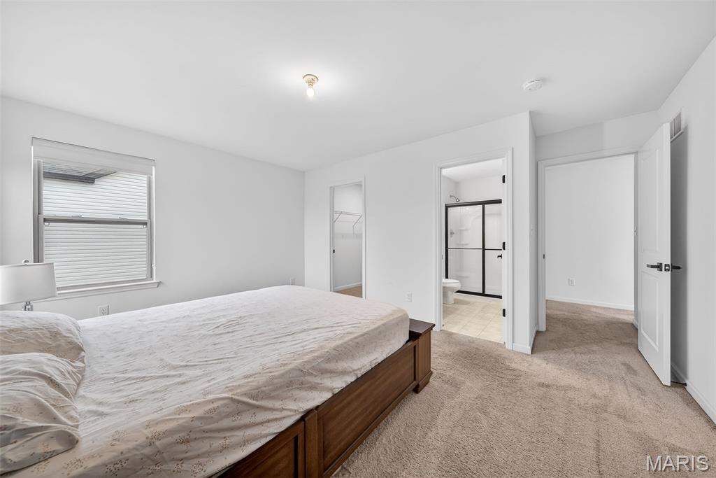Welcome to this stunning 4-bedroom, 3.5-bathroom 1.5-story home offering luxurious finishes, an open floor plan, and exceptional design throughout. Featuring a beautiful east-facing brick elevation and impressive 9-foot front door, this home makes a striking first impression. The breathtaking two-story great room is filled with natural light, recessed lighting, and remote-controlled solar-powered blinds. The open-concept layout seamlessly connects the great room, breakfast room, and kitchen, creating the perfect space for everyday living and entertaining. The gourmet kitchen is a showstopper with an oversized center island topped with Quartz countertops, stainless steel appliances, double ovens, a 5-burner gas cooktop with range hood, and a refrigerator that stays. The adjoining breakfast room features a dramatic 9-foot sliding door that opens to the backyard. Retreat to the main-floor primary suite offers a peaceful retreat, complete with a spa-like bath featuring dual vanities, a soaking tub, separate shower, and a massive walk-in closet. A formal dining room with a stylish accent wall provides the perfect setting for special gatherings, while the main-floor laundry and powder room add everyday convenience. Upstairs you’ll find three spacious bedrooms, all with private bath access, plus a versatile loft overlooking the great room. The unfinished lower level offers incredible opportunity for future expansion with 9-foot ceilings, egress windows, and a bath rough-in, allowing you to create the space that fits your lifestyle. Additional highlights include dual HVAC systems, a water softener that stays, an oversized 3-car garage, and a level backyard. Located in a vibrant community with a pool, playgrounds, scenic walking trails, and ponds, this home is also part of the highly rated Wentzville (Liberty) School District and just minutes from highways, shopping, and dining. This is more than a home—it’s a place designed for living beautifully.