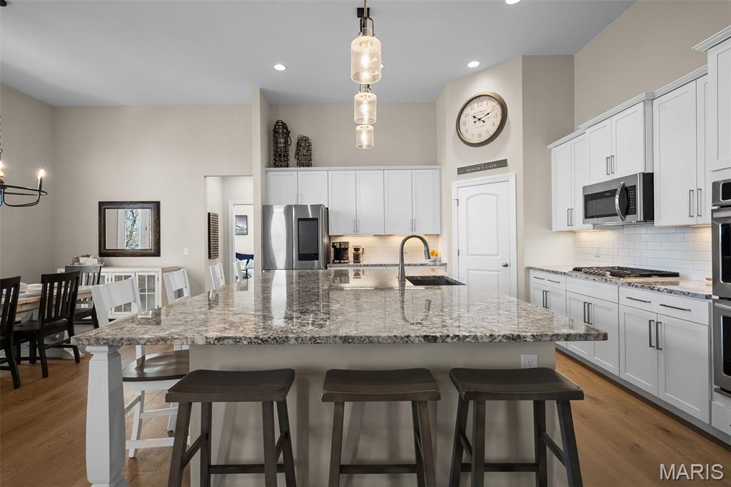 NOW OFFERED UNDER $1M in the highly sought-after Pevely Farms community. Experience the ease of newer custom construction without the wait in this exceptional 4-year-old 1.5-story home, ideally situated within the desirable gated Pevely Farms golf course community. Now offered at an incredible value, this 5-bedroom, 3.5-bath residence delivers 3,766 square feet of refined living space on over an acre of picturesque property. The main level showcases an impressive vaulted great room anchored by a striking custom floor-to-ceiling fireplace wall, creating both warmth and architectural drama. Just beyond, the chef’s kitchen stuns with 12-foot ceilings, granite countertops, high-end appliances, an expansive 80” x 120” island designed for gathering, and a spacious walk-in pantry. Hardwood flooring flows throughout the primary living areas, enhancing the home’s elevated yet welcoming feel. Designed for both comfort and convenience, the main-floor primary suite offers a private retreat with a spa-inspired bath featuring a separate soaking tub and shower, along with a custom-designed closet. A fifth bedroom on the main level provides flexibility for a dedicated office or guest space, complemented by a mudroom and additional workspace nook off the garage. Outdoor living is equally inviting, with a maintenance free deck overlooking a level, fenced backyard that transitions beautifully to wooded privacy. An irrigation system, zoned HVAC, and a 3-car side-entry garage add modern comfort and everyday functionality. Set within one of the area’s most sought-after communities, surrounded by luxury homes recently selling above $1M, this property represents a rare opportunity to own newer construction with high-end finishes in Pevely Farms at a compelling value.