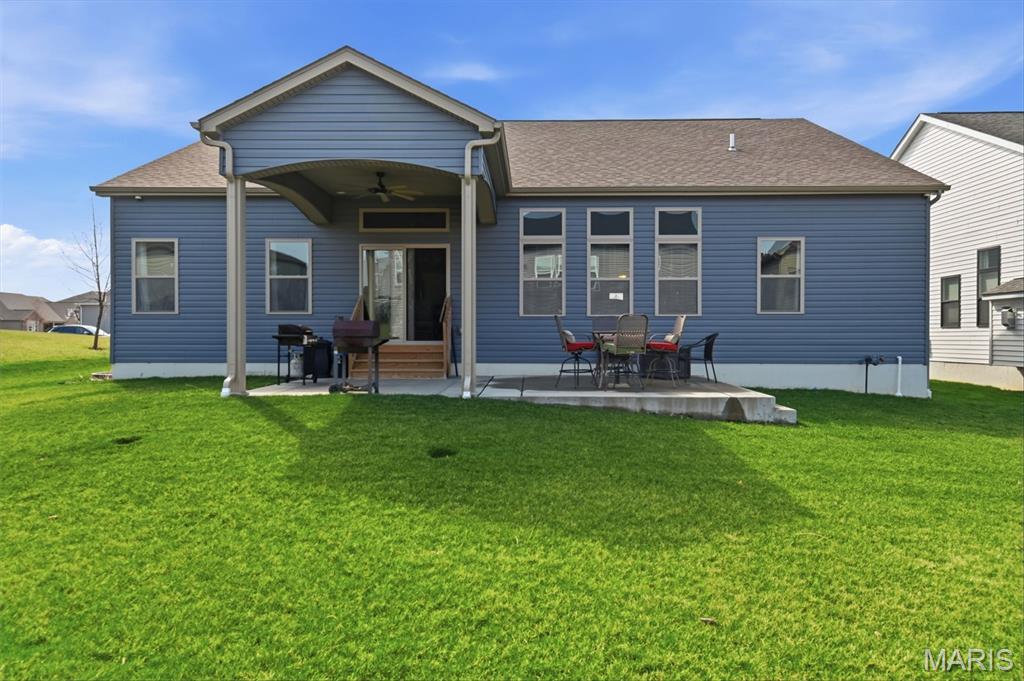 Don't miss this one! Beautifully maintained 3-bedroom ranch plus a Flex room for a home office or formal dining room, and 2.5 baths, presents an expansive open floor plan that displays impeccable craftmanship and creates effortless flow for everyday living and entertaining. Rich hardwood flooring flows through the main living areas, while the kitchen, great room, and breakfast room feature soaring 10' ceilings, arched doorways, recessed lighting, and expansive windows that fill the home with natural light. The thoughtfully appointed kitchen offers designer finishes with custom staggered cabinetry, granite counters, black stainless appliances with a gas range, a large center island, and walk-in pantry. A desirable split-bedroom floor plan offers privacy, with a spacious primary suite featuring a walk-in closet, dual vanities, and separate shower. Bedrooms 2 and 3 share a convenient Jack & Jill bath. Unfinished lower level has a finished ceiling, electric pre-wired for finish, bath rough-in, and egress window—making it easy to complete and create the additional living space you’ve been dreaming of. Outdoors, the professionally landscaped yard with irrigation creates a private retreat featuring a 14' x 24' partially covered architectural patio, perfect for relaxing or entertaining. An 8-camera outdoor security system provides added peace of mind. With over 100K in extensive upgrades and thoughtful finishes already in place, this beautifully maintained home offers the benefits of new construction—without the wait, added expense, or extra assessments—built with the quality and craftsmanship of Lombardo Homes just five years ago. Amenities of Shady Creek include neighborhood Pool and Lazy River, Playgrounds, Walking Trails with Water Views, Pickleball and Basketball Court and Sand Volleyball. Why go anywhere else.