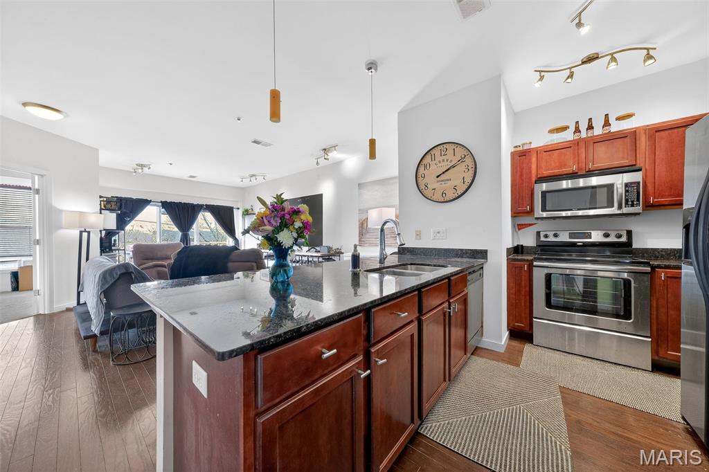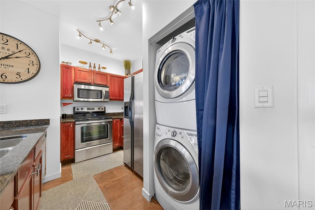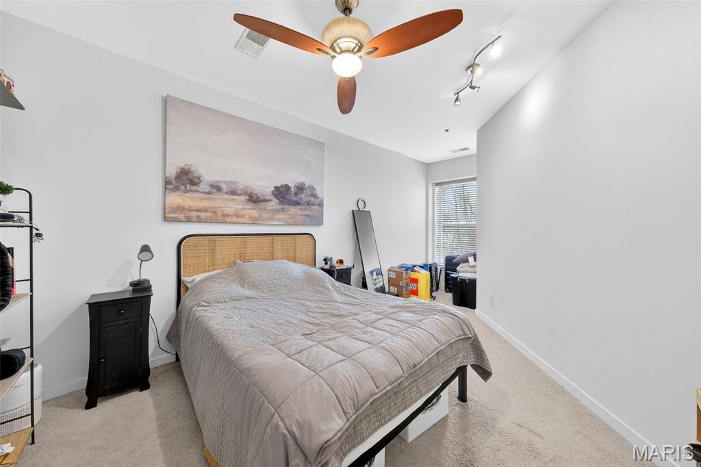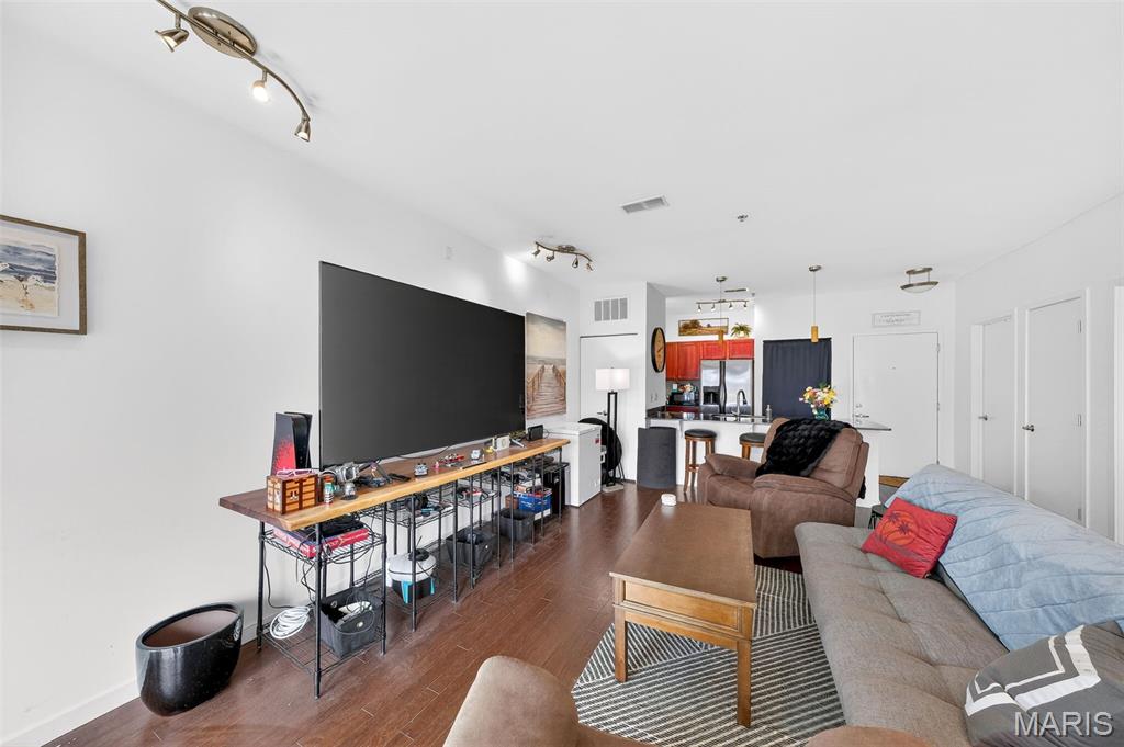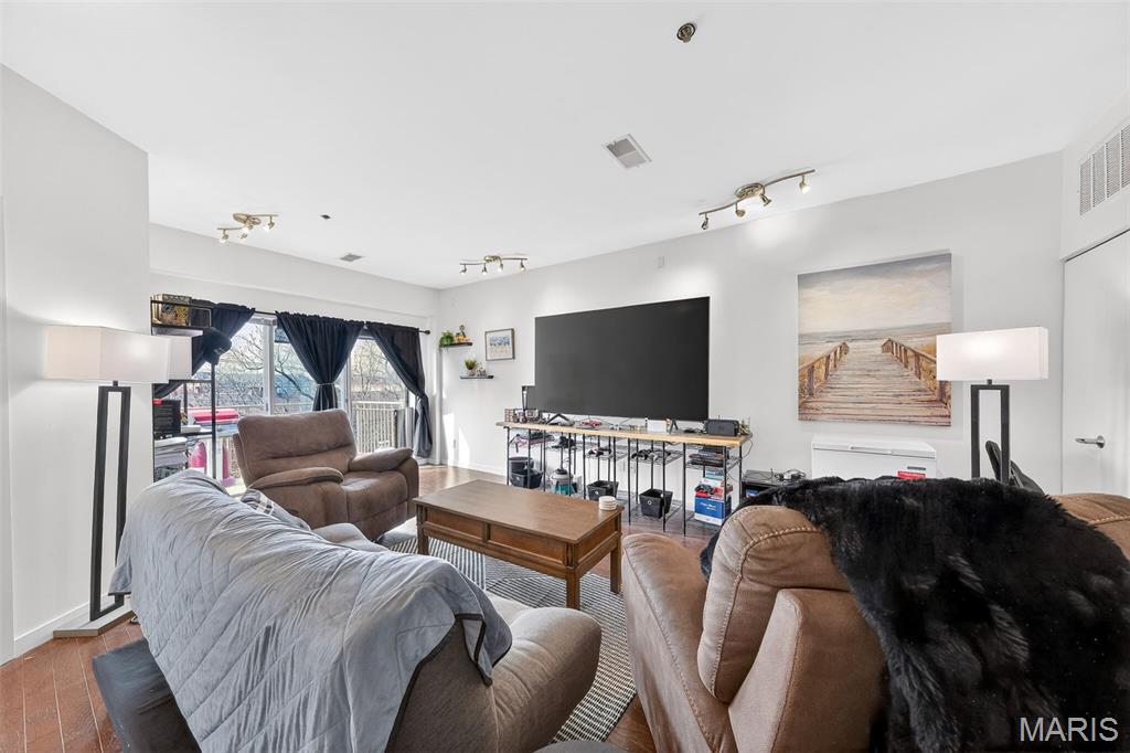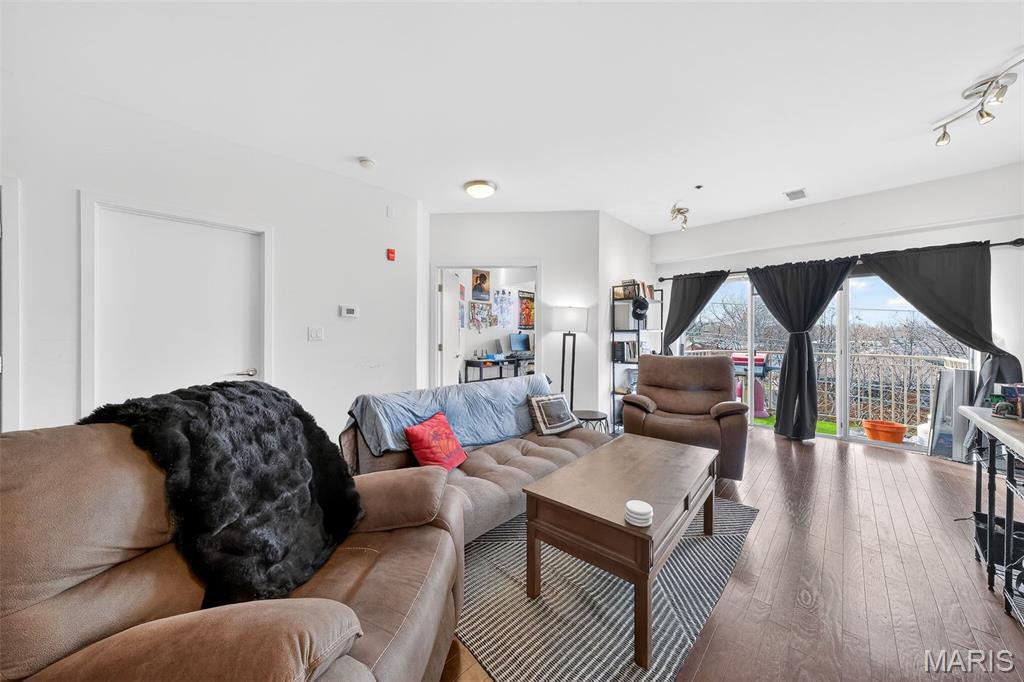 Beautiful Loop Condo! Enjoy the best of walkable Loop living in this bright and stylish upper-level condo. Just steps from Mi Ranchito, Salt & Smoke, Fitz’s, and all the vibrant dining, shopping, and entertainment the Delmar Loop is known for. Convenient access to MetroLink and Washington University adds to the unbeatable location. Inside, you’ll find an open and airy living/dining area with gleaming hardwood floors and abundant natural light. The modern kitchen features solid countertops, a generous breakfast bar, stainless steel appliances, and an in-unit washer and dryer. A private 9x5 balcony extends your living space outdoors. The spacious primary bedroom includes a large walk-in closet. Additional highlights include gated, secure parking with one covered space, a private storage closet in the garage, visitor parking, elevator access, and a beautifully maintained brick exterior with landscaped grounds. Currently tenant-occupied through mid-June 2026.