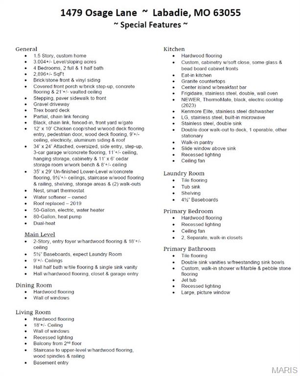 Country living in Labadie/Eastern Franklin County! Charming CUSTOM 1.5 story home nestled on 3+/- level/sloping acres providing peace & tranquility with a chicken coop. Bring your chickens! 2,896+/- SqFt, 4 bedroom, 2 full & 1 half bath home. Hardwood flooring throughout most of home. Covered front porch & 2-story entry greets you as you step inside. Living room features an 18’ ceiling w/balcony from 2nd floor, recessed lighting & a wall of windows allowing plenty of natural light & stunning views of the property. Eat-in kitchen flaunts custom cabinetry, granite counters, center island, stainless steel appliances, walk-in pantry & walk-out to a private deck surrounded by trees. Main level primary suite boasts 2 walk-in closets, recessed lighting and updated bath with double sink vanities w/freestanding sink bowls, custom walk-in shower w/Marble & pebble stone flooring, jet tub and large picture window with the seclusion of trees surrounding. Completing the main level living space is a dining room, laundry room and a half bath. Upper level extends living quarters with a family room that overlooks the Living room, 3 additional bedrooms with slide closets & share hall full bath. Unfinished, walk-out, lower-level has great potential for additional living space just awaiting your finishing touches w/9’+/- ceilings & tub sink. Outside, you will enjoy an AWESOME level, fenced-in front yard & a 3-car, side entry, oversized attached garage. Within the Washington School District, easy access to Highway 100/Manchester Road & minutes to shopping, dining & amenities. MUST SEE!