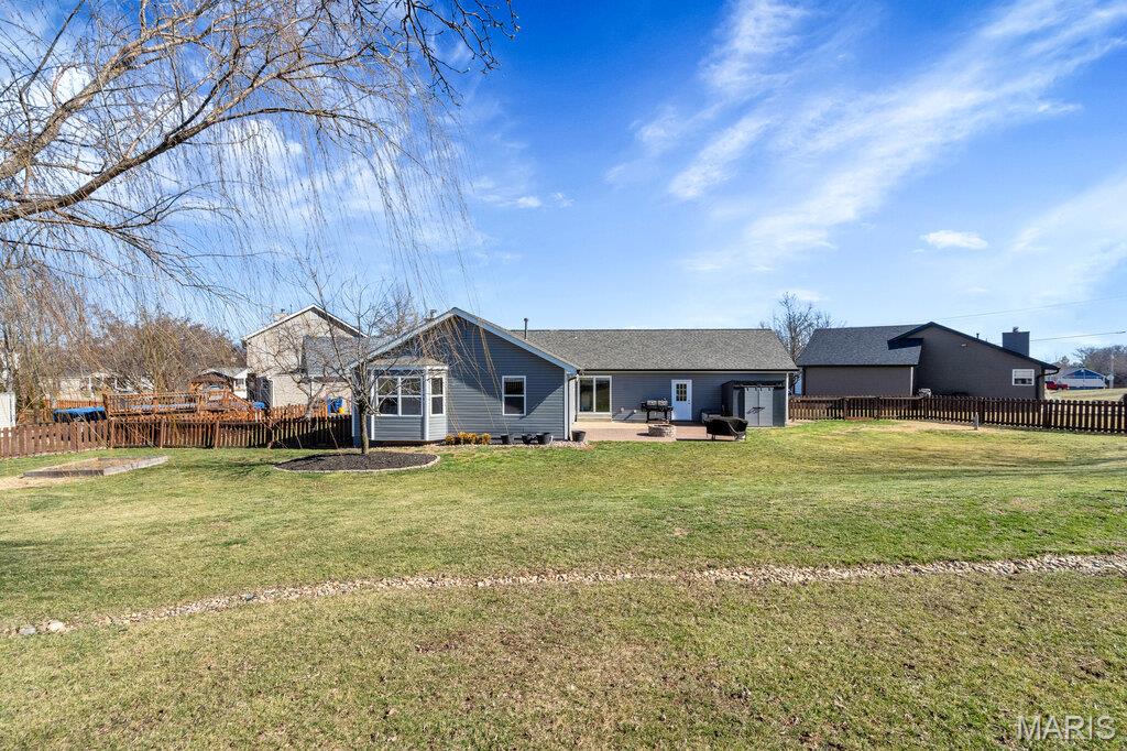 Welcome to Peine Ridge – This modern 3 bed, 2 bath ranch offers thoughtful design, abundant natural light, and a layout built for everyday living and entertaining. Nestled at the end of a quiet cul-de-sac, this home benefits from reduced through-traffic, enhanced privacy, and expansive backyard —ideal for outdoor enjoyment and gatherings. The main level showcases large bay windows that flood the home with natural light and create an open, inviting feel throughout. Consistent flooring spans the entire main floor, offering a seamless flow from room to room. The kitchen is equipped with all black stainless-steel appliances and opens comfortably into the primary living space, anchored by a corner fireplace for warmth and ambiance. Main floor laundry room adds practical convenience. The finished lower level expands your living and entertainment options substantially. A second vent-less gas fireplace enhances the lower gathering area, with dining space and wet bar, making it well suited for hosting, while the dedicated home theater—wired for surround sound with tiered theater seating—creates a true cinematic experience. A bonus room provides ample space for a home office, craft or playroom. Exterior features include a generously fenced backyard, a lawn and garden enthusiast’s dream, providing ample room for recreation and pets. The 3-car garage offers ample space for storage, workshop, home gym and parking capacity. Public water and sewer service the home. Average utility costs are approximately $160 per month. Recent exterior improvements include a new roof, siding, and gutters installed in 2024—offering long-term durability and added peace of mind. A well-positioned ranch with a finished lower level designed for gathering, situated in a desirable Wentzville location. We welcome you to join us during an Open House Sunday March 8th, 2:00p-4:00p.