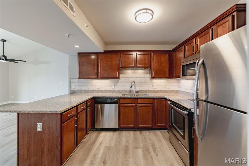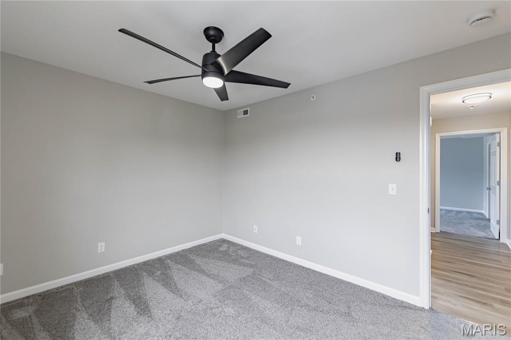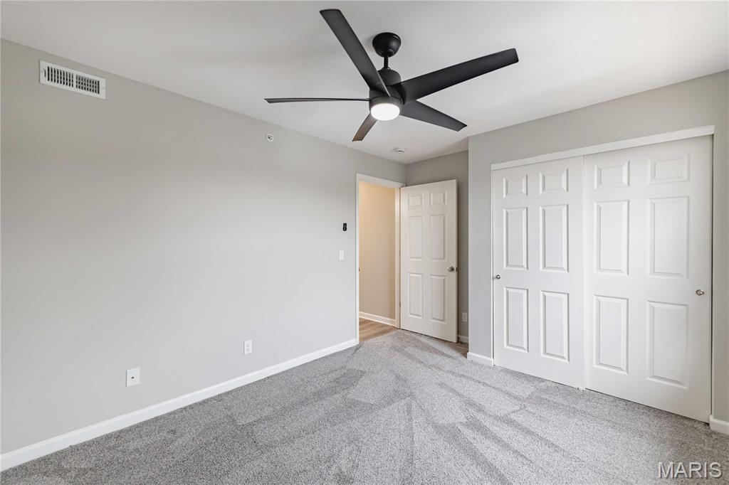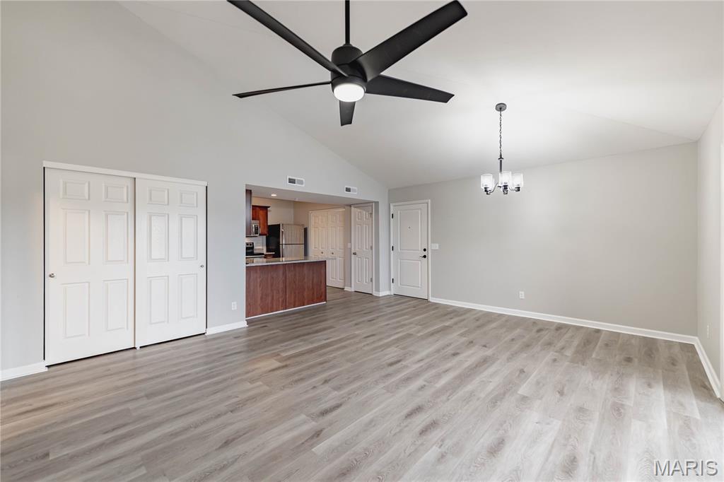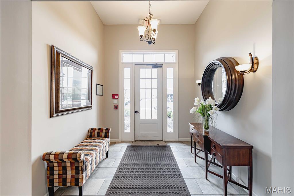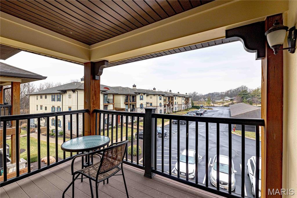 Welcome to this beautifully maintained 2-bedroom, 2-bathroom TOP FLOOR MOVE IN READY condo in the desirable Bordeaux Condominiums, perfectly positioned with peaceful wooded views and direct access to nearby walking trails leading to Woodlands Park. Community offers a pet-friendly walking trail with a lighted pond. Offering a blend of comfort, style, and low-maintenance living, this home is ideal for those seeking both convenience and charm in the heart of Cottleville, the highly sought-after area in St. Charles County. Step inside through the secure, climate-controlled building entrance with keypad access and discover a bright, inviting interior with luxury vinyl plank flooring throughout the main living areas, and abundant natural light filling the spacious great room throughout the day. Custom lighting throughout and new ceiling fans will keep you comfortable and cool. The open layout creates the perfect setting for relaxed living. The well-appointed kitchen is a standout feature, offering stainless steel appliances, a smooth-top electric range with built-in microwave, refrigerator, granite countertops, under cabinet lighting, a breakfast bar, and a large pantry—providing both style and functionality for everyday living. The primary suite with new carpeting serves as a comfortable retreat with a generous walk-in closet and a beautifully updated en-suite bath and oversized vanity. The second bedroom is spacious and has new carpeting. The second full bathroom has also been tastefully updated. Enjoy the convenience of a private laundry room with large enough for a full-size washer and dryer located just off the kitchen. Step through sliding doors onto your covered composite deck complete with locking storage, creating the perfect space to relax and unwind. The HOA provides exceptional value, covering water, sewer, trash, exterior maintenance, building insurance, landscaping, snow removal, and parking lot upkeep, allowing you to enjoy a truly low-maintenance lifestyle. Plenty of open free parking with option to purchase covered parking. No elevator. Located just minutes from shopping, dining, parks, community college, and major highways (364/94, 70, and 40/61), this condo offers the perfect balance of peaceful surroundings and everyday convenience. This move-in-ready condo combines modern updates, scenic surroundings, and an unbeatable location—schedule your showing today and make it yours!