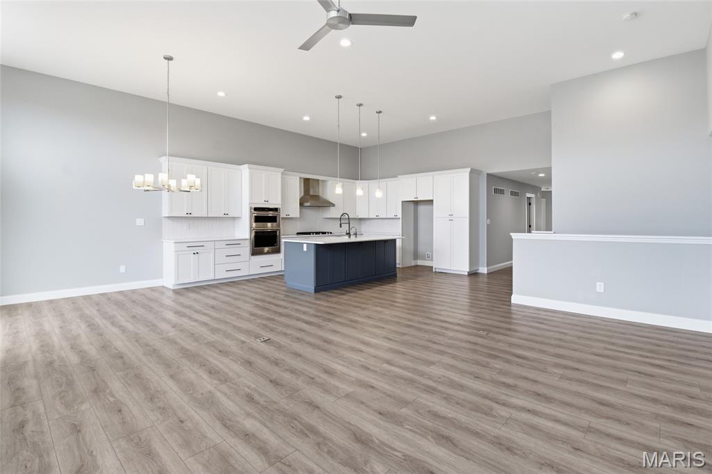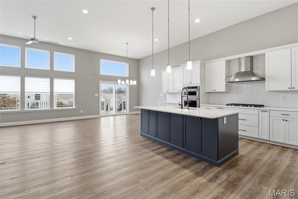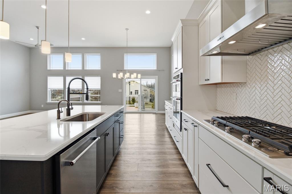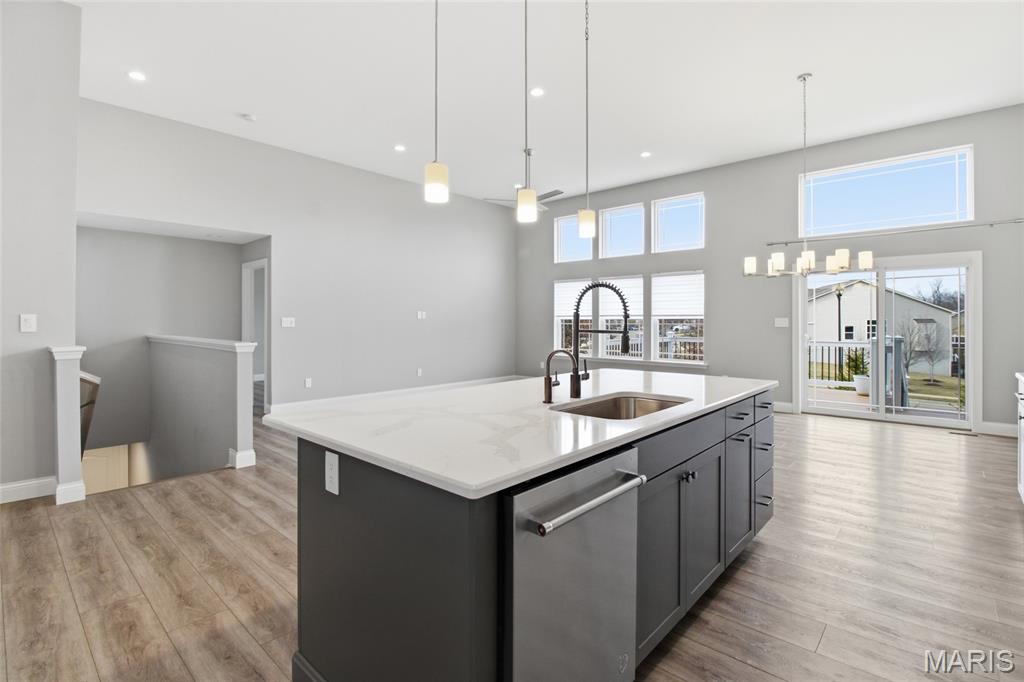 This beautifully designed 3-bedroom, 2-bath single story home offers nearly 1900 sq. ft. on the main level alone, showcasing modern luxury and effortless living. Soaring 12' ceilings in the kitchen, dining area, and great room create an airy, open feel. The white gourmet kitchen is a chef’s dream—featuring Quartz countertops, a large island with bar seating, gas range with stainless hood, wall micro-oven combo, and an instant hot water dispenser! The spacious primary suite boasts a walk-in closet with custom organization, a gorgeous bath featuring double sinks and a safe, universal frameless no-curb shower which makes cleaning easier and adds a sleek, seamless vibe. Enjoy luxury vinyl plank flooring and 5.25" baseboards throughout. Main floor laundry adds convenience, while the walk-out lower level provides potential to add up to an additional 1800 sq.ft of living space. Due to the walkout and additional windows, the lower level provides the perfect opportunity to design a bright, vibrant usable living space specifically for the needs and lifestyle of you and your family, offering an inviting & open feel, plus direct outdoor access! Rough in plumbing for a full bath & wet bar are already installed for your convenience! Step outside to a brand-new high-end PVC deck with stairs and custom lighting—a perfect backdrop for entertaining. All nestled on an always desirable peaceful cul-de-sac with a 2-car garage and access to walking trails. This home is move-in ready and built for comfort and style! Available for a quick closing at an amazing price!
