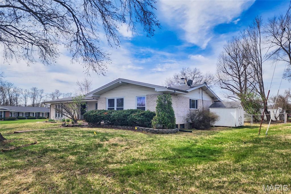 One of the largest 3-bedroom, 2-bath ranches in Paddock Meadows — move-in ready and City of Florissant code-approved. A covered front porch and double-entry doors lead to a foyer and gleaming hardwood floors throughout. Bright living room with large picture windows, formal dining room with crystal chandelier, and an eat-in kitchen with oak cabinets and appliances. A cozy breakfast spot at the kitchen window is perfect for birdwatching with your morning coffee. Spacious family room features a wood-burning fireplace and sliding doors to a large covered patio. Primary bedroom with full bath. Partially finished basement offers built-in closets, abundant storage, and flexible space for your plans. Oversized 2-car attached garage and a fenced corner lot.